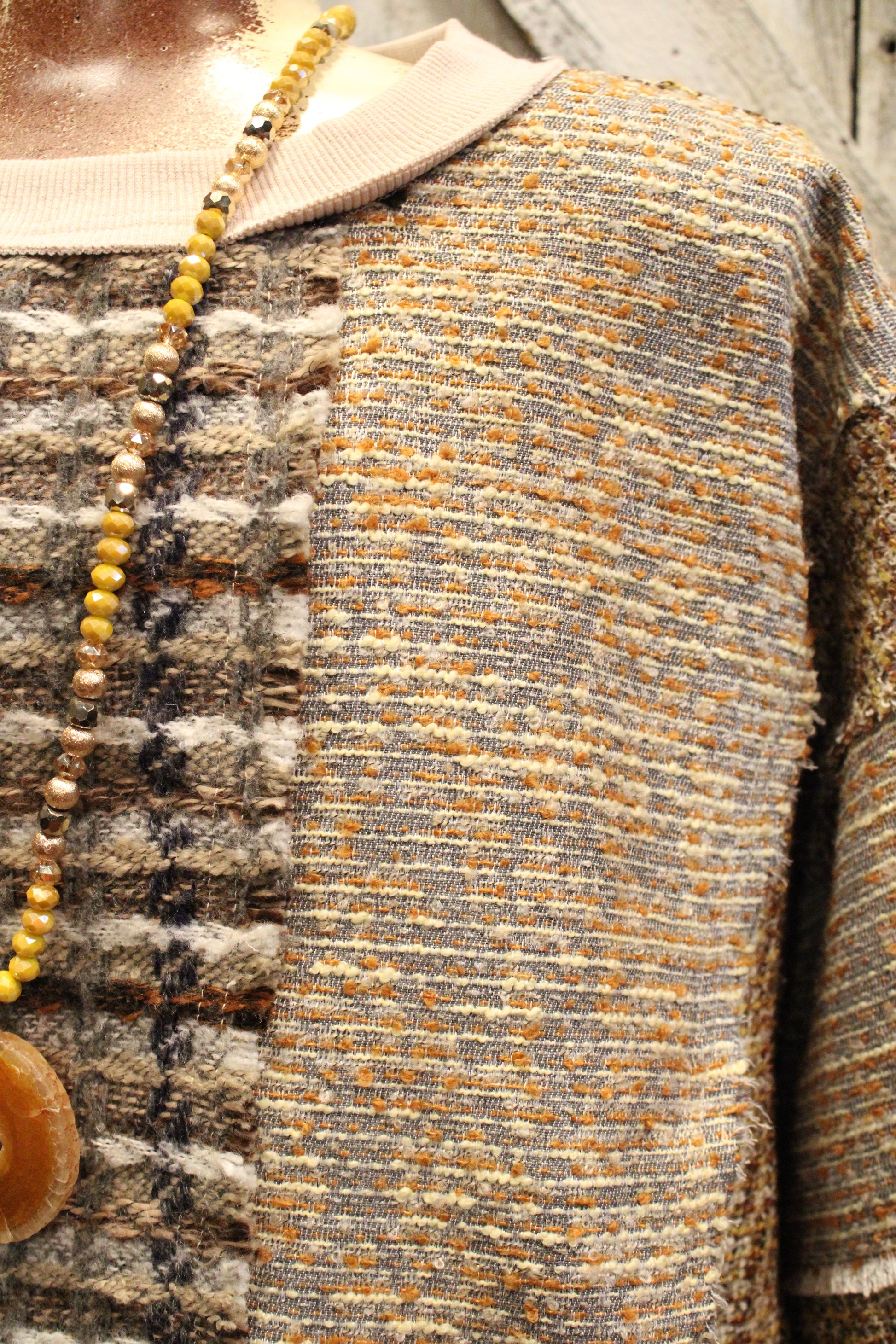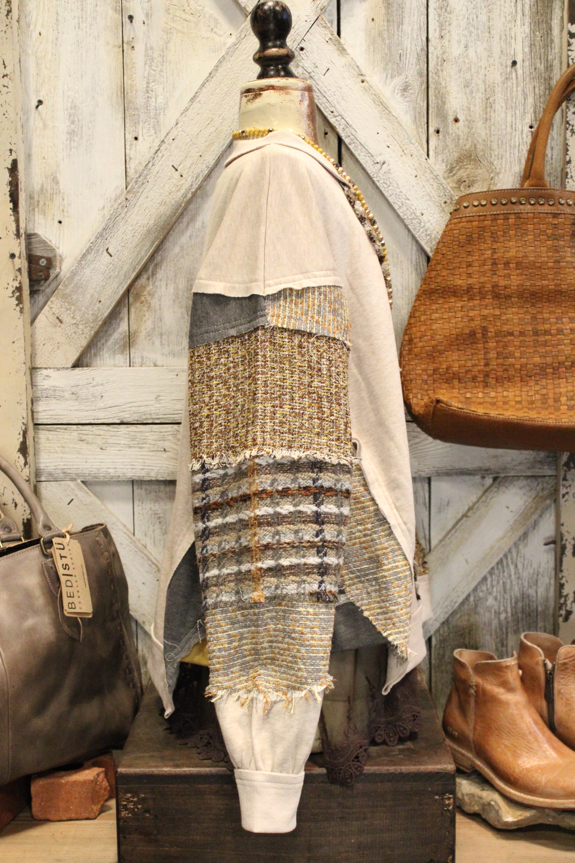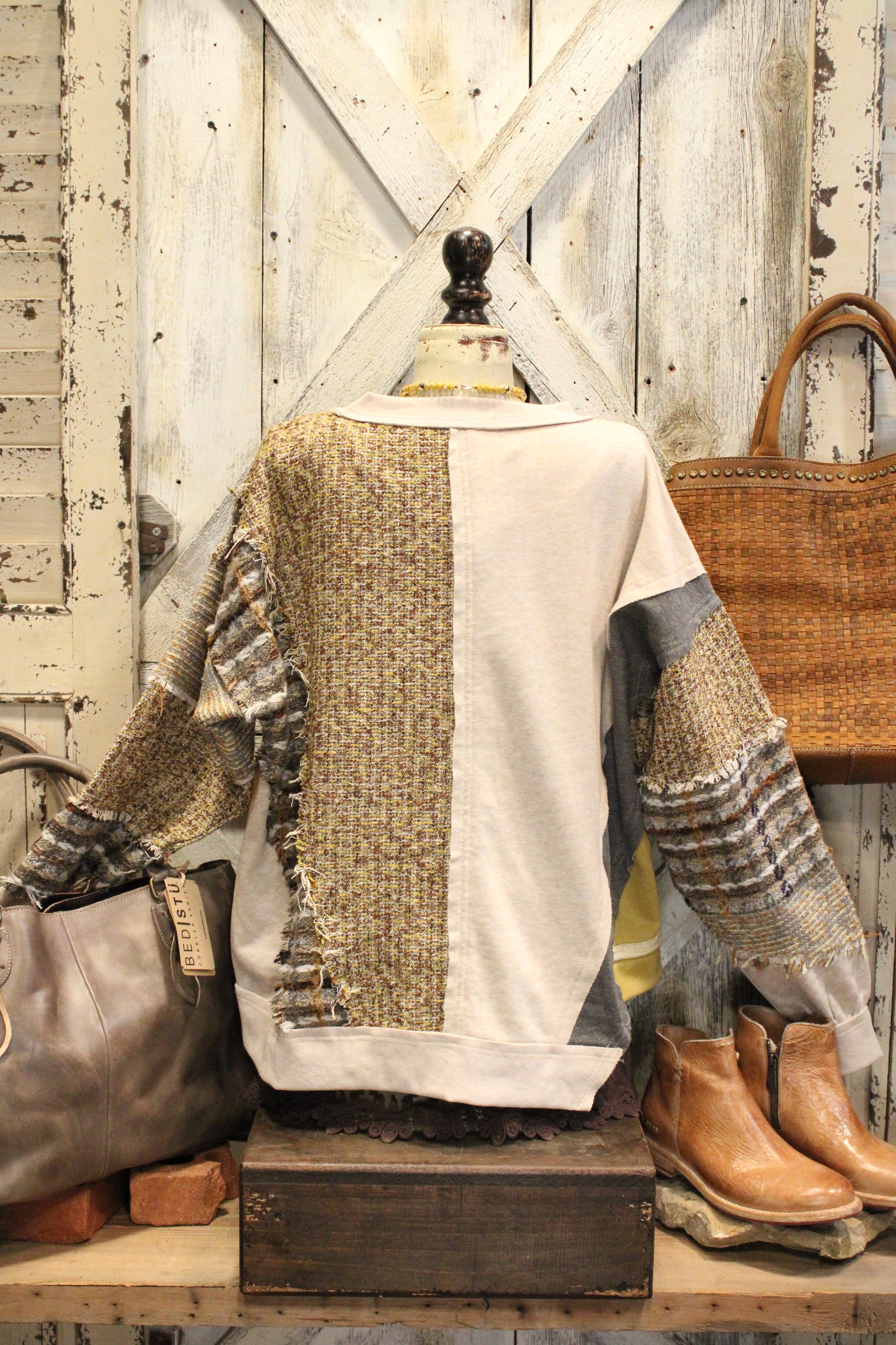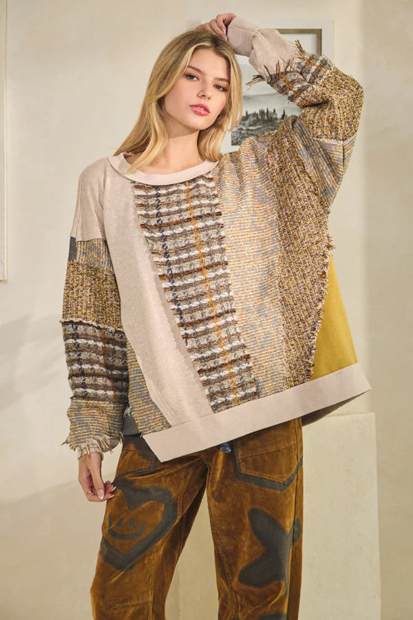 Introducing the A Cut Above Sweatshirt- A cozy piece with vintage soul, this sweater brings together texture, warmth, and creative flair. This relaxed-fit sweater features a unique patchwork design combining boucle knits, textured weaves, and soft cotton panels in earthy shades of oat, mustard, and charcoal.