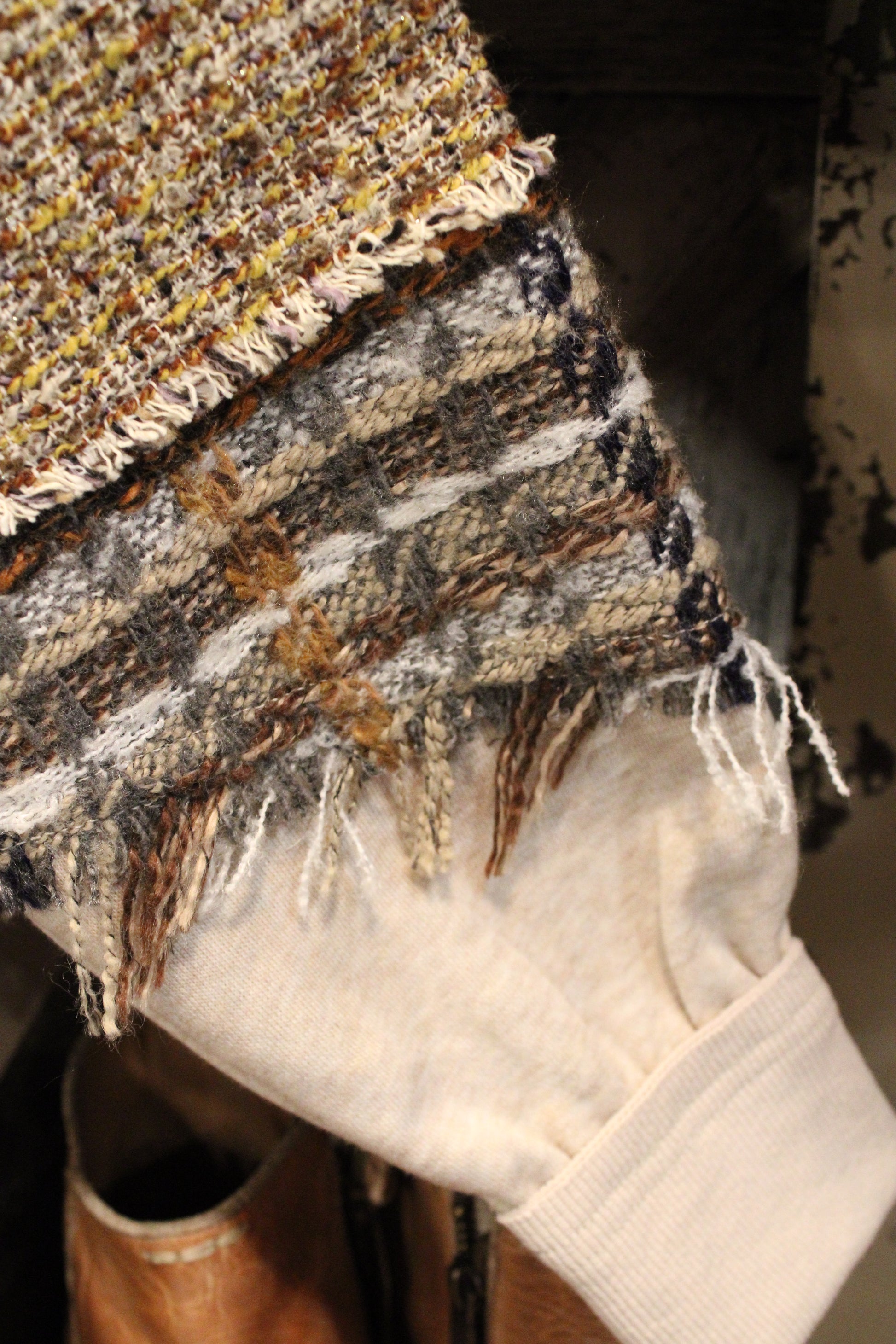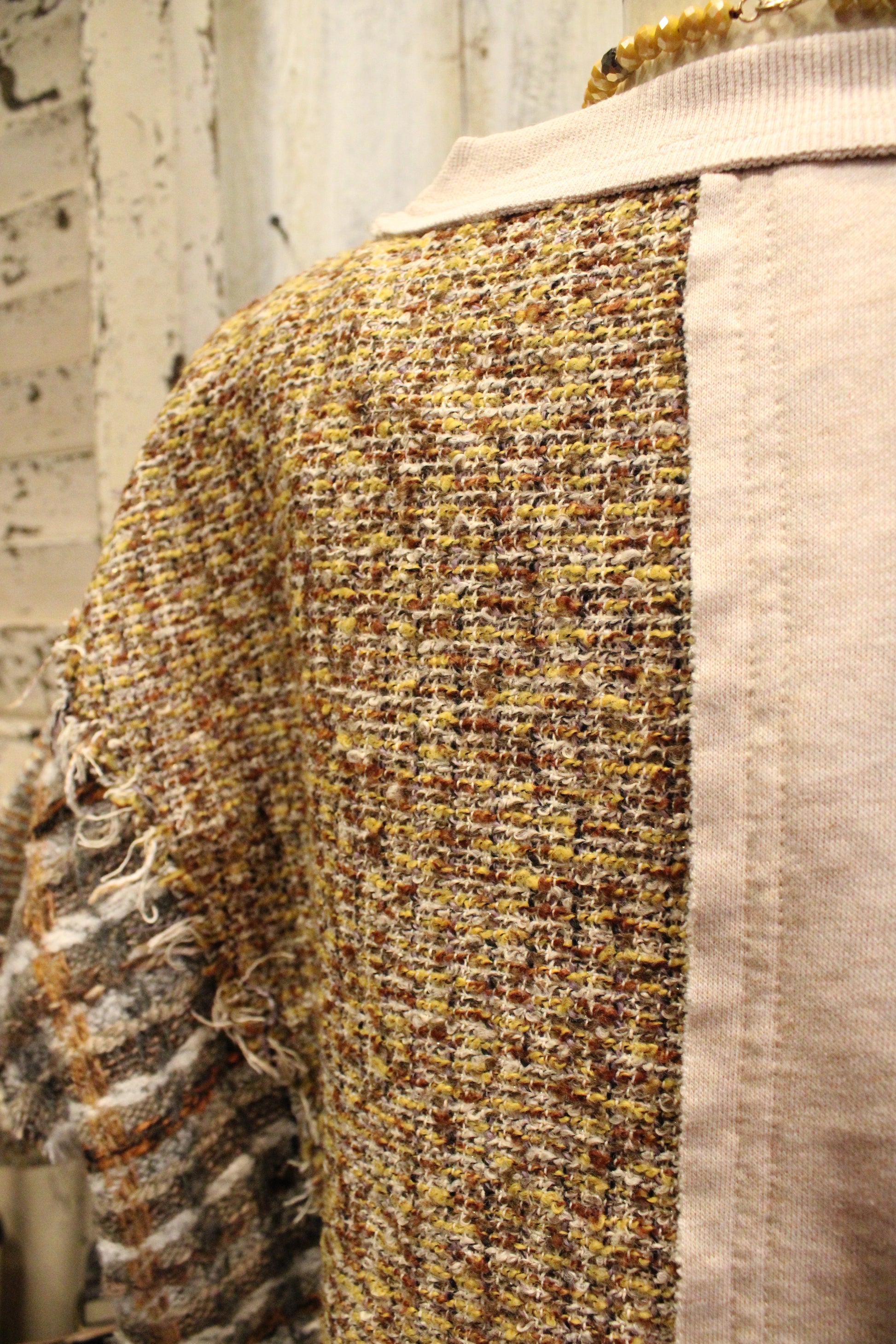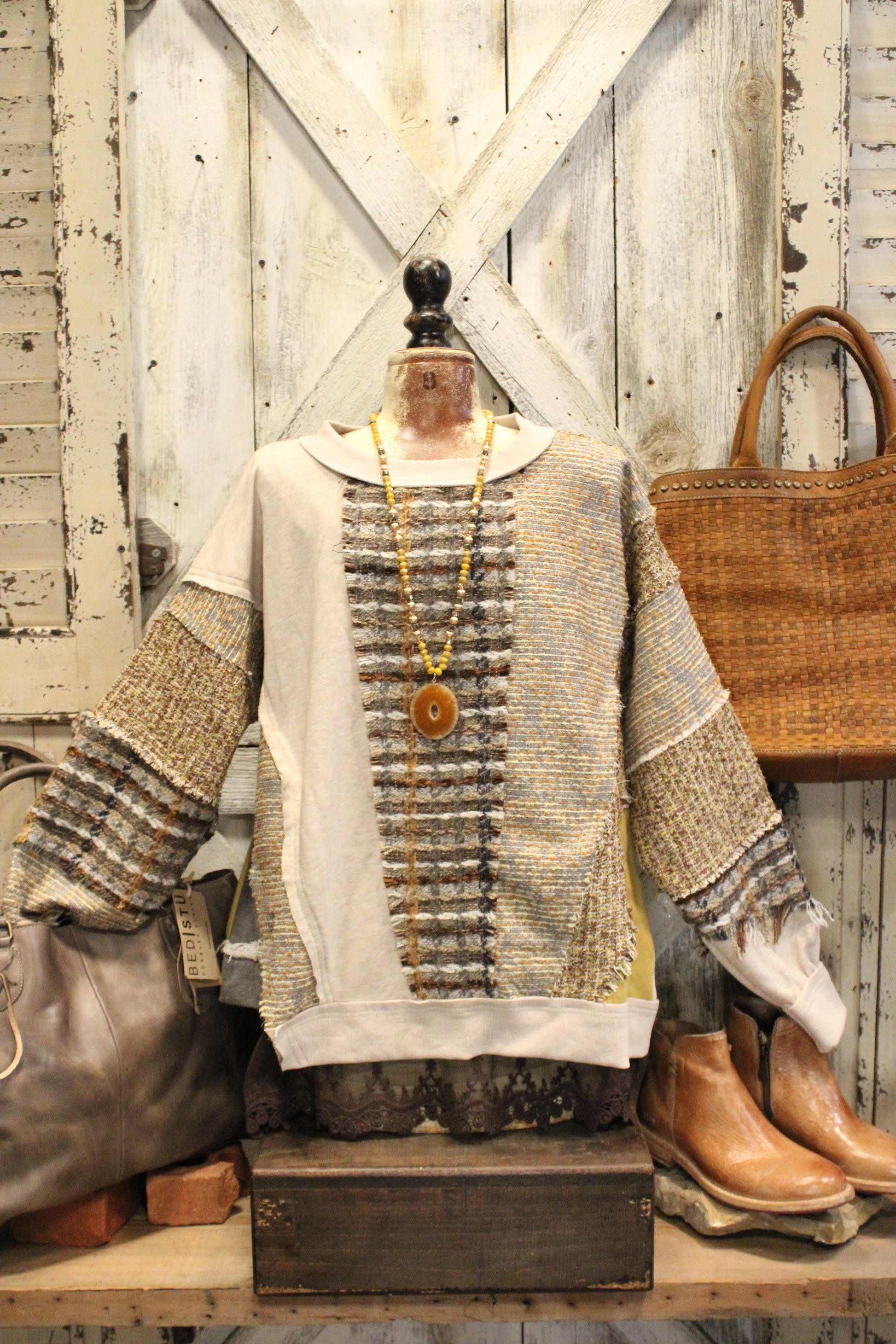 Introducing the A Cut Above Sweatshirt- A cozy piece with vintage soul, this sweater brings together texture, warmth, and creative flair. This relaxed-fit sweater features a unique patchwork design combining boucle knits, textured weaves, and soft cotton panels in earthy shades of oat, mustard, and charcoal.