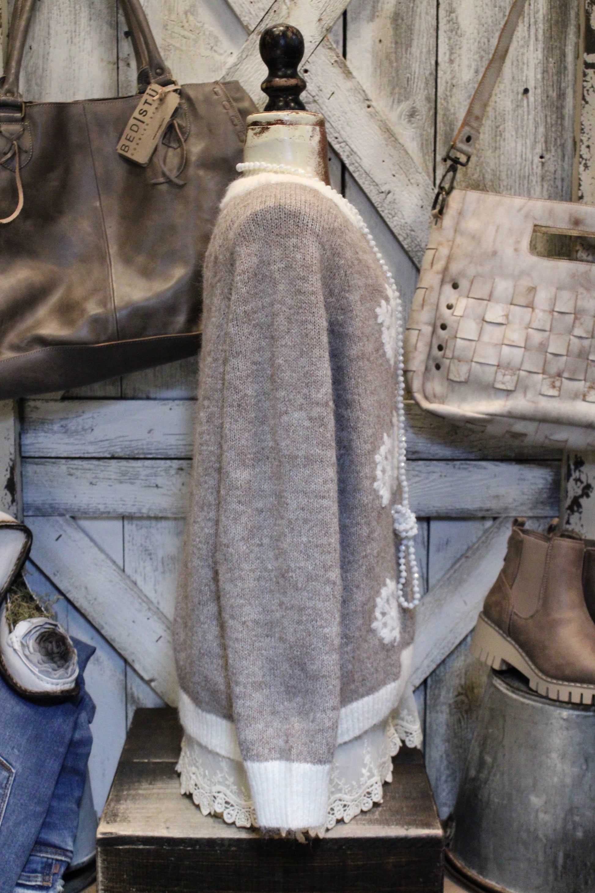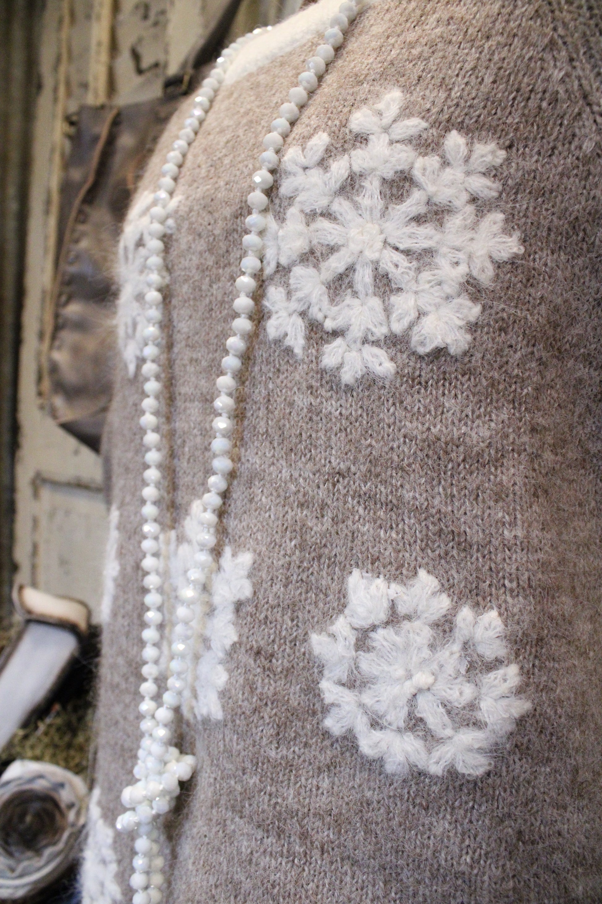 Get cozy and stylish this season with our Frosted Flurries Sweater- This plush knit beauty captures all the cozy charm of winter with its soft neutral hue and darling 3D snowflake details that make it feel oh-so-special. The creamy ribbed neckline adds a touch of contrast while keeping the look classic and timeless.