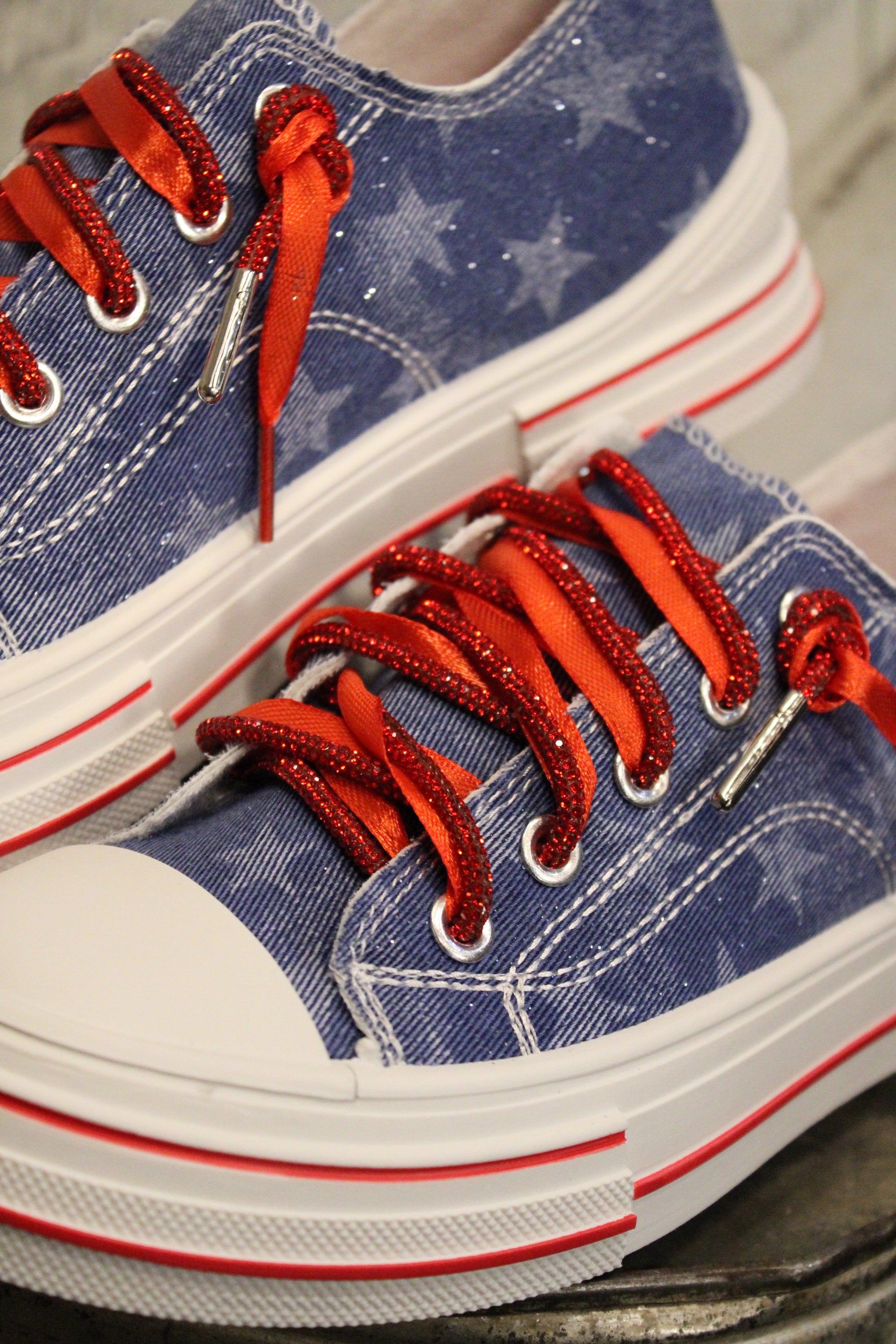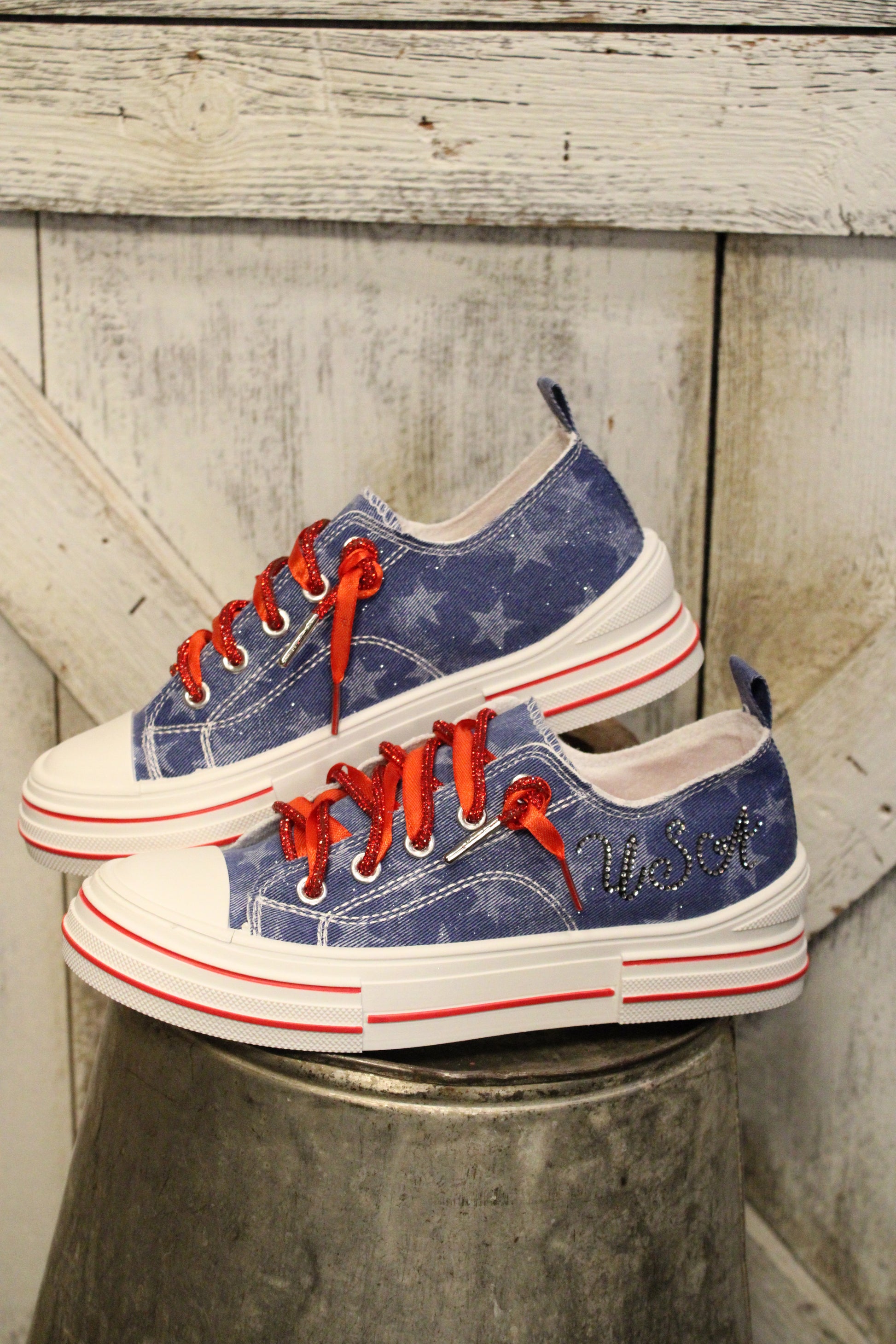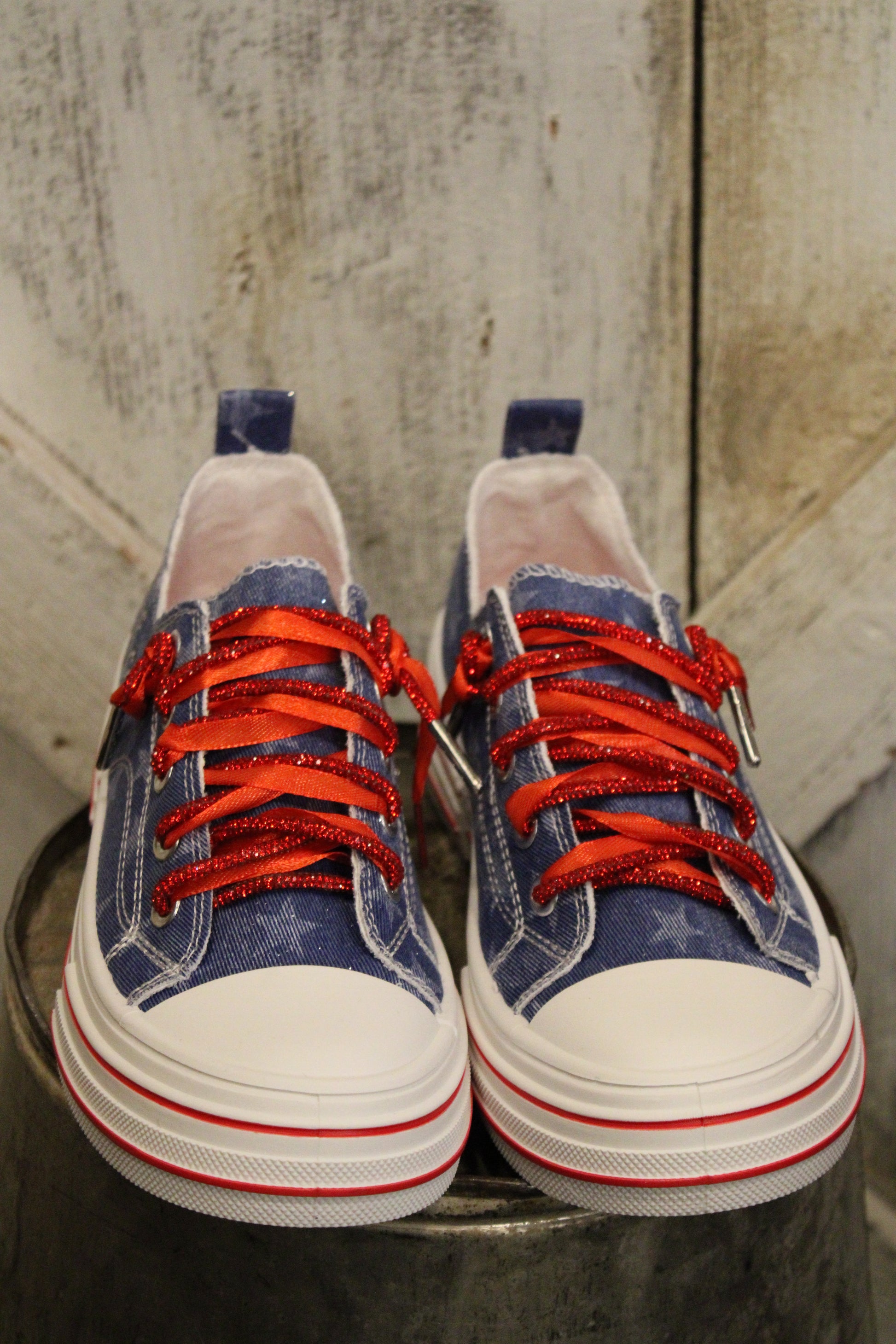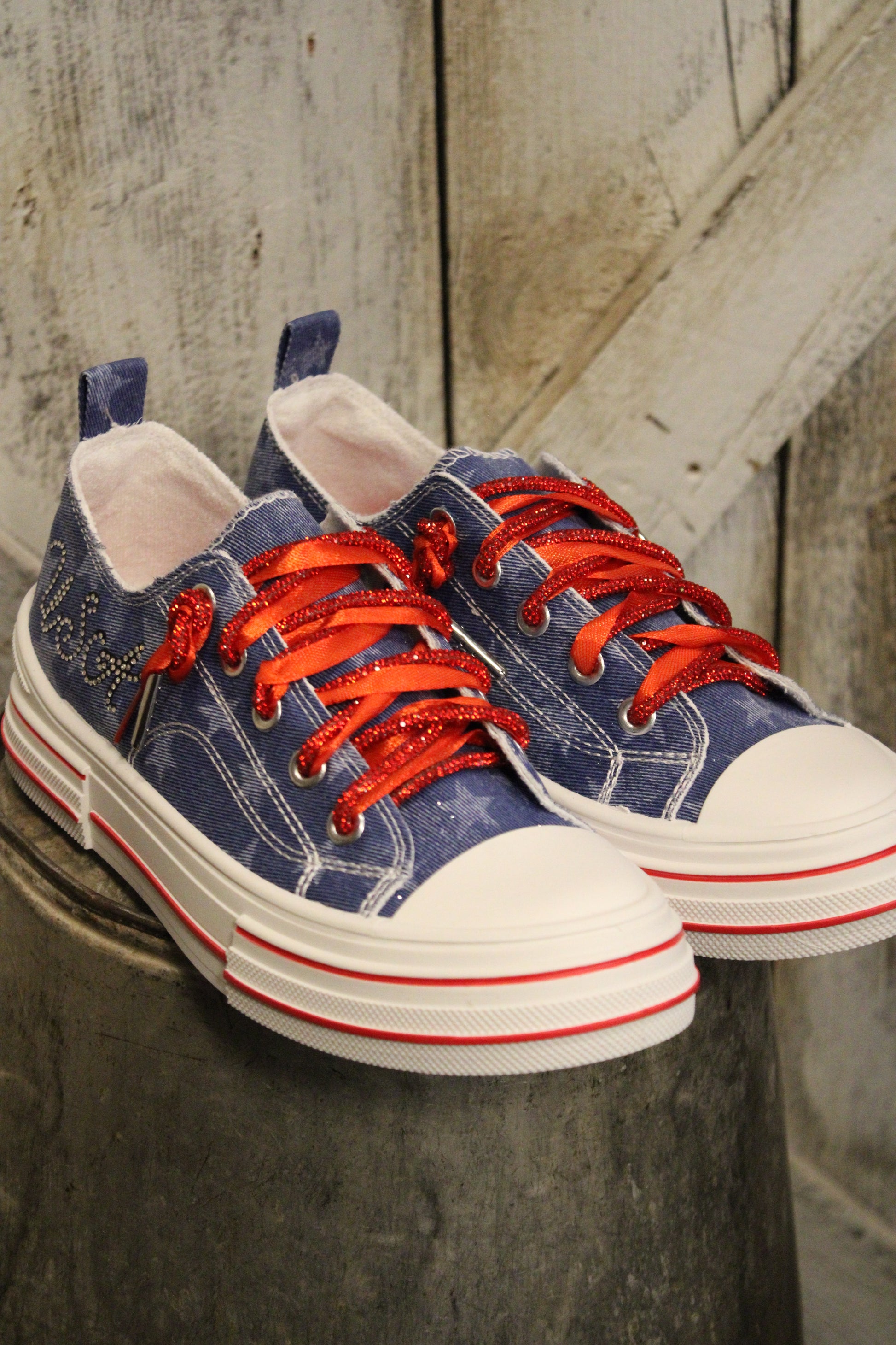 Introducing AMAN USA, A fun pop of patriotic charm with everyday comfort — these denim sneakers are made to stand out. The faded star print gives them a vintage-inspired vibe, while the bold red laces add just the right splash of color. Finished with cushioned soles and a classic low-top silhouette, they’re lightweight, easy to wear, and perfect for everything from summer festivals to casual weekend outfits. Cute, playful, and full of personality, these are the sneakers you’ll reach for when you want your shoes to do the talking.