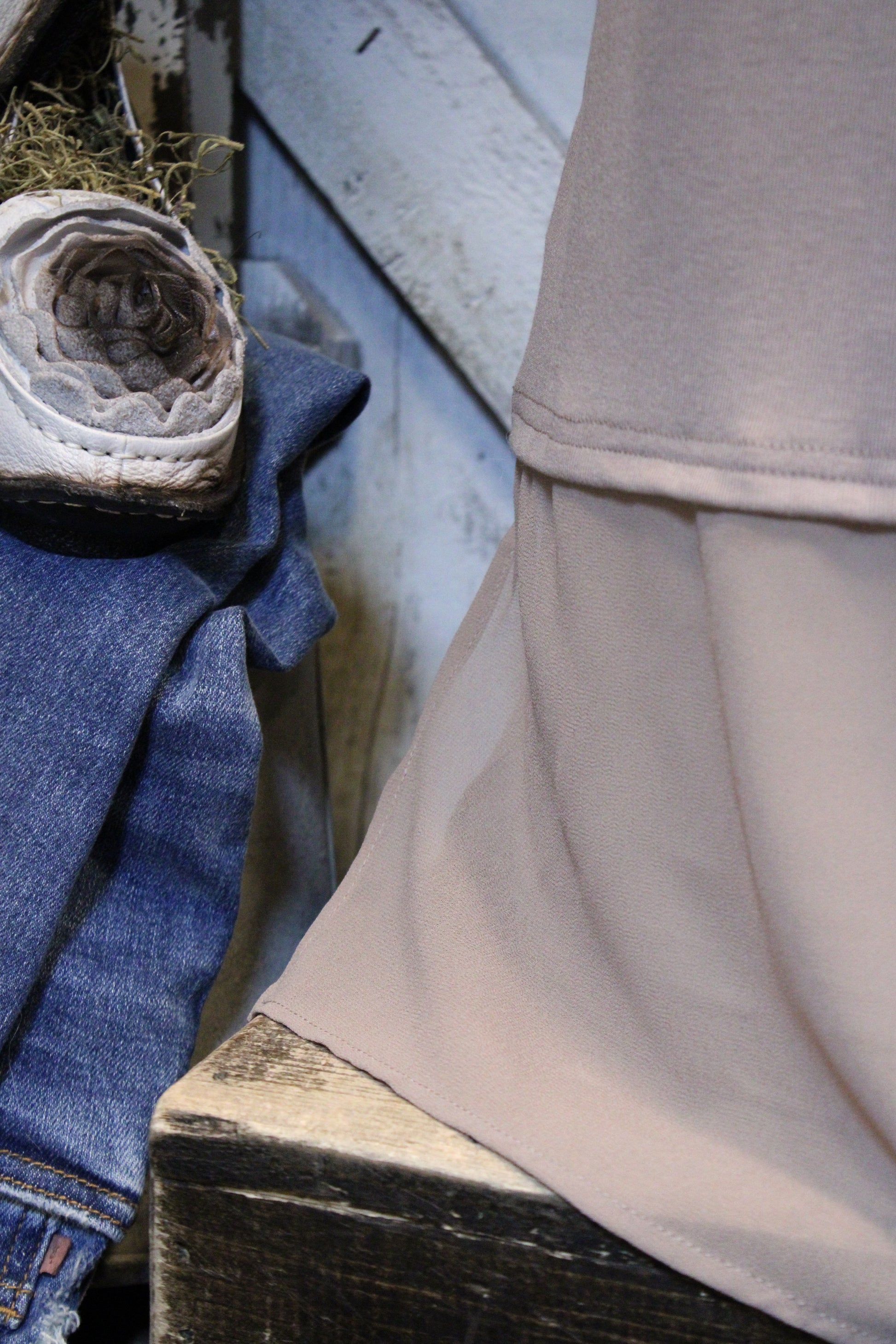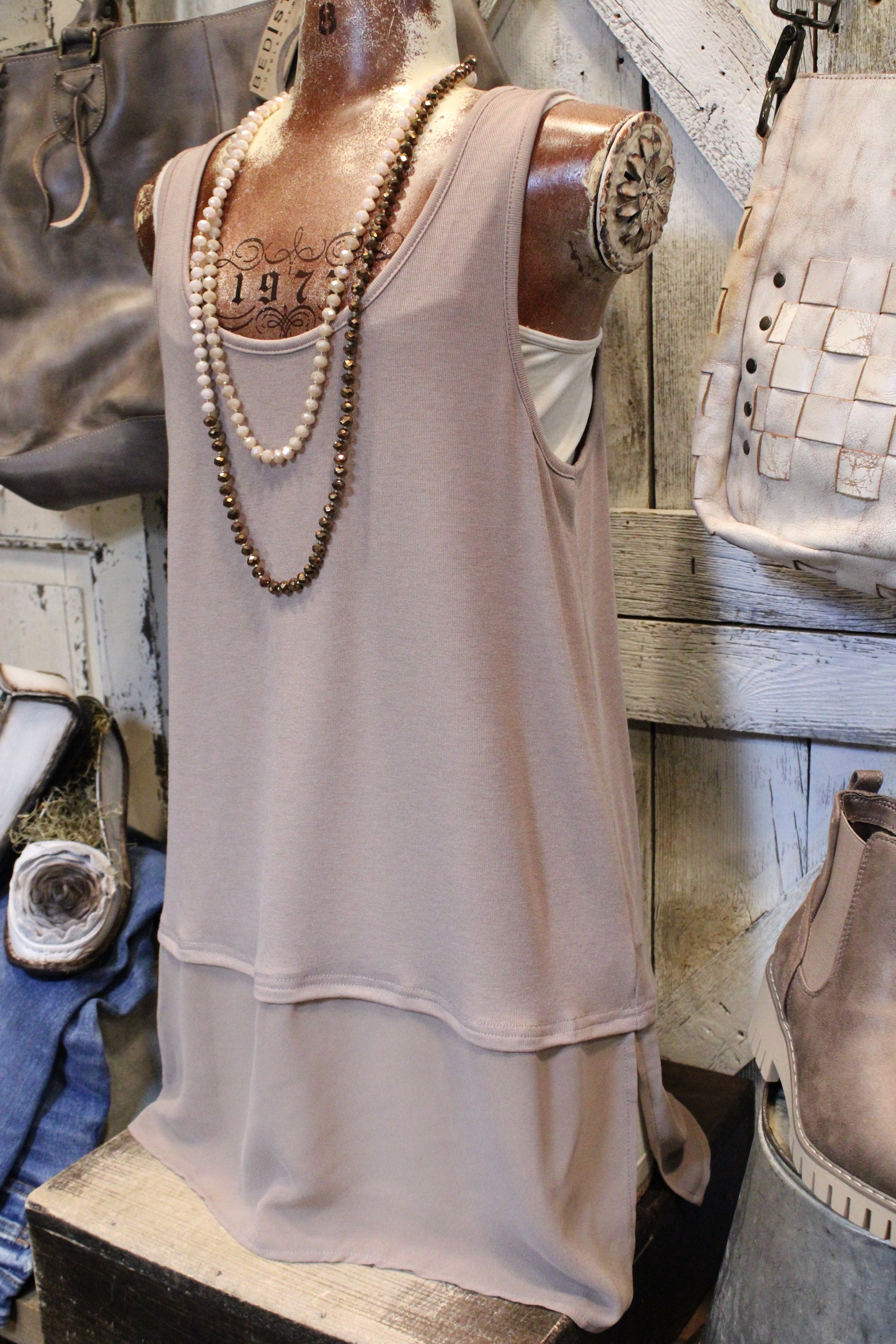 Introducing the Are You Sheerious Taupe Tank- A layering dream come true! This soft, neutral tank is the perfect base piece for all your favorite cardigans, shackets, and sweaters. The double-layered hem adds a flowy, feminine touch that peeks out just right — giving your outfit that extra bit of polish and charm.