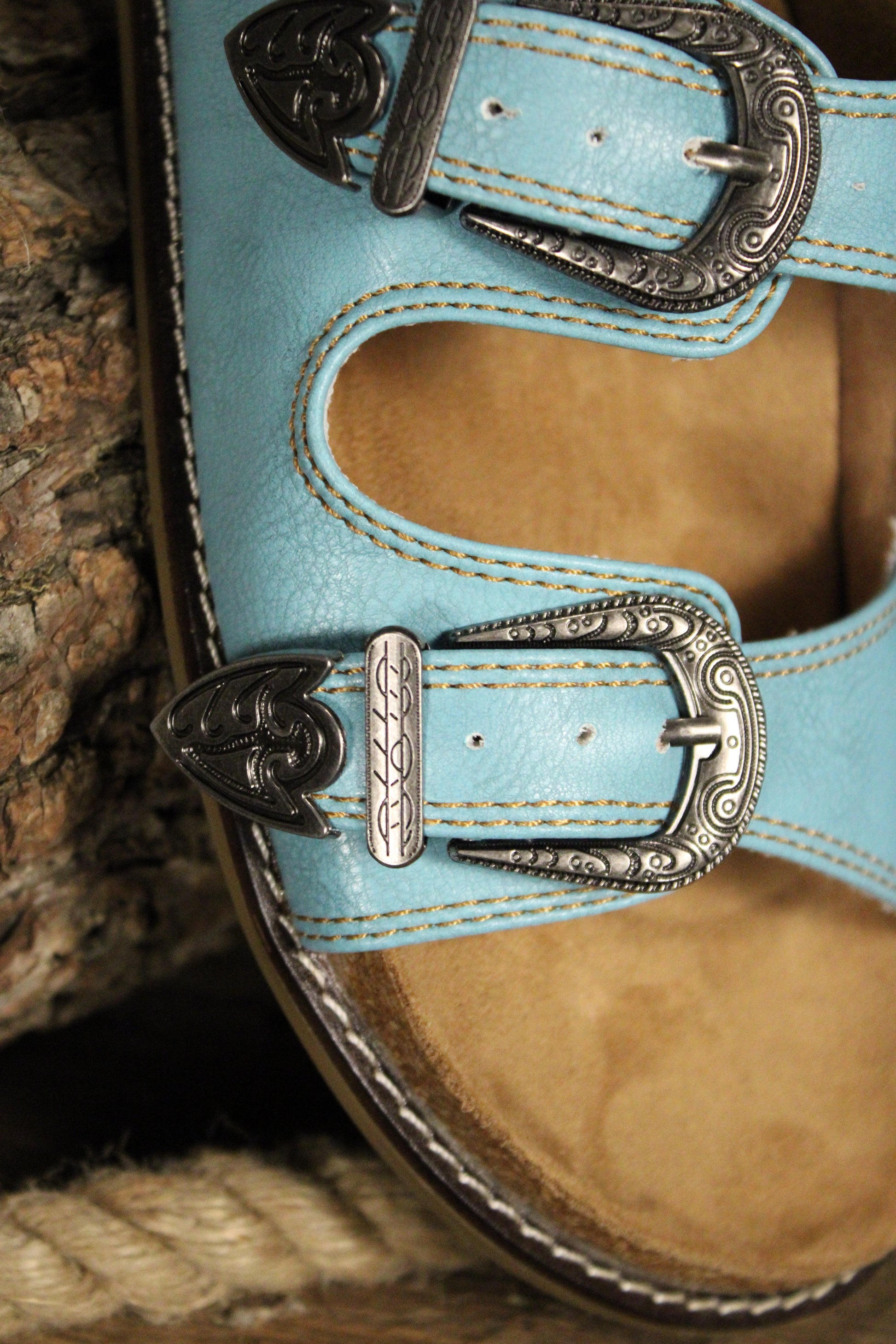 Step into style and comfort with our ATTA Girl Teal Sandals! Step into warm-weather style with these easy, everyday slide sandals designed for all-day comfort and effortless charm. Featuring soft, supportive footbeds and adjustable buckle straps, they offer a custom fit while keeping your look cute and laid-back. The pretty turquoise tone adds a fun pop of color that pairs perfectly with denim, dresses, and all your favorite summer outfits. Lightweight and easy to slip on, these sandals are made for busy days, sunny strolls, and everything in between. A must-have staple for your farm-girl wardrobe.