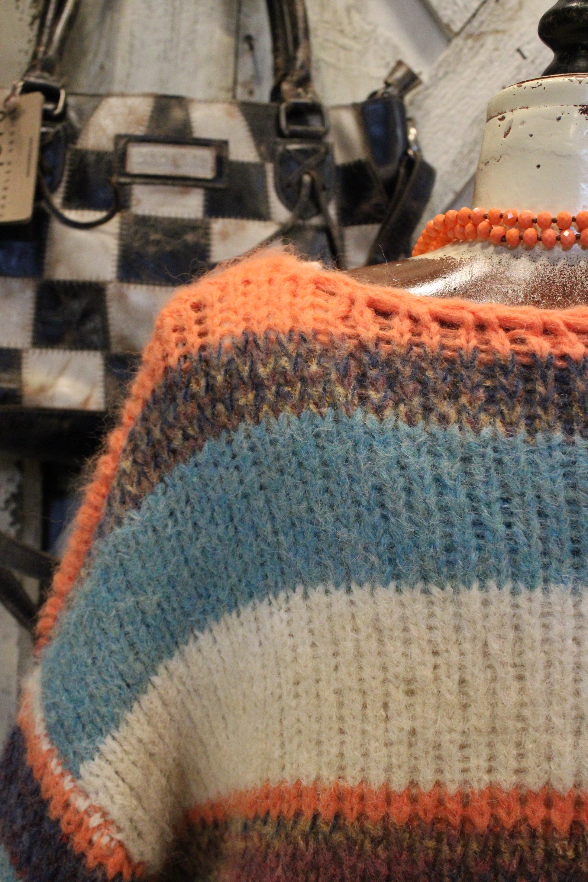 Featuring a mix of warm pumpkin, cream, sky blue, and earthy brown tones, this relaxed knit gives off those perfectly rustic, fireside-chic feels. The slightly oversized fit and wide sleeves make it easy to layer over your favorite lace cami or pair with denim and boots for that effortlessly cute Farm Girl look.