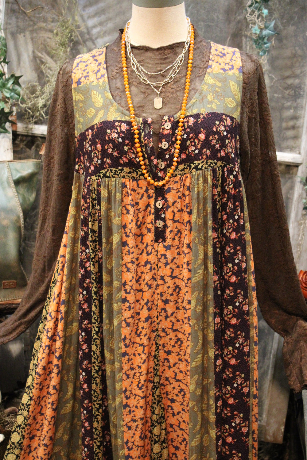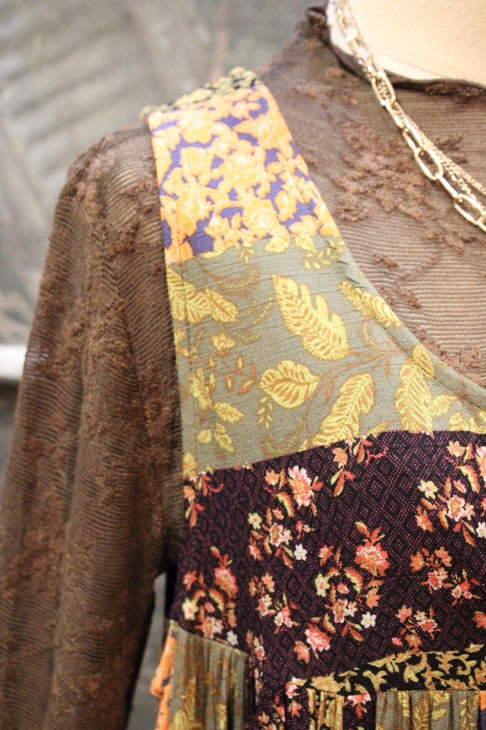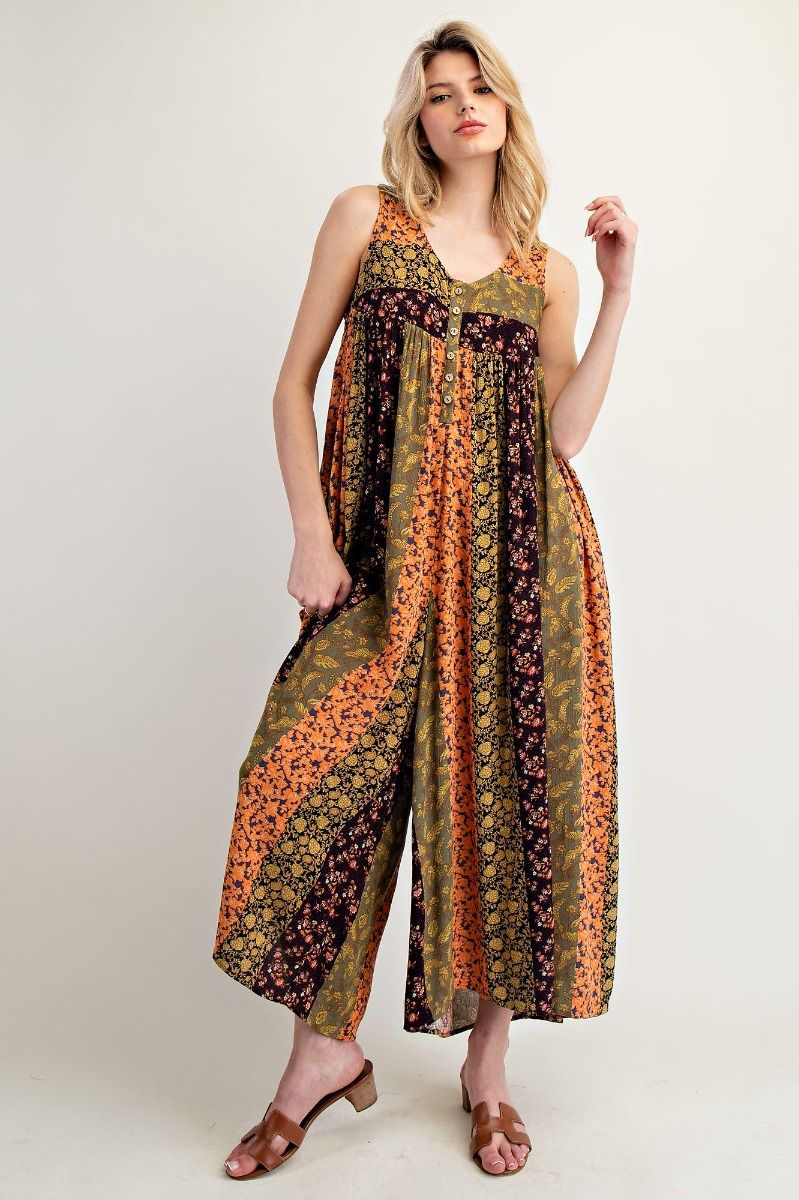 Backroad Orange Floral Romper- Bring bold bohemian energy to your wardrobe with this boho patchwork romper. Designed with a relaxed, wide-leg fit and a mix of earthy floral prints, this sleeveless one-piece blends comfort and standout style. The flattering V-neckline and button-front detail add a polished touch, while the flowy fabric keeps things breezy and lightweight for warm-weather days.