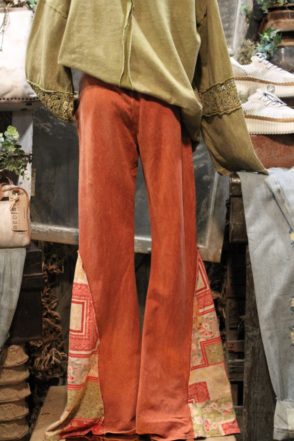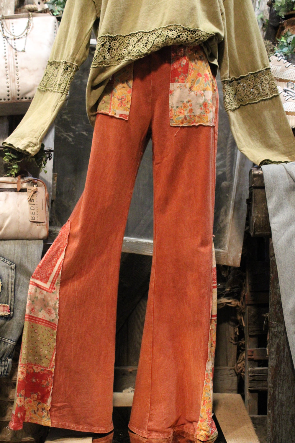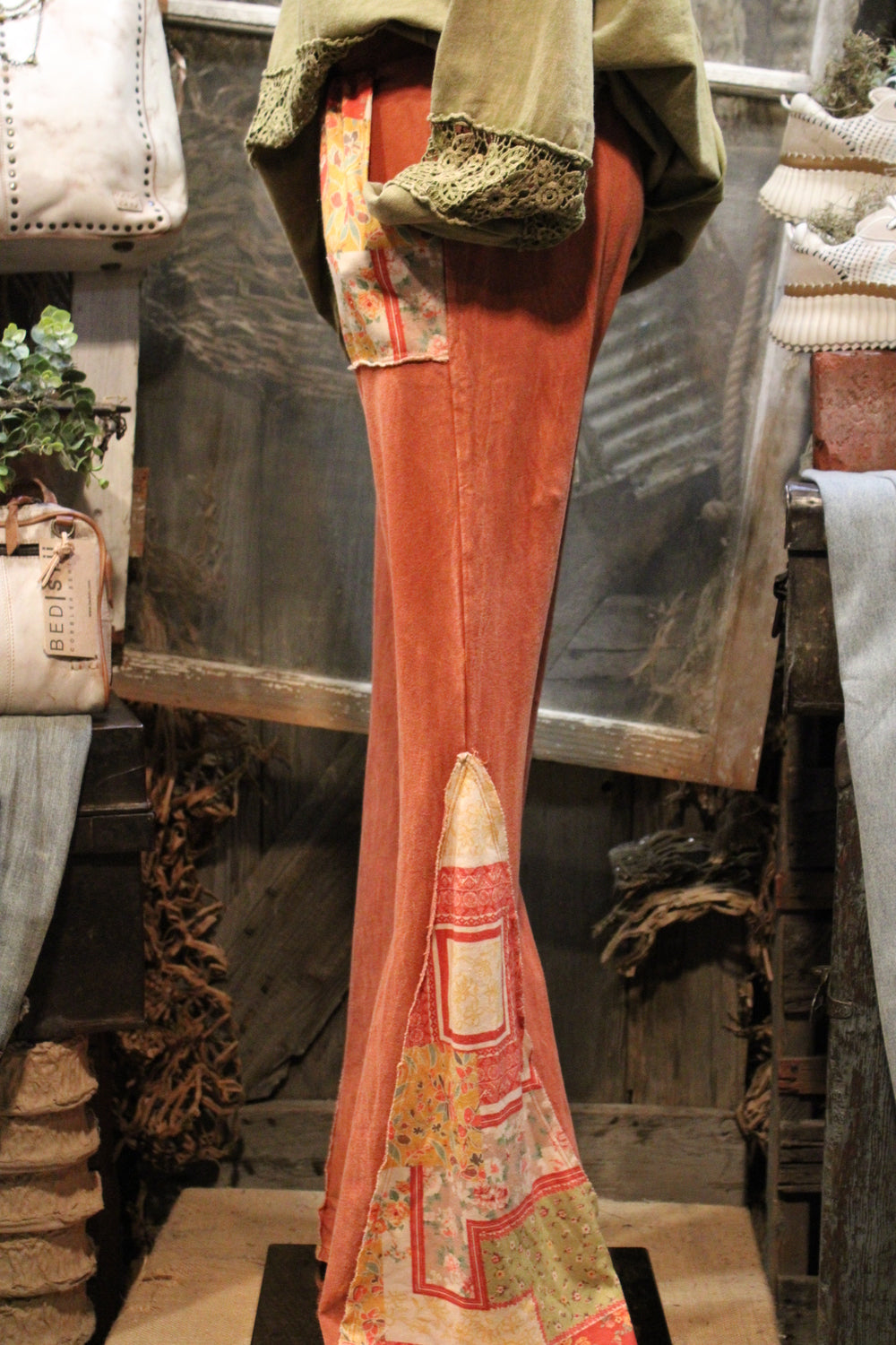 Introducing the Bandana Belle Pants- Make a bold and beautiful statement with these rust-toned flare pants, featuring vibrant patchwork accents that celebrate color, texture, and creativity. These pants combine a flattering, fitted silhouette through the hips with a dramatic flared leg, detailed with vintage-inspired fabric inserts. Oversized patch pockets add a playful, practical touch while highlighting the pants’ artisan feel.