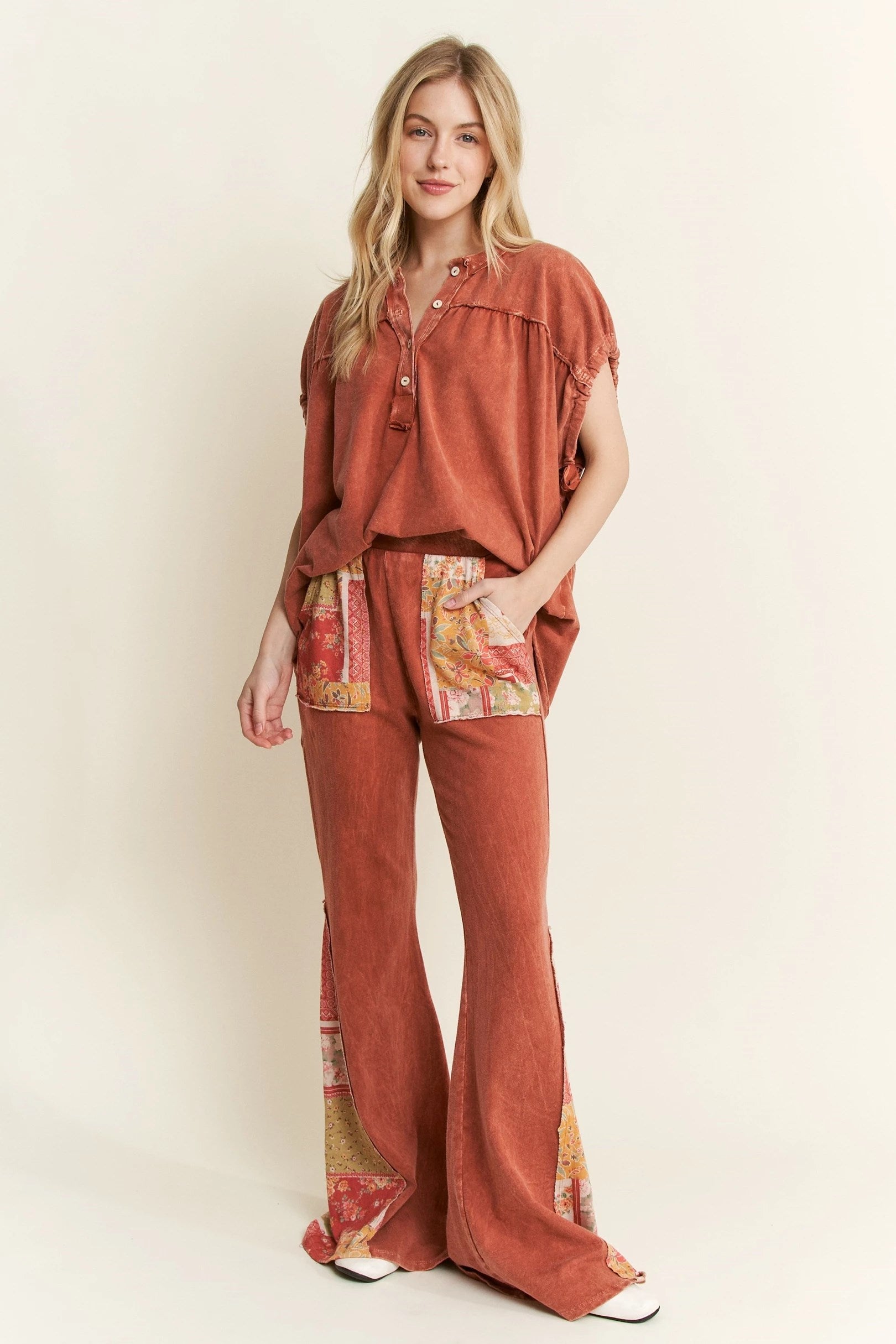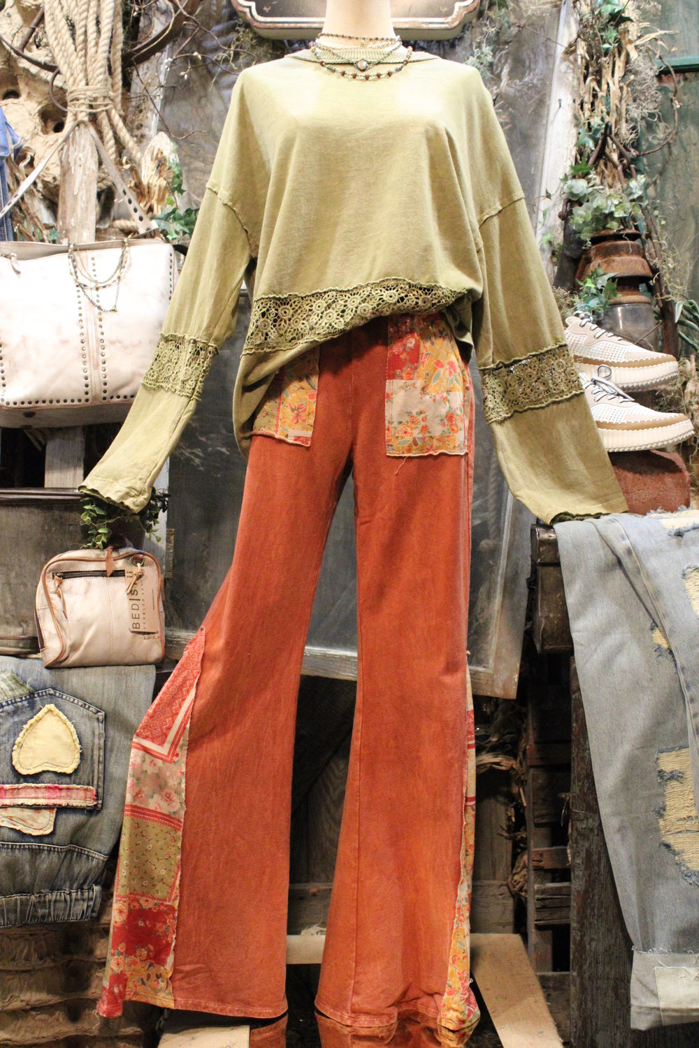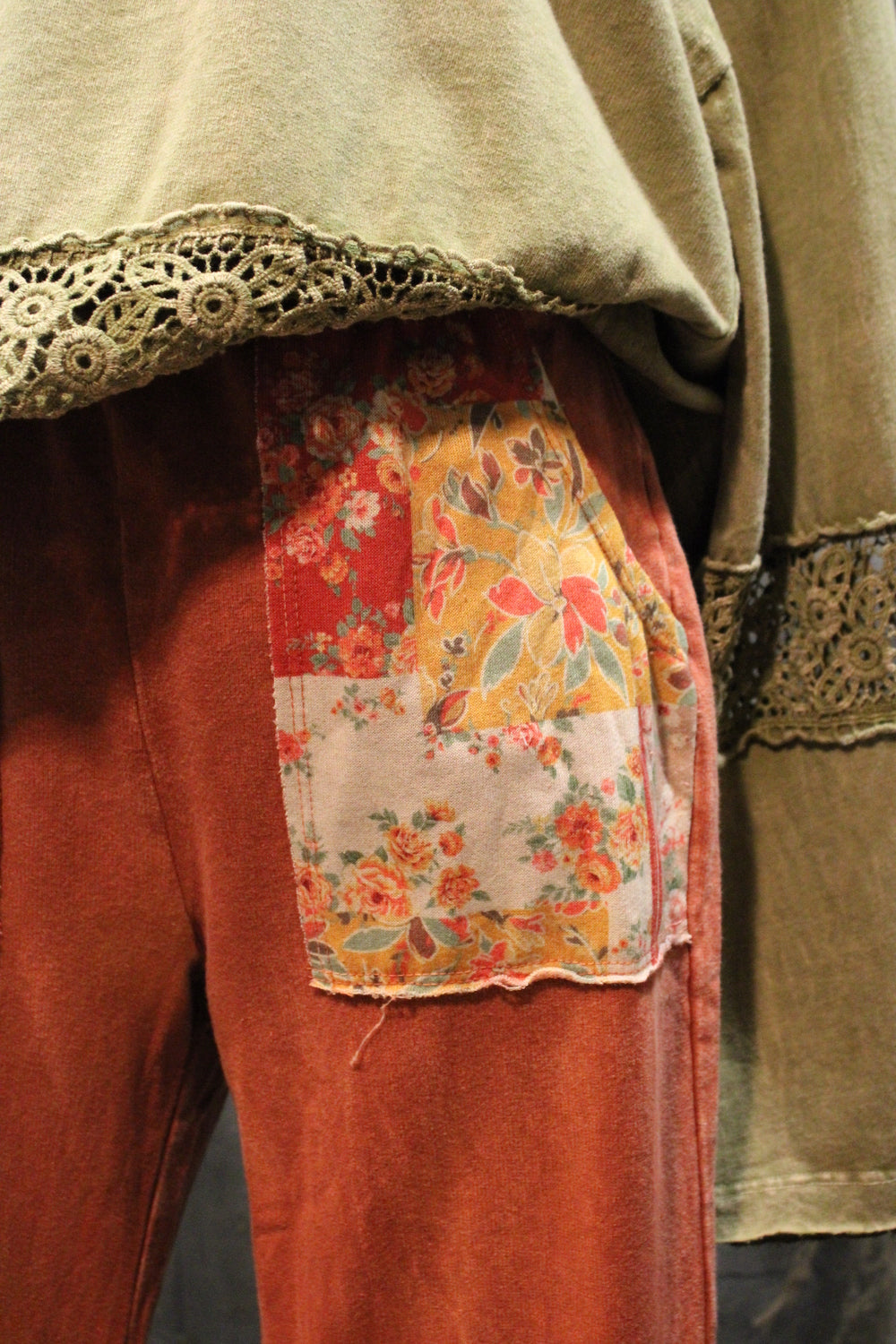 Introducing the Bandana Belle Pants- Make a bold and beautiful statement with these rust-toned flare pants, featuring vibrant patchwork accents that celebrate color, texture, and creativity. These pants combine a flattering, fitted silhouette through the hips with a dramatic flared leg, detailed with vintage-inspired fabric inserts. Oversized patch pockets add a playful, practical touch while highlighting the pants’ artisan feel.