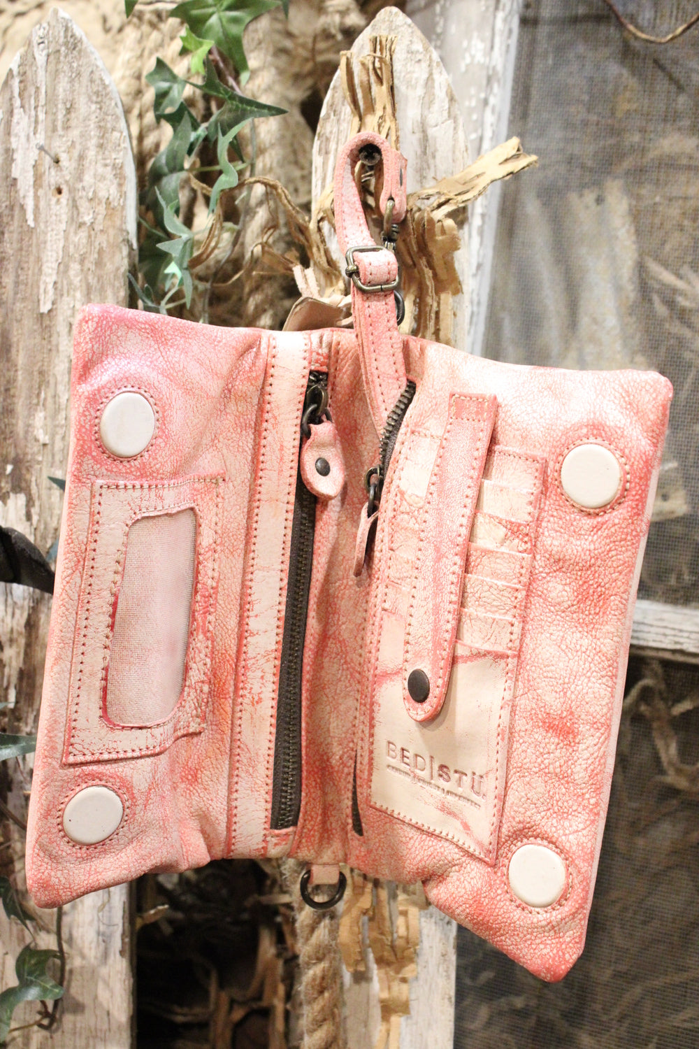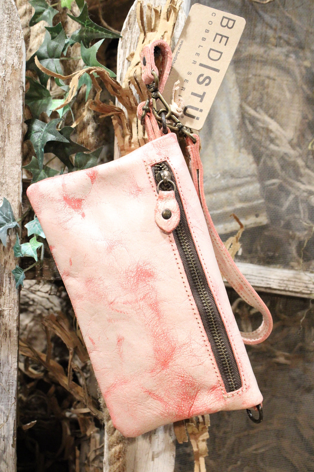 - Comes with two removable leather straps: clutch and crossbody