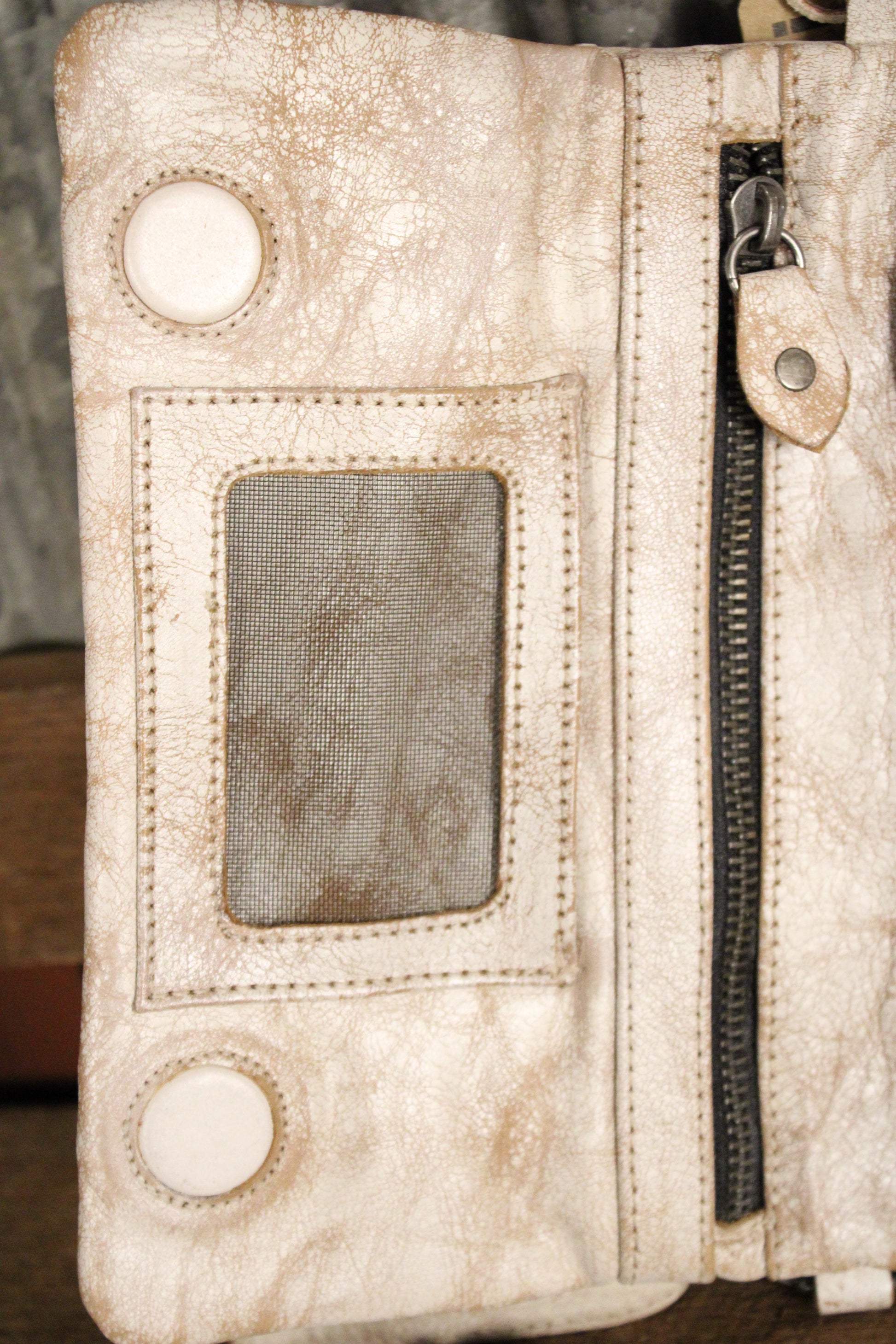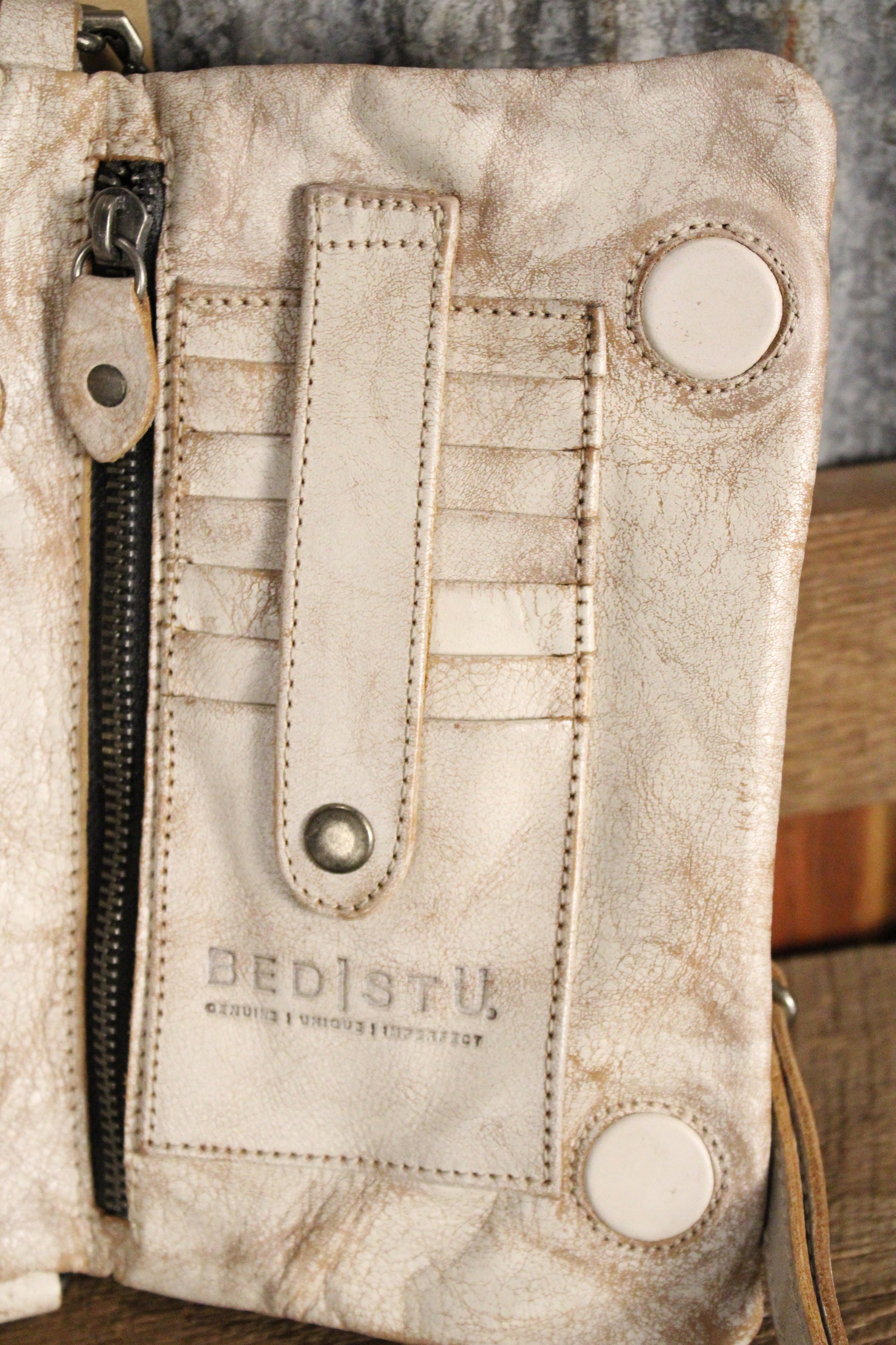 - Studded leather zipper pulls