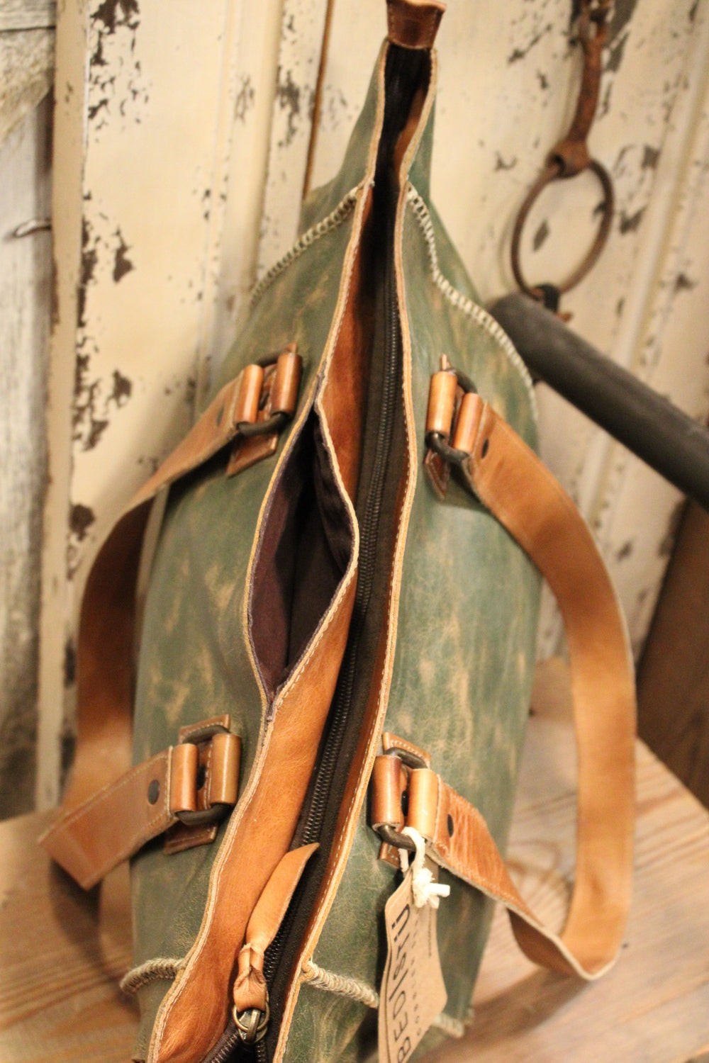 - 1 interior zippered pocket with braided leather pull, 2 slip pockets