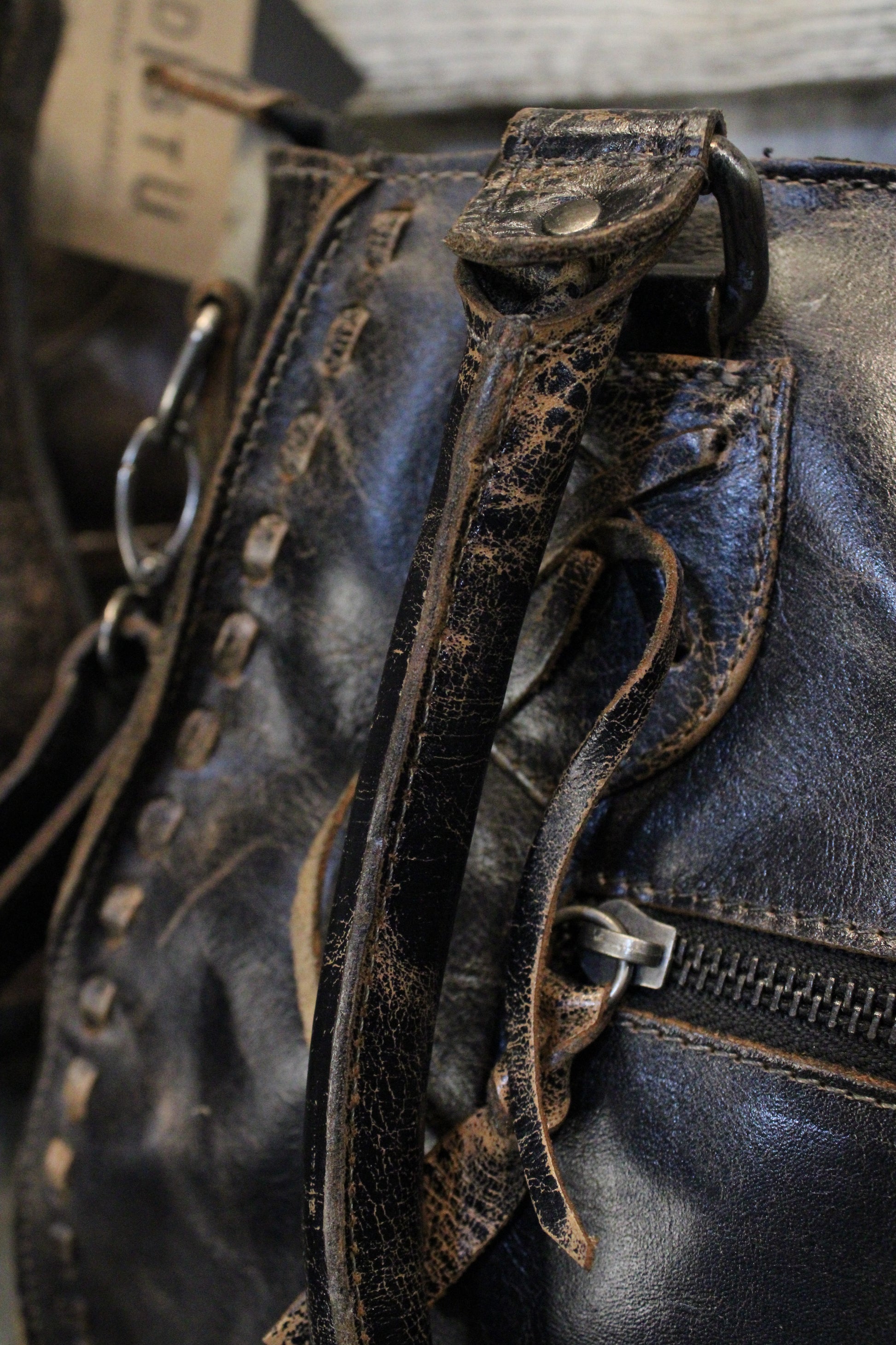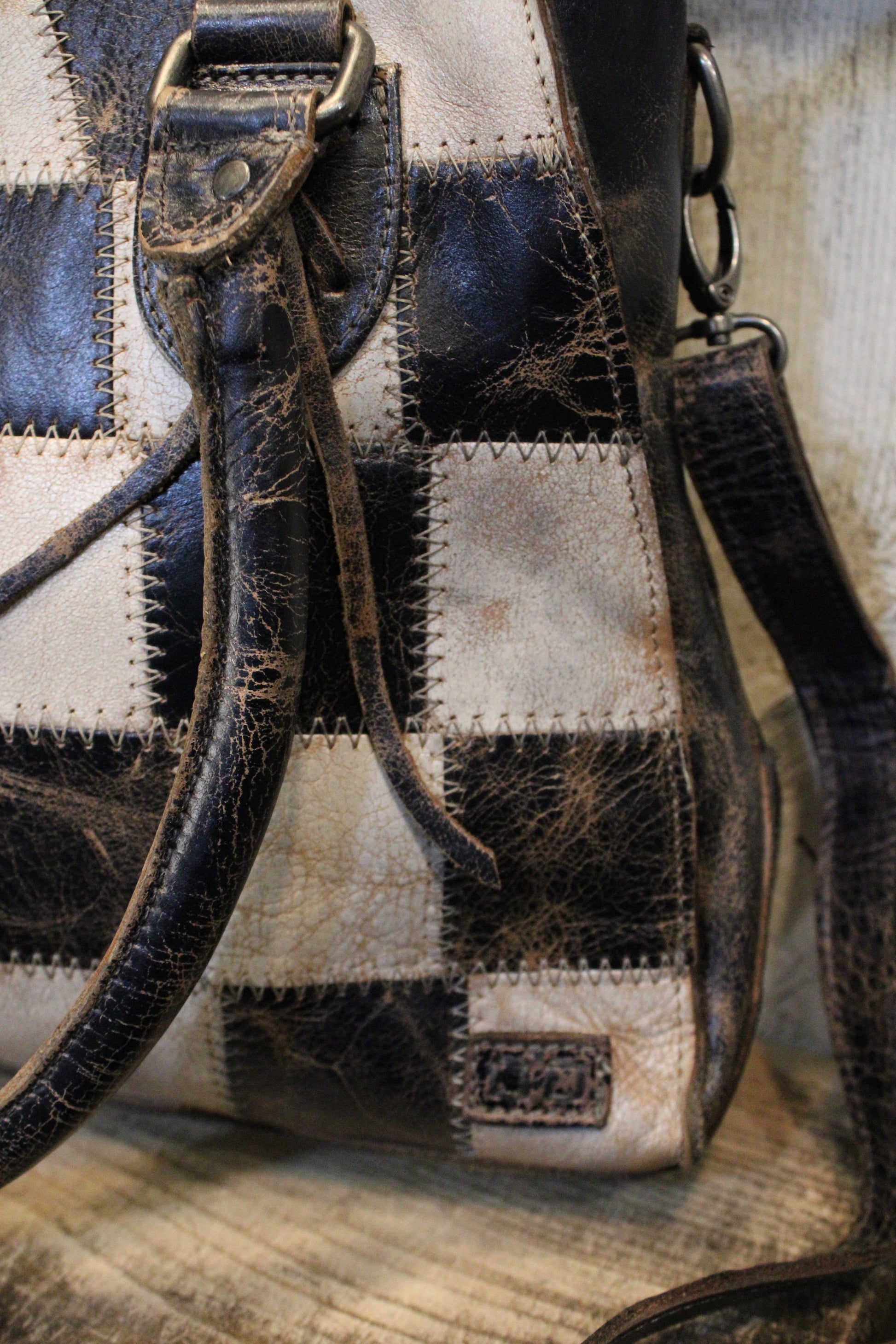 - Shoulder bag with padded straps or wear as a crossbody, unique no-waste patchwork front panel made from scrap leather