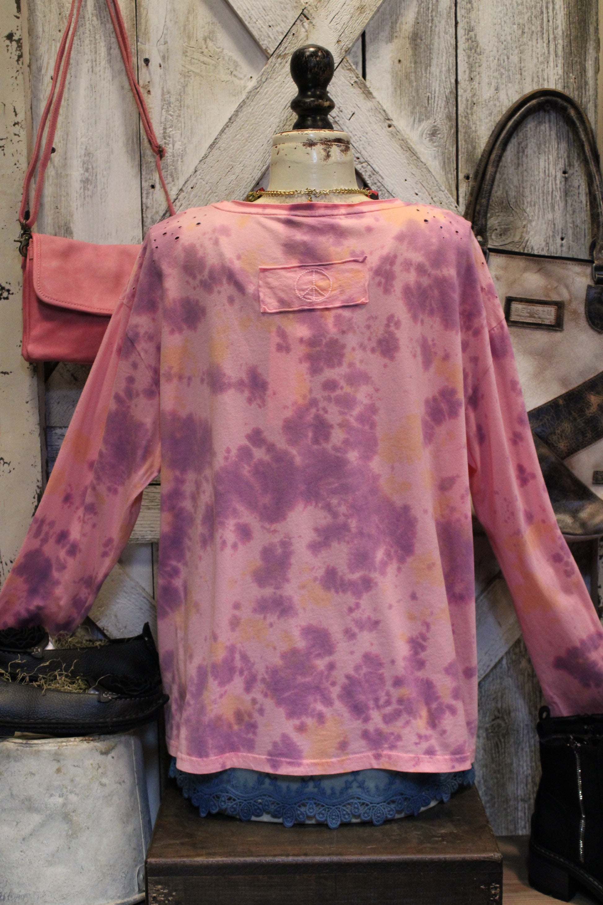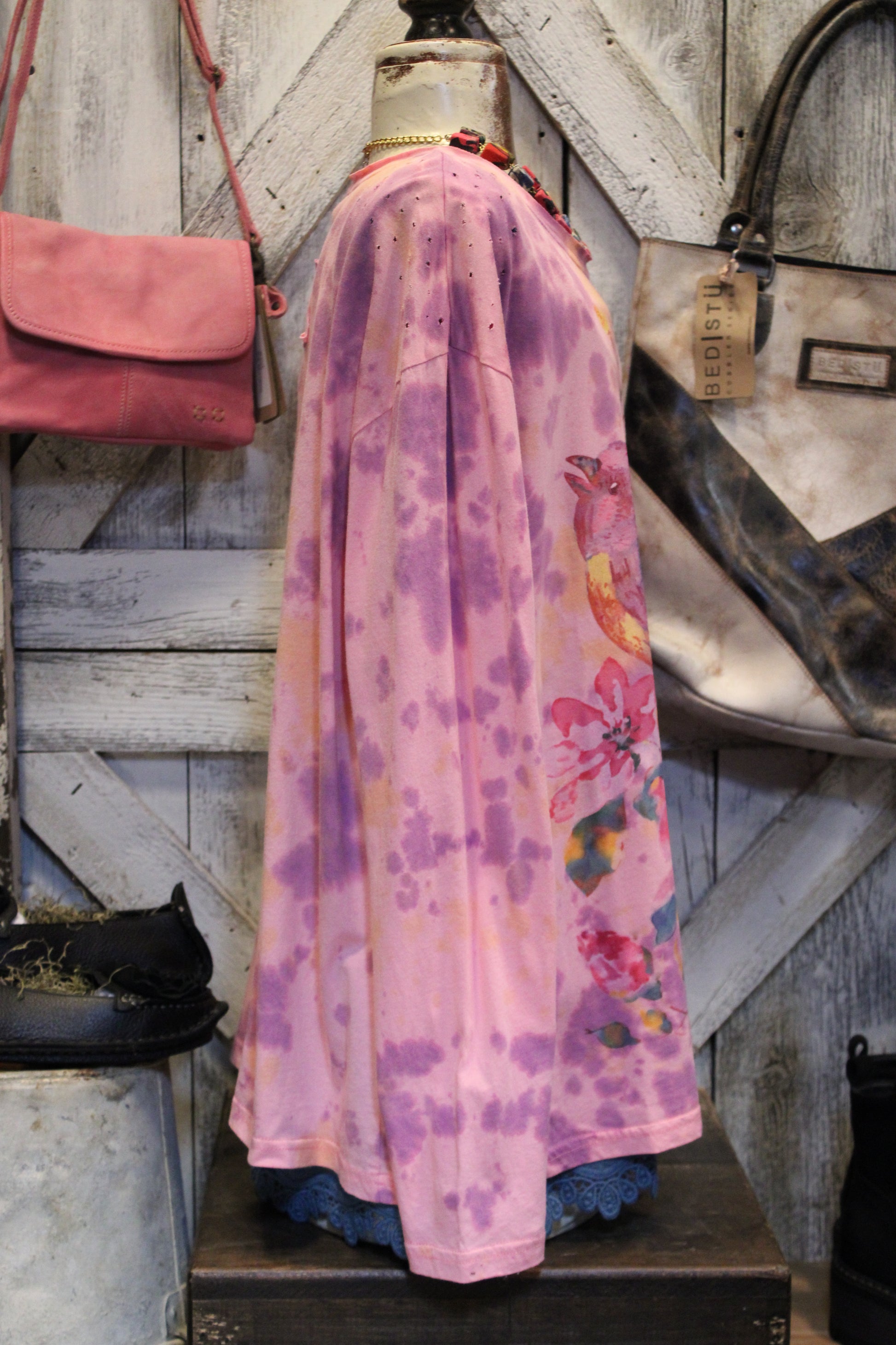 Step into a Birdsong Blooms Casual- This sweet and feminine long-sleeve top is a work of wearable art — featuring a watercolor-style bird perched among pink and yellow blossoms. The soft pink and purple tie-dye backdrop gives it a dreamy, vintage feel, perfect for those who love a touch of whimsy in their everyday look.