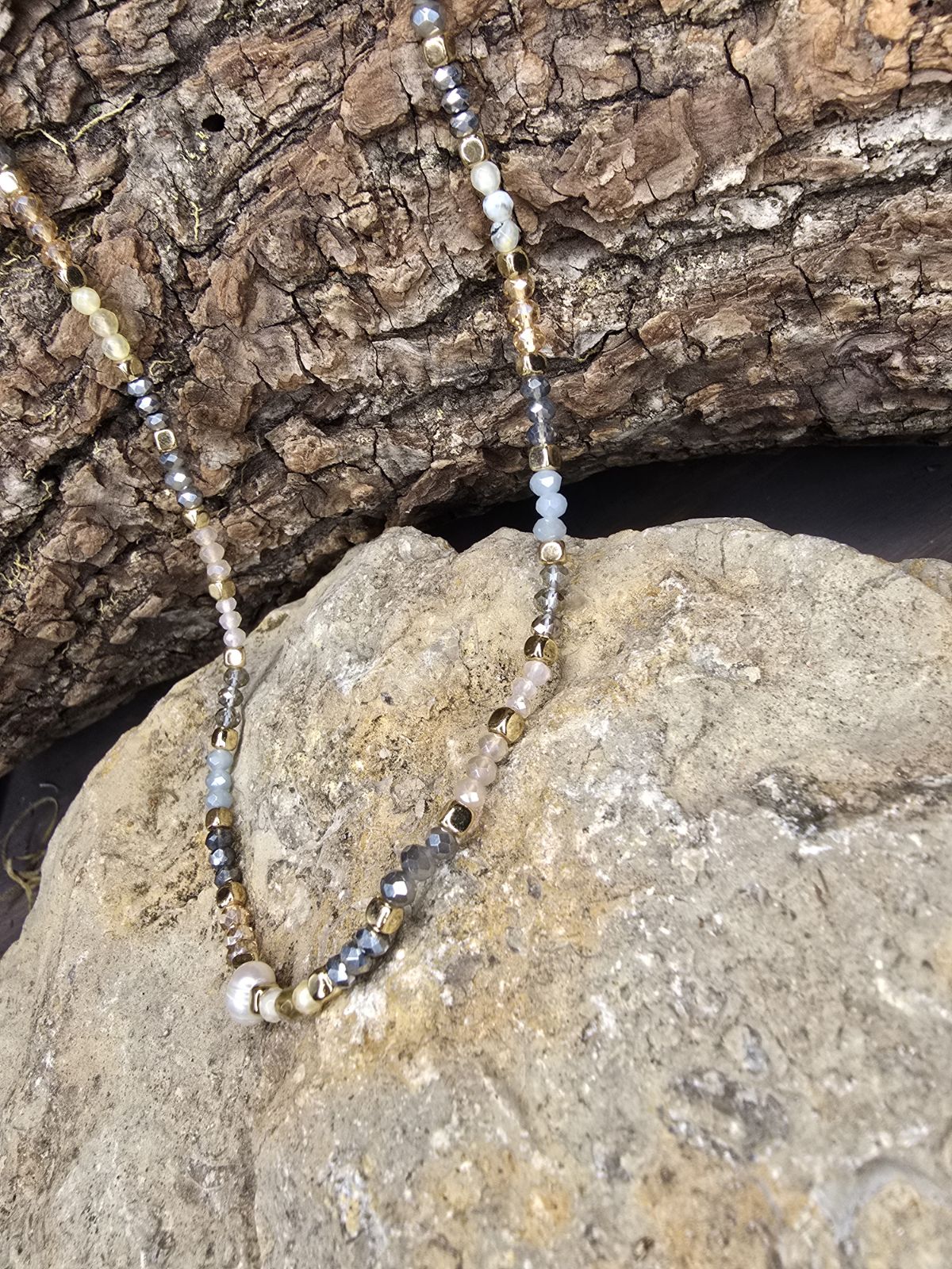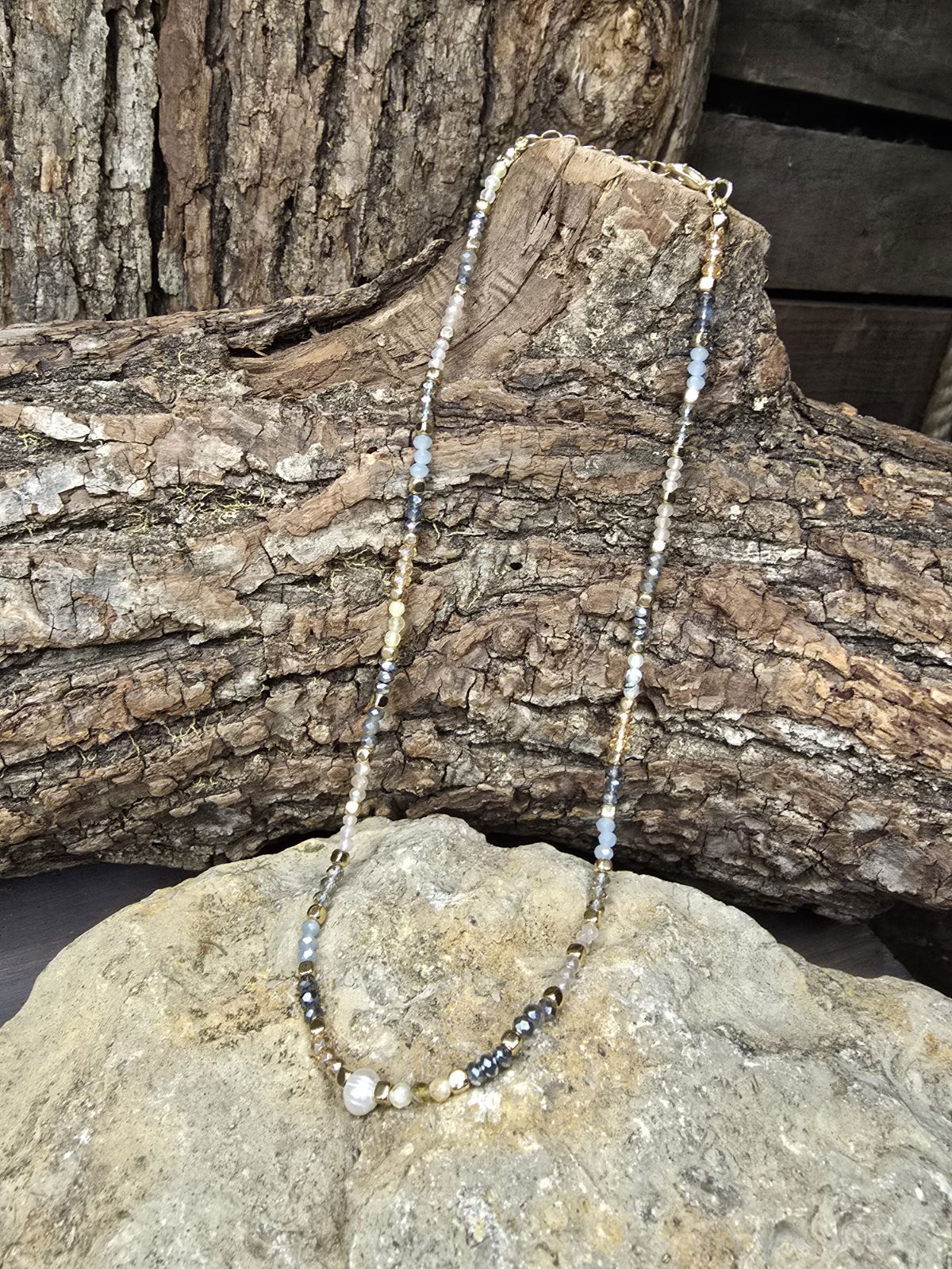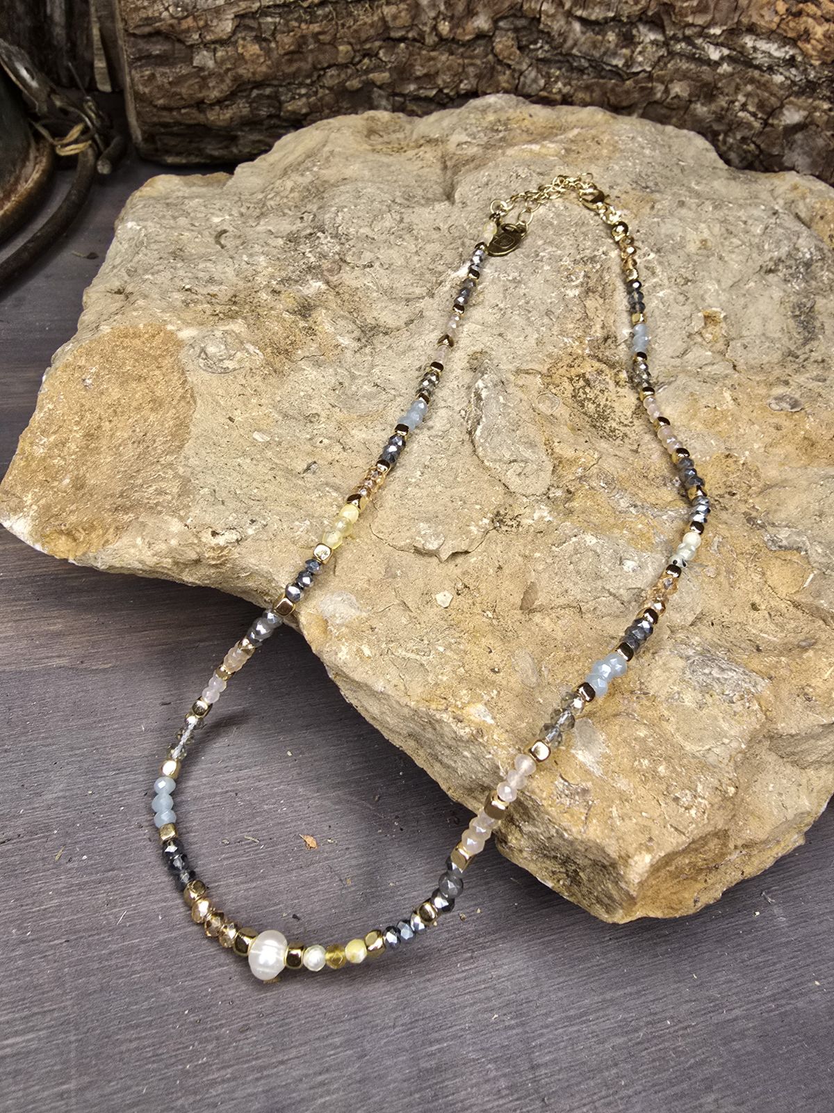 Introducing the lovely Blossom Necklace! Delicate, earthy, and timeless, this beaded necklace is a stunning mix of natural tones and textures. Stung with shimmering faceted beads in shades of smoky gray, golden amber, and soft blue, it captures a look that feels both grounded and elegant. A lustrous pearl detail adds the perfect touch of sophistication, making it a versatile piece that layers beautifully or stands alone as a statement. Whether you’re dressing up your everyday style or adding a little sparkle to a night out, this necklace is the kind of accessory you’ll reach for again and again.