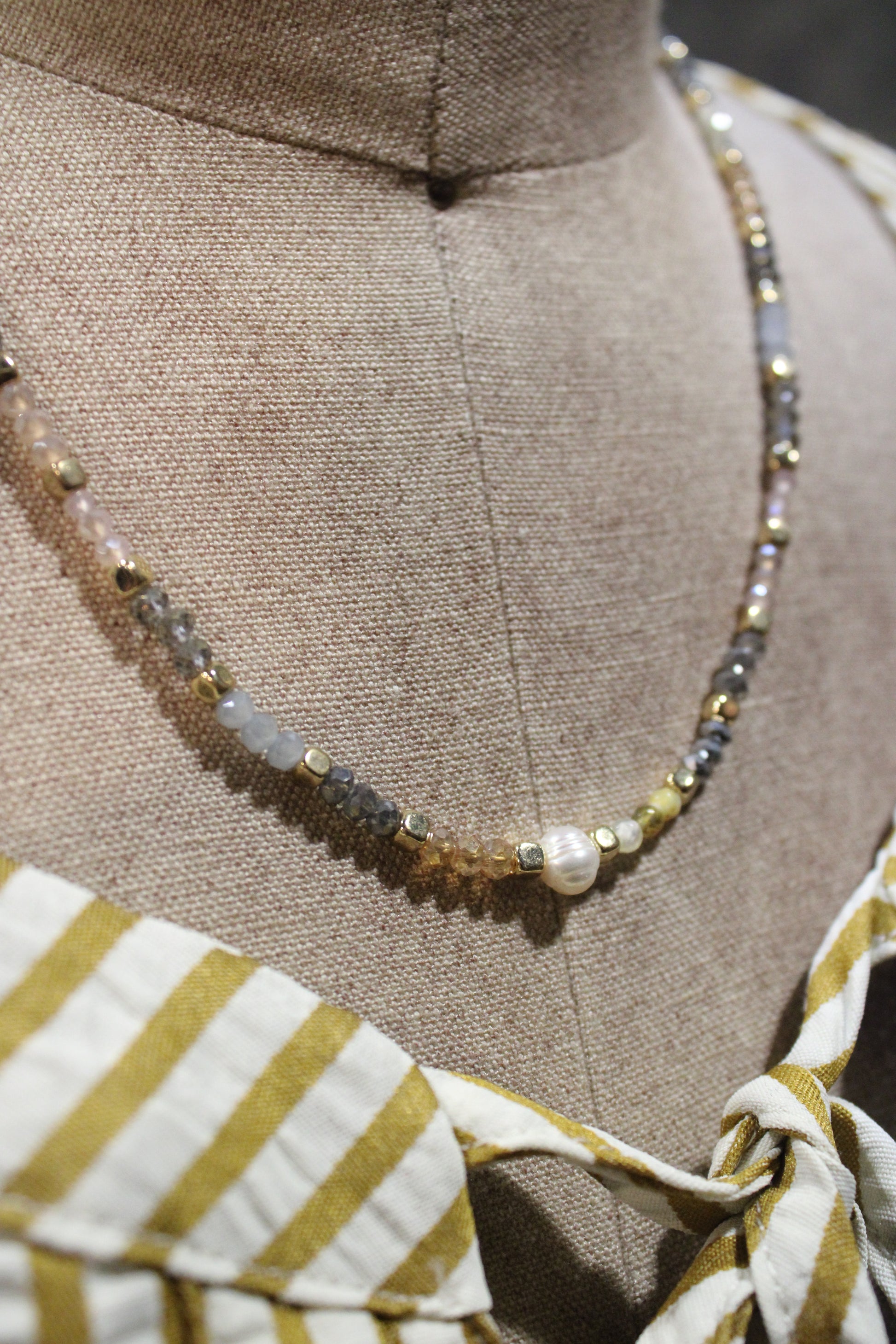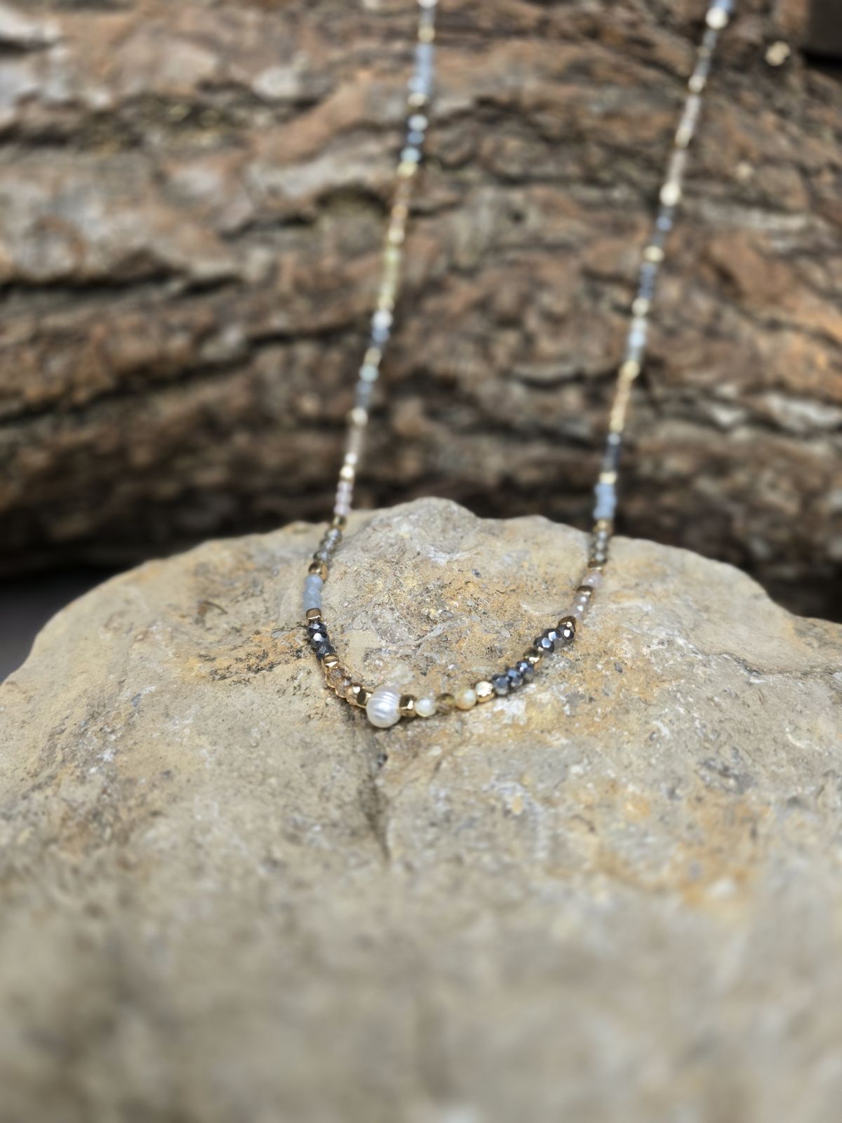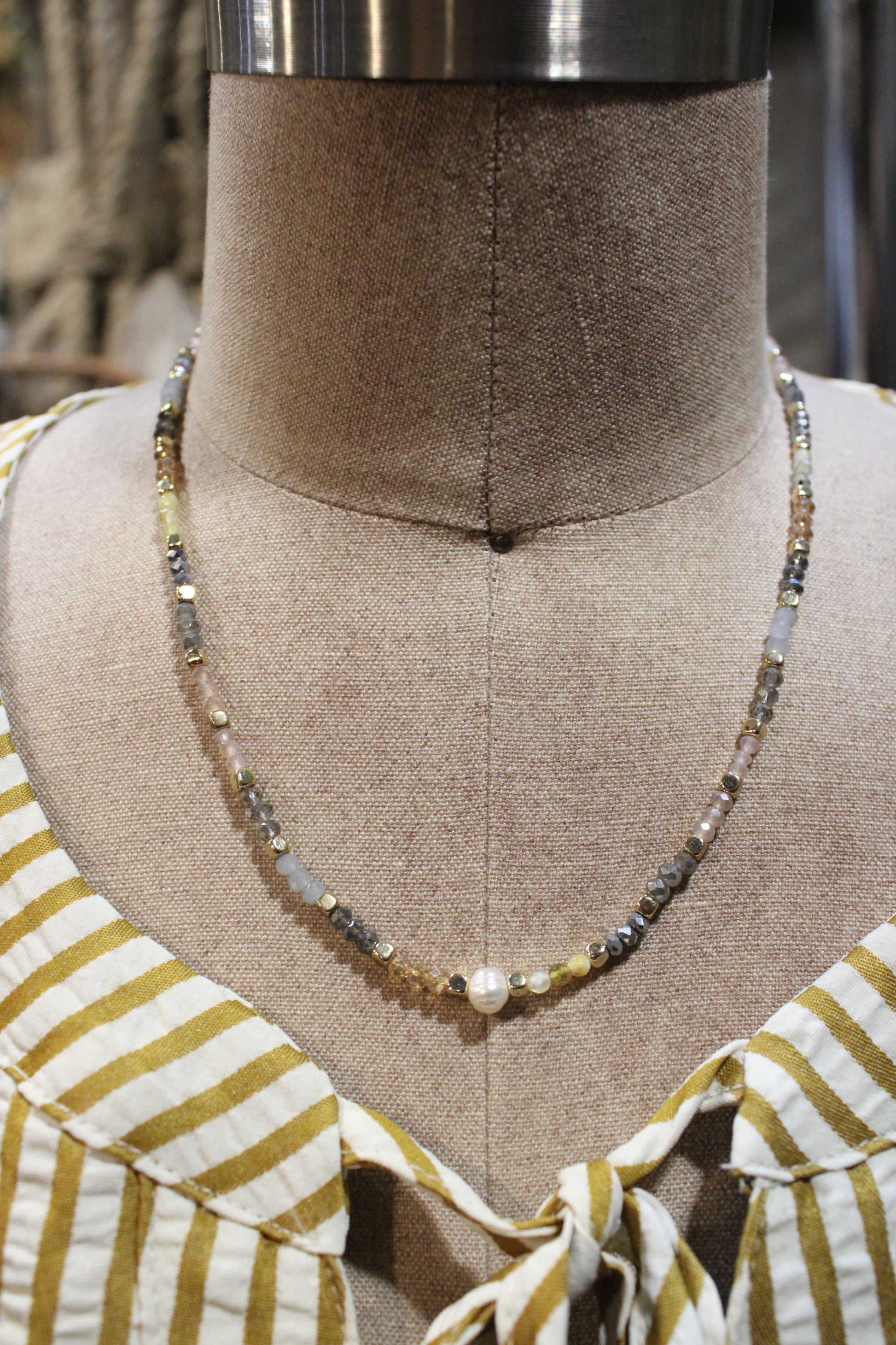 Introducing the lovely Blossom Necklace! Delicate, earthy, and timeless, this beaded necklace is a stunning mix of natural tones and textures. Stung with shimmering faceted beads in shades of smoky gray, golden amber, and soft blue, it captures a look that feels both grounded and elegant. A lustrous pearl detail adds the perfect touch of sophistication, making it a versatile piece that layers beautifully or stands alone as a statement. Whether you’re dressing up your everyday style or adding a little sparkle to a night out, this necklace is the kind of accessory you’ll reach for again and again.