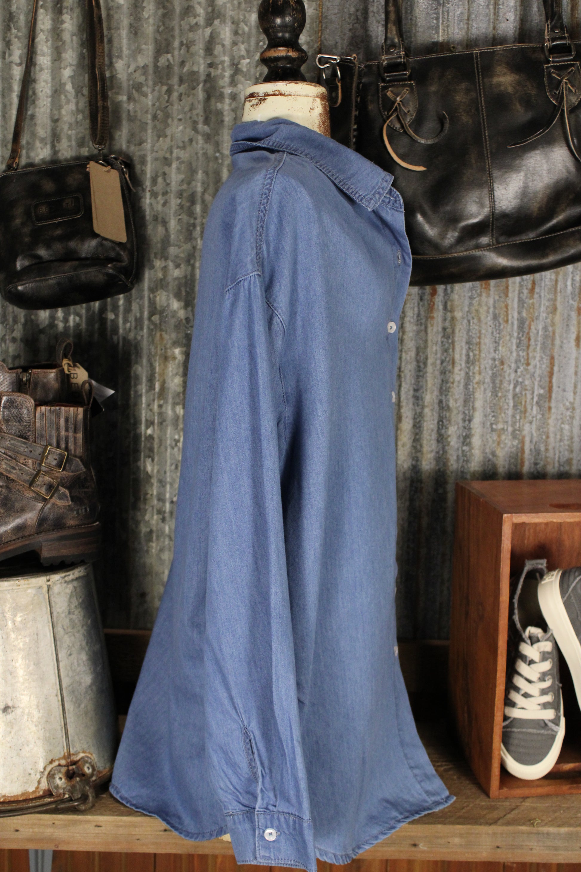 Introducing the Blue Skies Button Down, This easygoing button-down is one of those wear-everywhere staples you’ll reach for again and again. Designed with a relaxed fit, soft lightweight feel, and classic chest pocket, it brings effortless style to any outfit. The longer length makes it perfect for wearing loose, front-tucked, or layered over tanks and tees, while the roll-tab sleeves add a casual, laid-back finish. Whether paired with leggings, denim, or layered over dresses, this versatile chambray top delivers that cozy, everyday farm-girl charm with a polished touch.