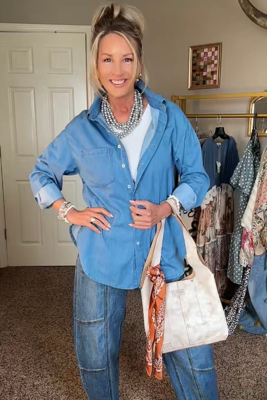 Perfect for casual days, layering seasons, and year-round styling, this chambray shirt is a must-have closet essential.