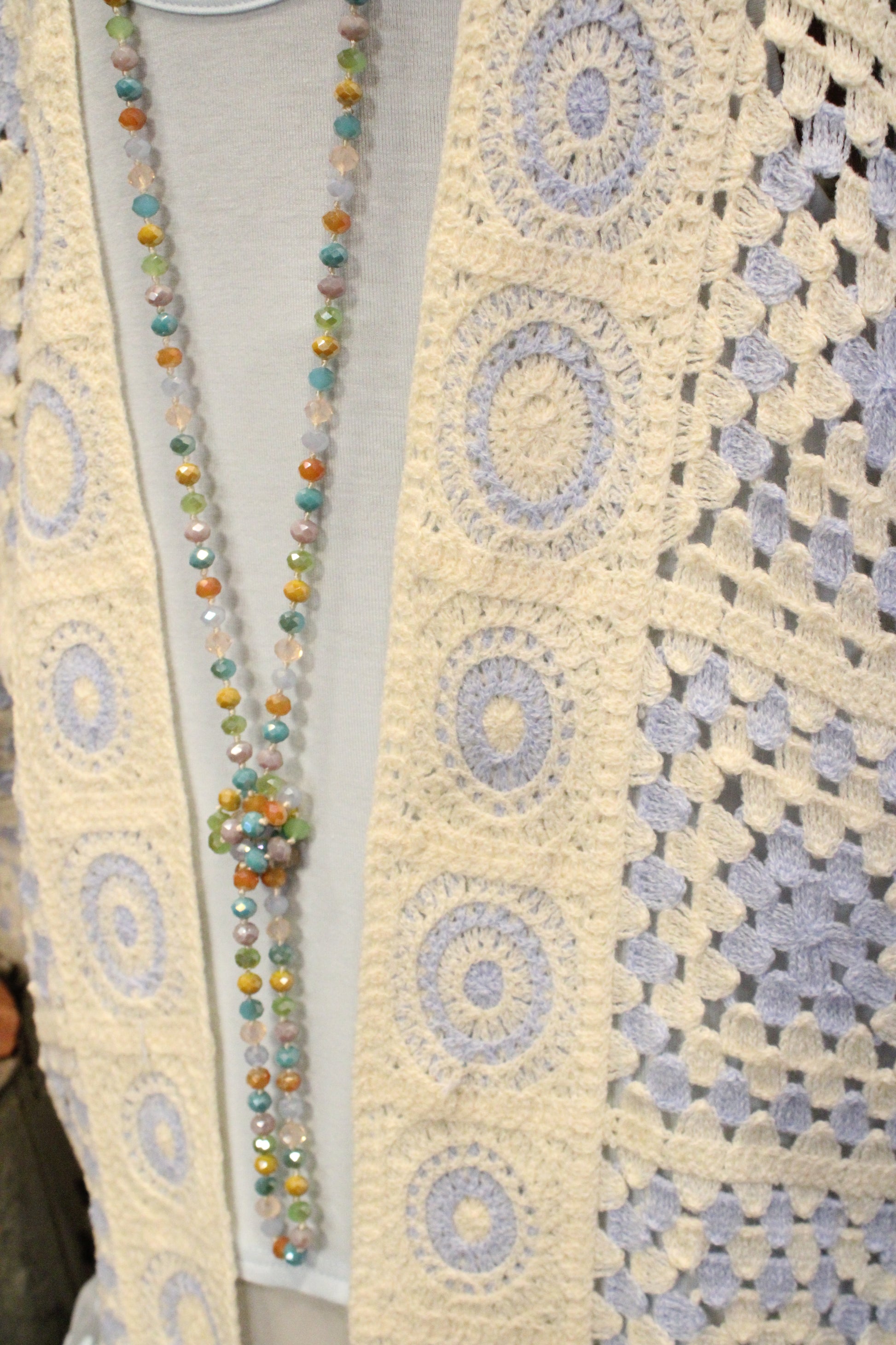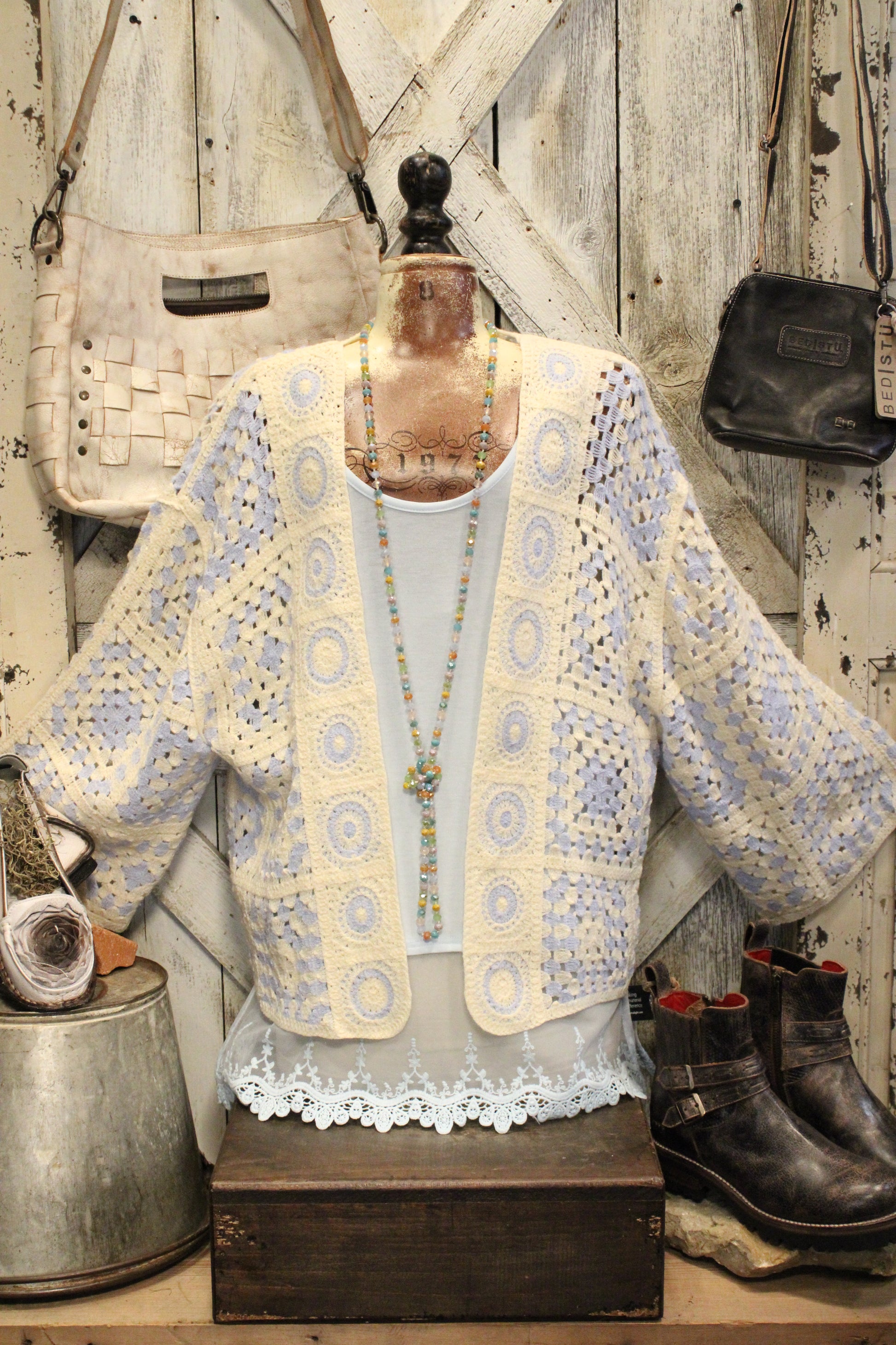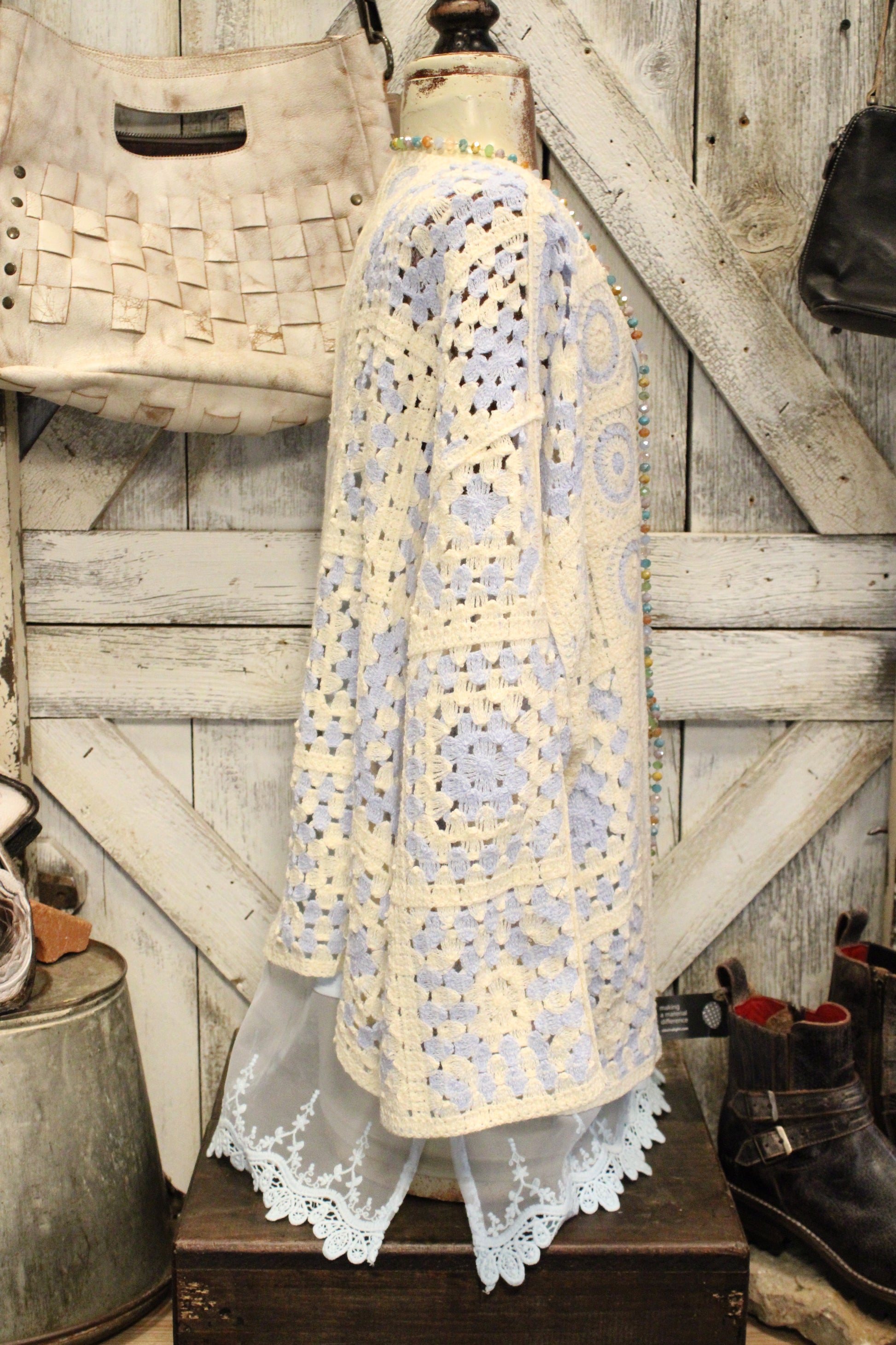 Introducing the Blue Skies Crochet Kimono- This dreamy crochet kimono is pure farm-girl boho charm, made for easy layering and effortless style. Designed with a relaxed, open-front silhouette, it features a soft granny-square inspired crochet pattern in creamy neutrals with subtle blue accents that give it that vintage-meets-modern feel. The airy knit adds just the right amount of texture without feeling heavy, making it perfect to throw on over a lace tank, graphic tee, or simple dress. With its slightly cropped length and wide sleeves, this kimono drapes beautifully and brings a laid-back, cozy vibe to any outfit—from farmers market mornings to sunset porch hangs. It’s the kind of piece you’ll reach for again and again to add that perfectly undone boho touch.