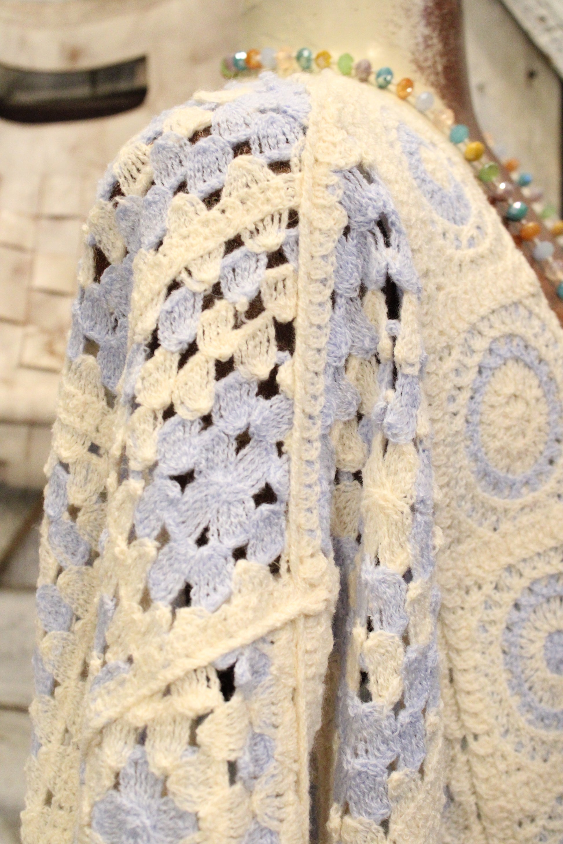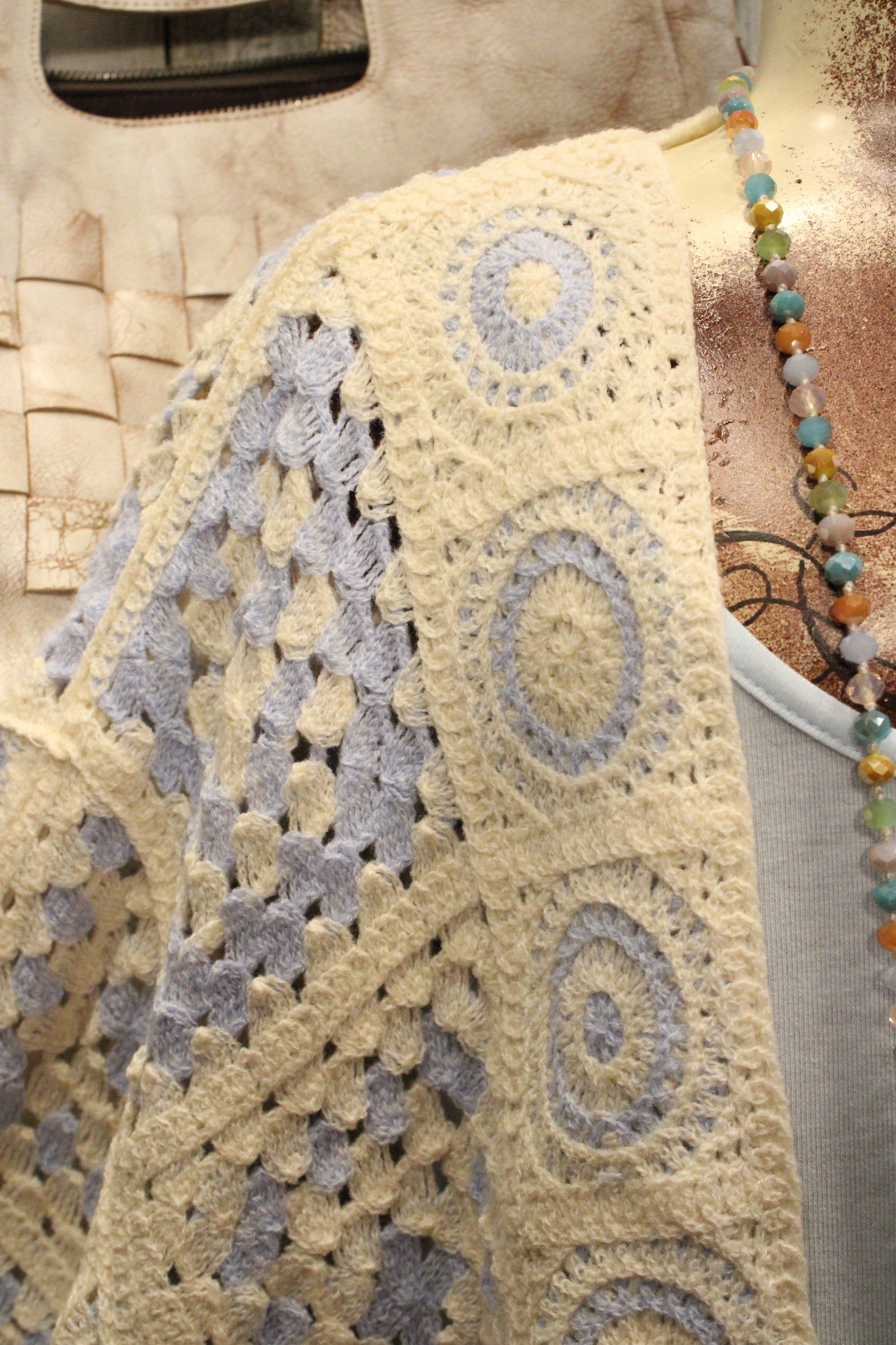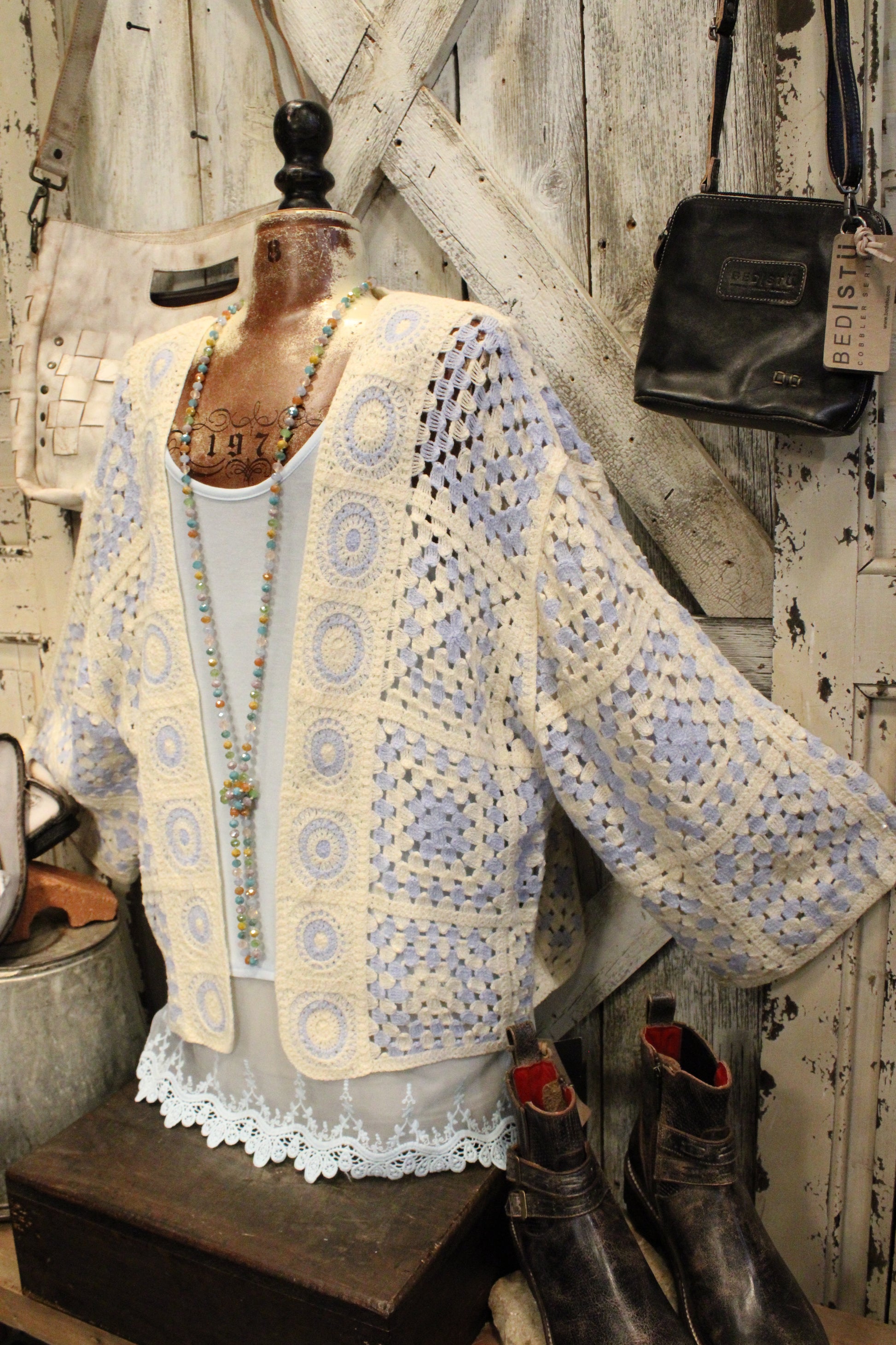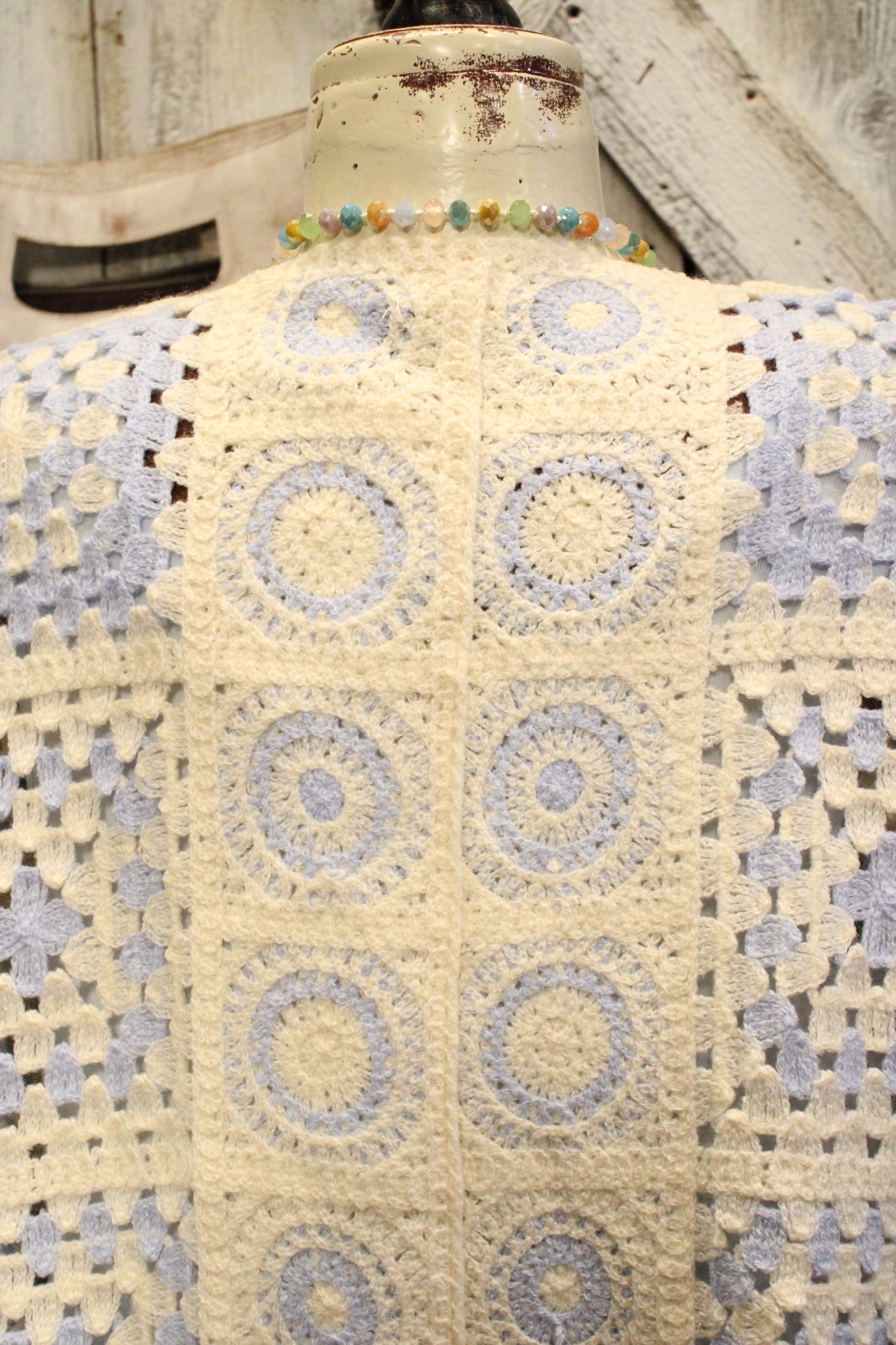 Introducing the Blue Skies Crochet Kimono- This dreamy crochet kimono is pure farm-girl boho charm, made for easy layering and effortless style. Designed with a relaxed, open-front silhouette, it features a soft granny-square inspired crochet pattern in creamy neutrals with subtle blue accents that give it that vintage-meets-modern feel. The airy knit adds just the right amount of texture without feeling heavy, making it perfect to throw on over a lace tank, graphic tee, or simple dress. With its slightly cropped length and wide sleeves, this kimono drapes beautifully and brings a laid-back, cozy vibe to any outfit—from farmers market mornings to sunset porch hangs. It’s the kind of piece you’ll reach for again and again to add that perfectly undone boho touch.