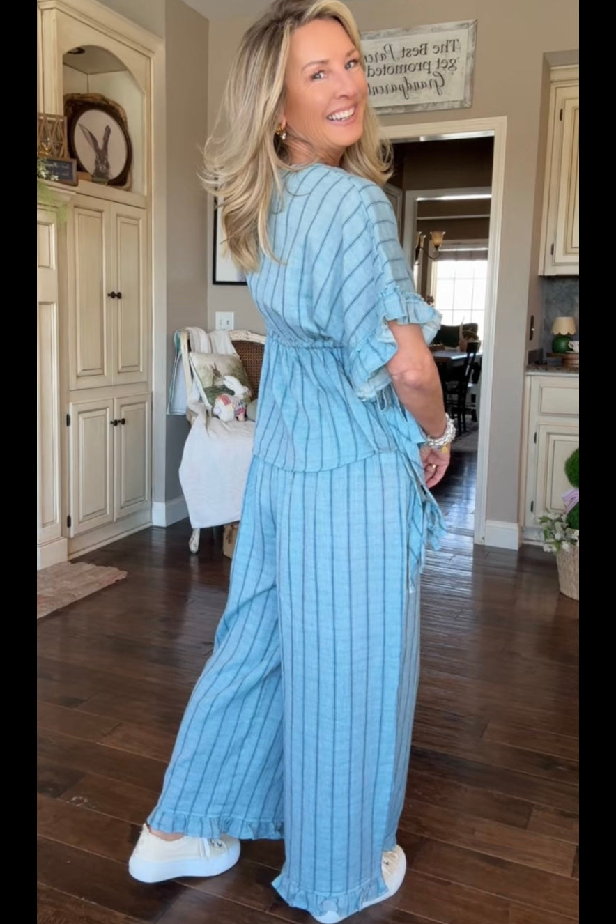 Introducing the Bluebell Breeze Cotton Pants by Easel, Easy, breezy, and made for laid-back days. These lightweight cotton pants feature a soft blue stripe pattern, a comfortable smocked elastic waistband, and relaxed wide legs for effortless movement. Front patch pockets with adjustable tie details add a touch of charm, while the ruffled hem gives them a playful finish. Perfect for pairing with the matching top or styling with your favorite tee for a relaxed, everyday look.