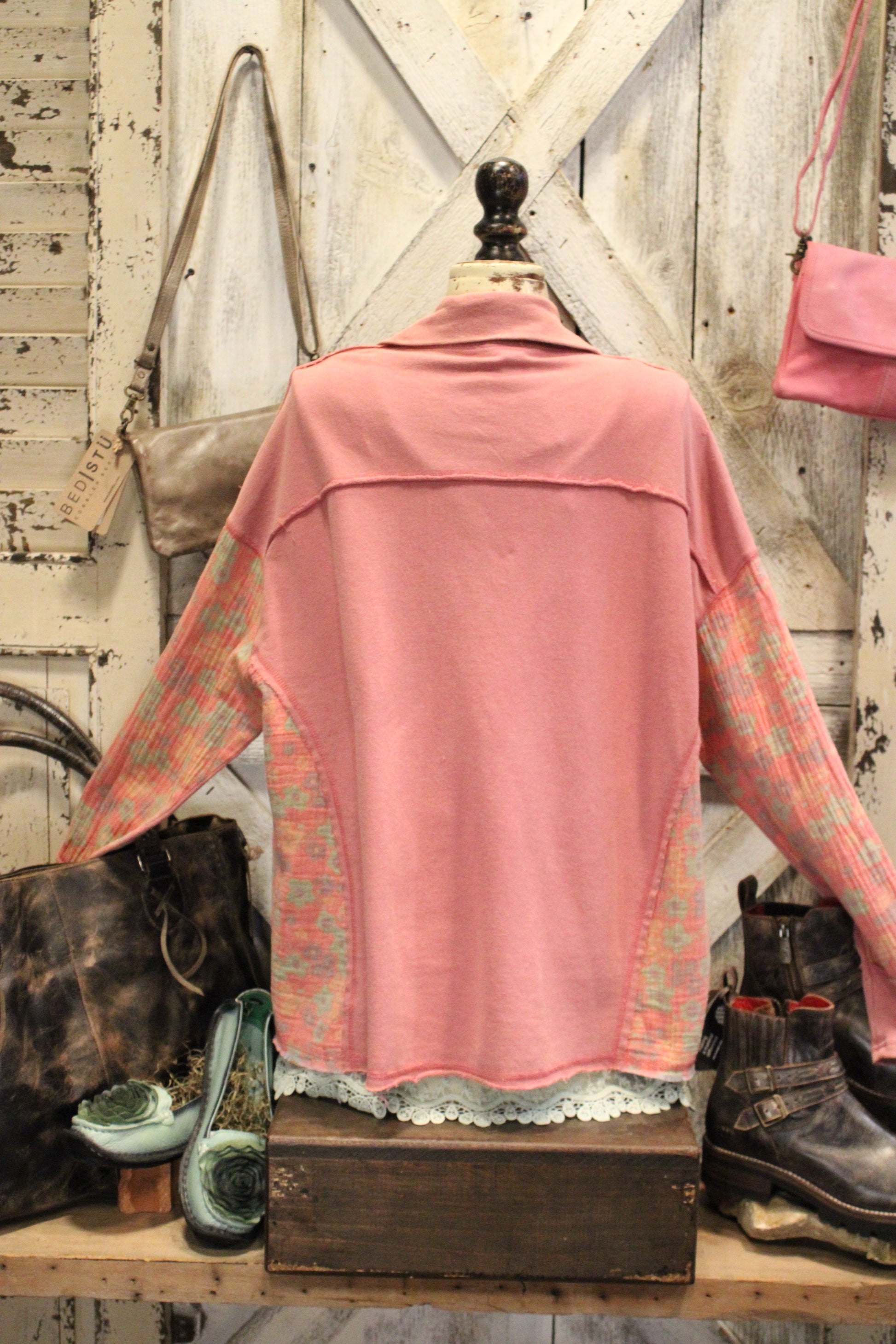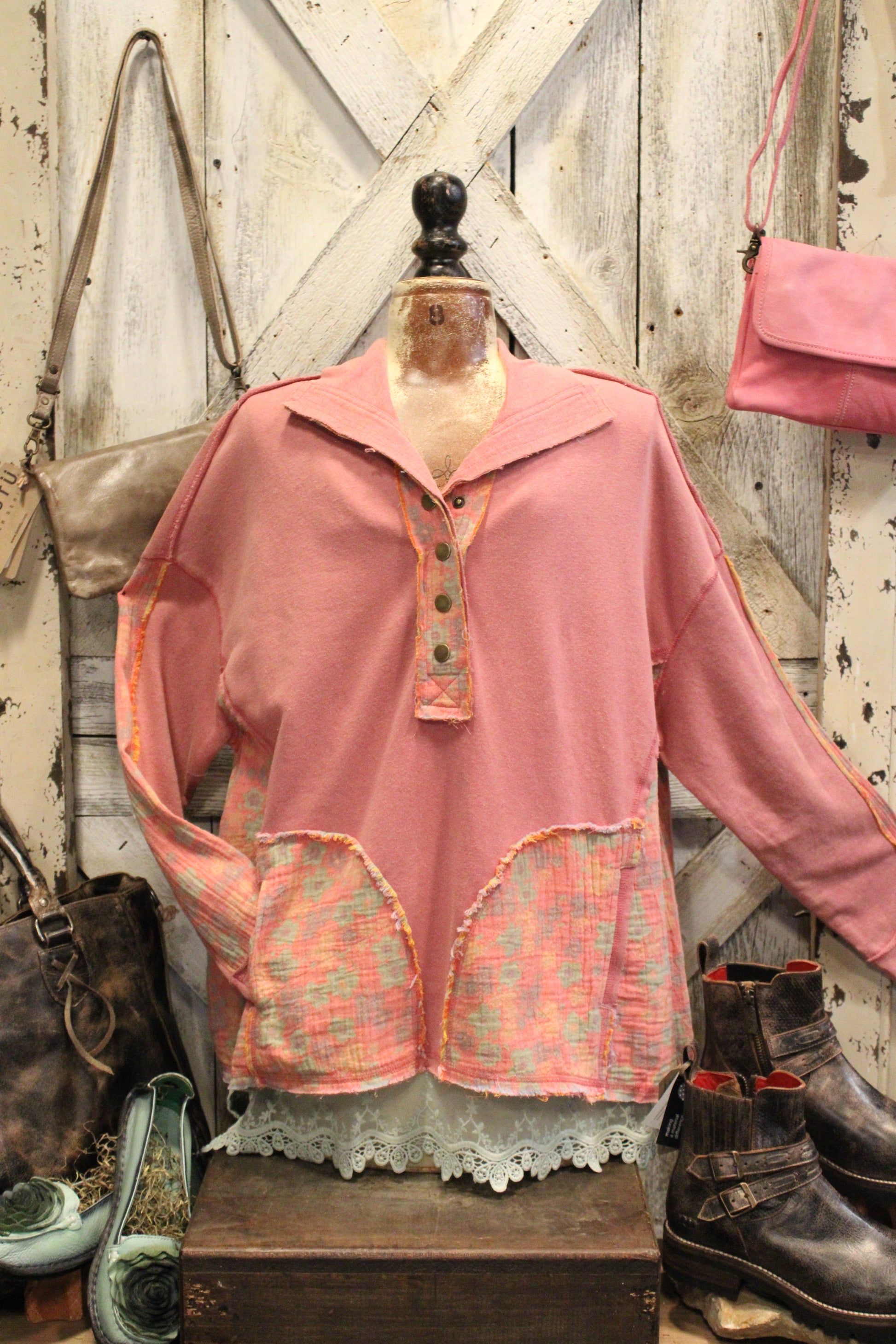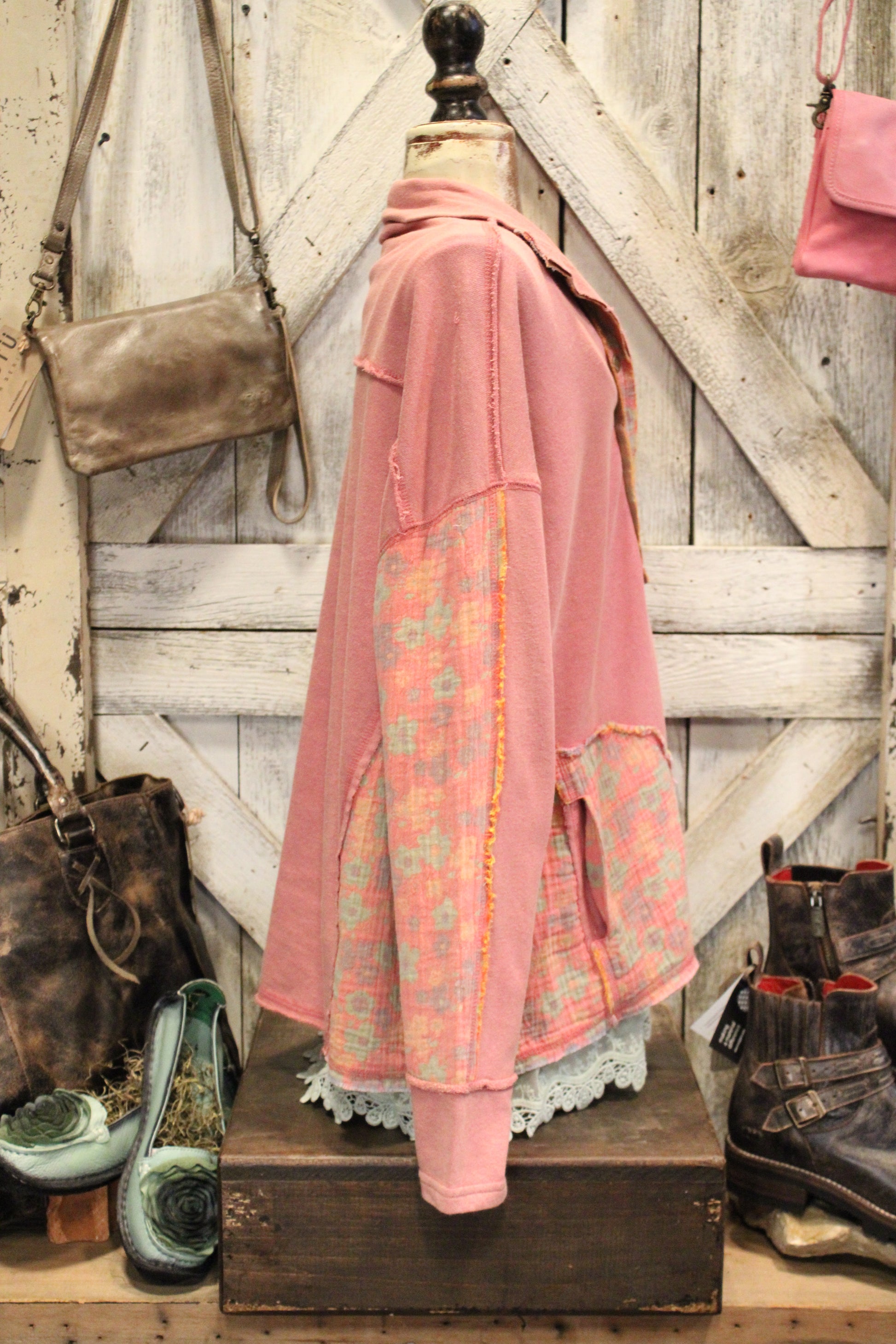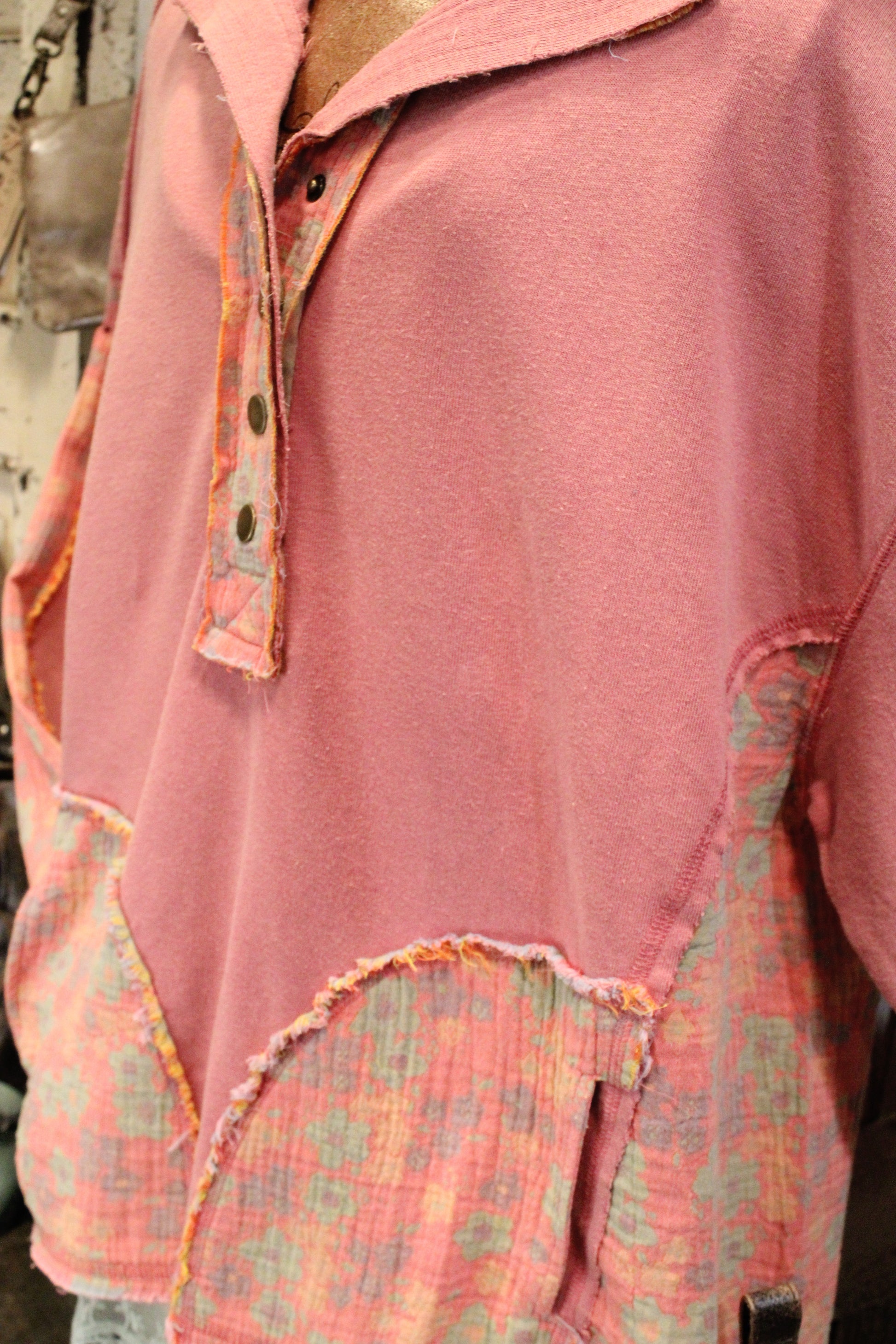 Introducing the Boho Dream Patchwork Pullover- a soulful blend of comfort and bohemian artistry. Dyed in a soft, sun-faded dusty rose, this top is all about relaxed vibes and artisan spirit. Featuring raw-edge patchwork in sunset-hued woven panels, every detail feels like a story—imperfect, earthy, and beautifully worn.