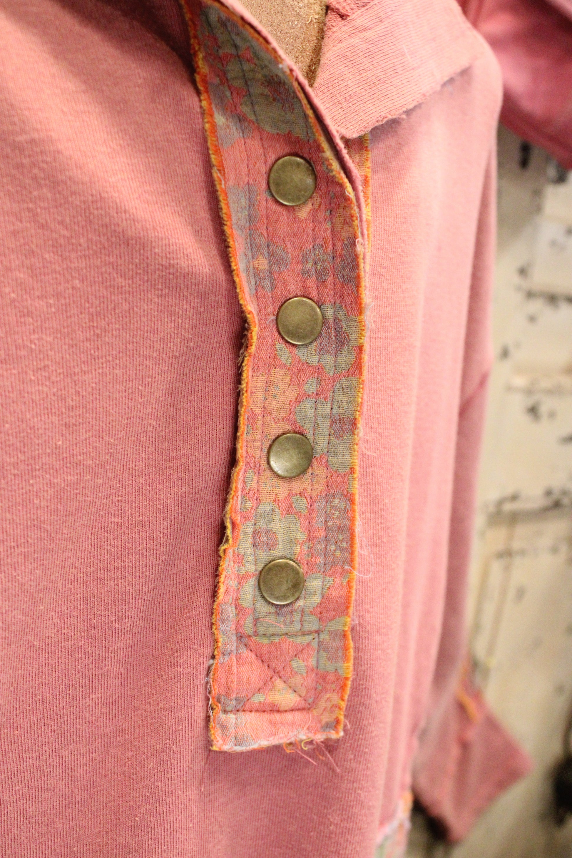 The slouchy silhouette, dropped shoulders, and oversized front pockets invite you to slow down and soften into the moment. Buttons at the neckline add a rustic touch, while the textured sleeves and contrast stitching whisper of faraway markets, desert trails, and quiet mornings with tea in hand.