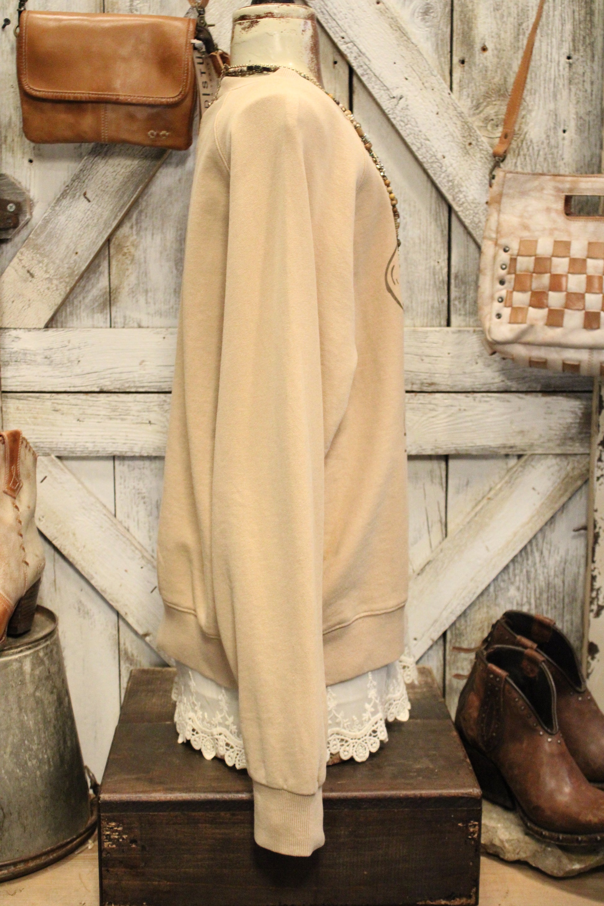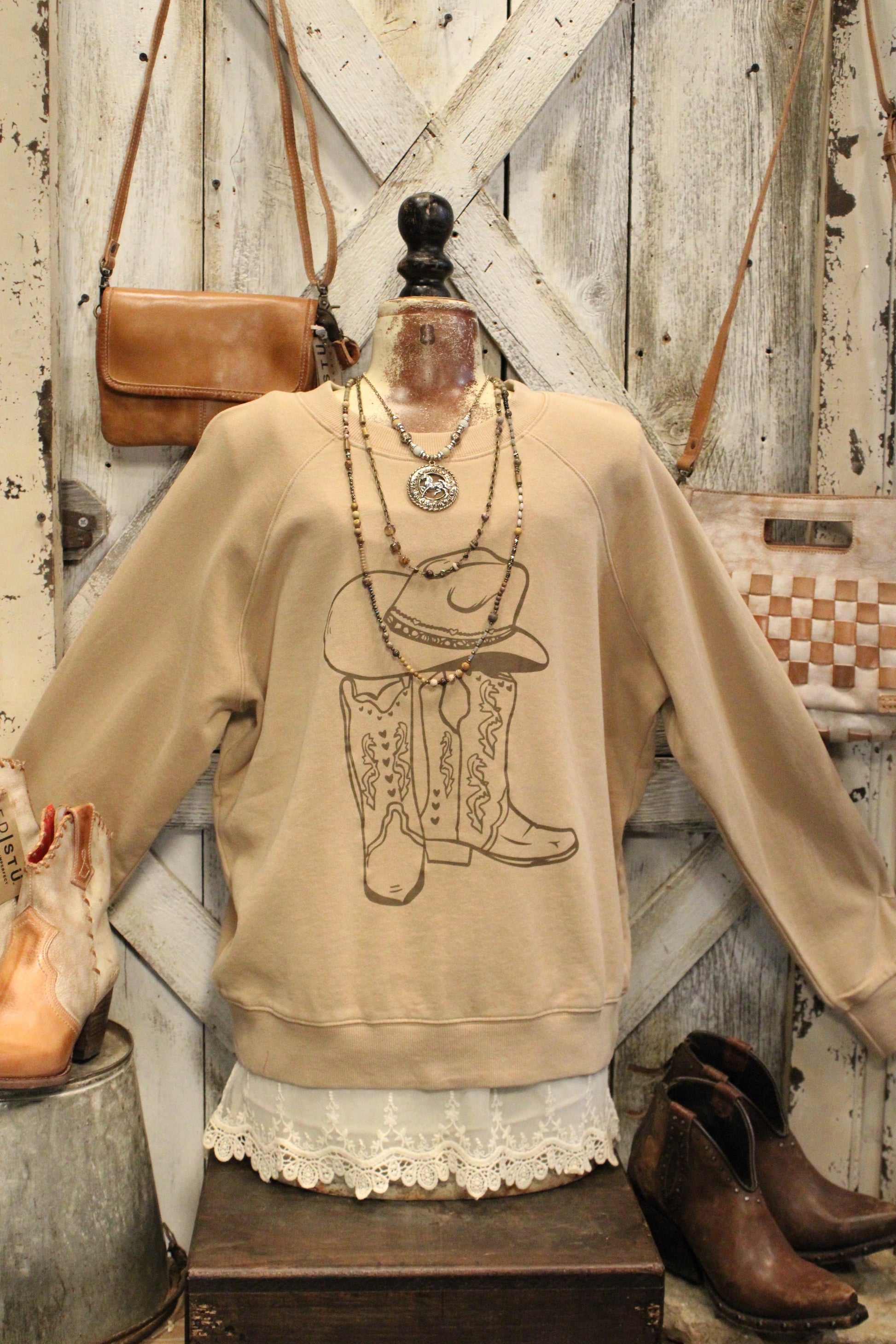 Introducing the Boots And Brim Cotton Sweatshirt- This cozy farm-girl sweatshirt brings all the Western charm with a laid-back, everyday feel. Featuring a neutral tan hue and a sweet cowboy boot and hat graphic, it’s the kind of piece that feels right at home from the barn to the coffee shop. The soft sweatshirt fabric offers an easy, relaxed fit that’s perfect for layering, while the classic crew neckline keeps it timeless and wearable. Style it with lace peeking out underneath, your favorite denim, or leggings and boots for that effortless country-chic look. It’s comfortable, cute, and full of rustic personality—just the way we like it.