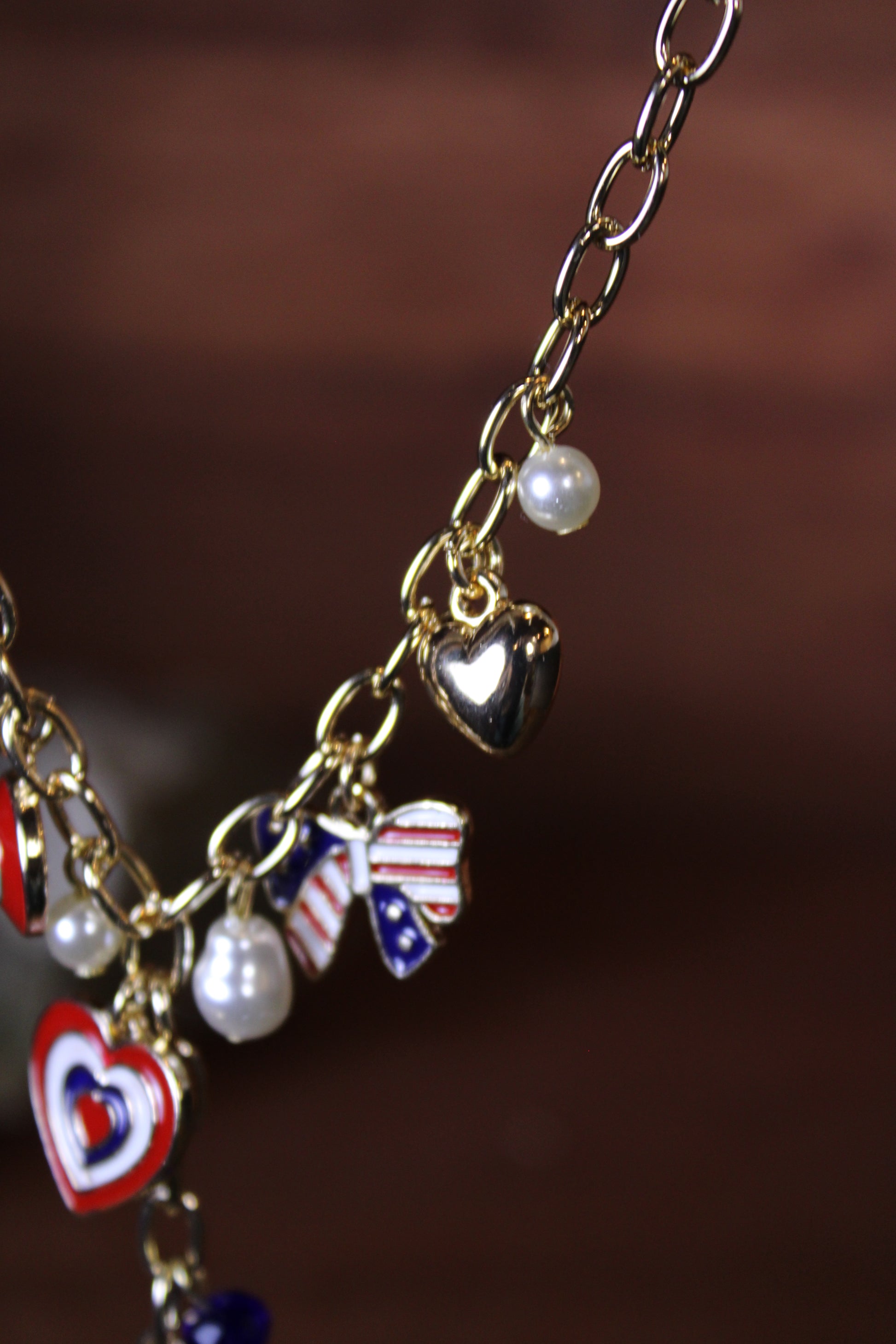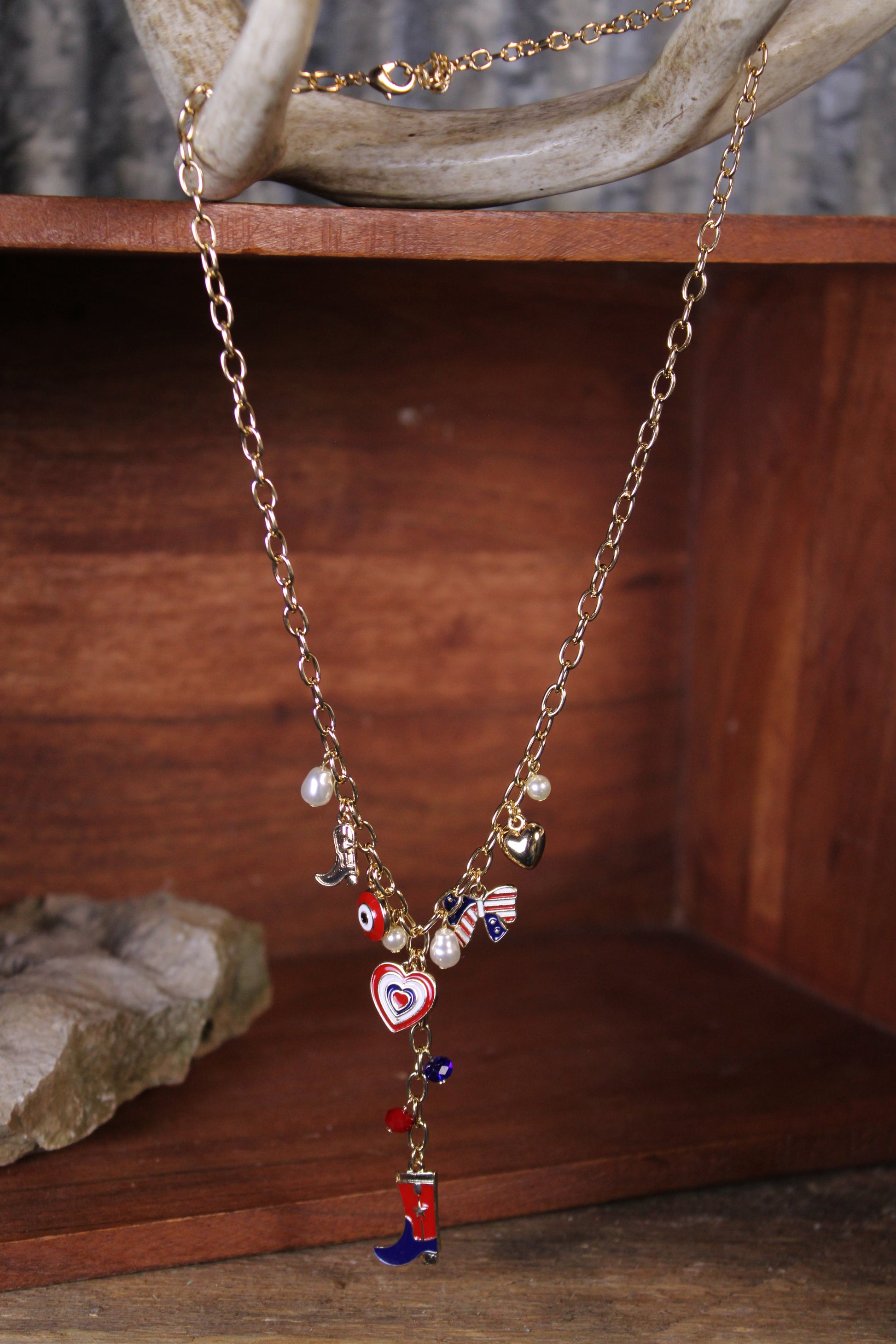 Step up your accessory game with the stylish Boots, Bows, And Liberty Necklace! This patriotic charm necklace is made for your red, white, and cute moments. Featuring a gold chain with playful Americana-inspired charms—hearts, bows, pearls, and a statement boot—it adds the perfect pop of personality to any outfit. Lightweight and eye-catching, it’s your go-to piece for summer styling, holidays, and everyday sparkle with a little country flair.