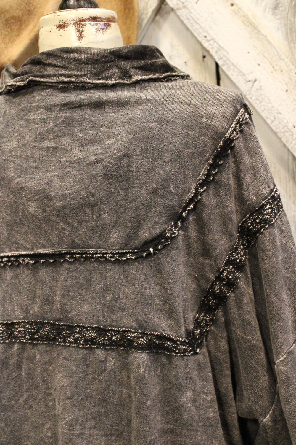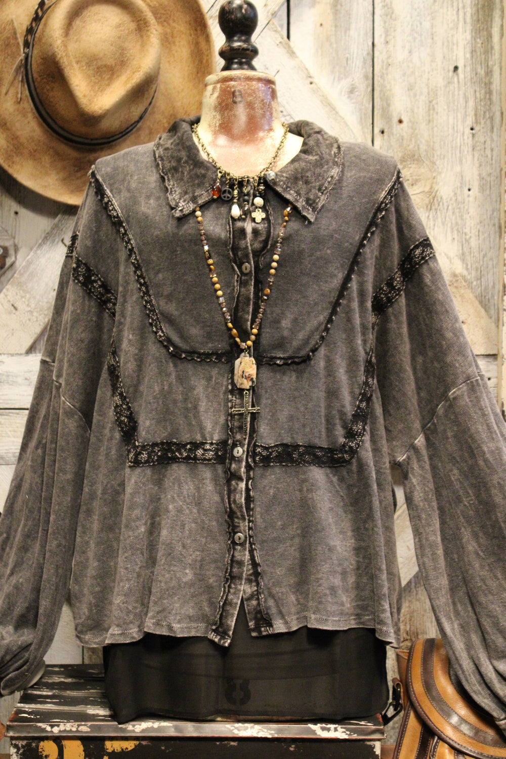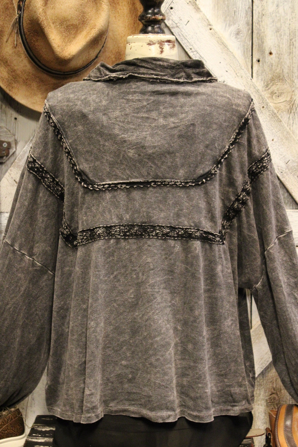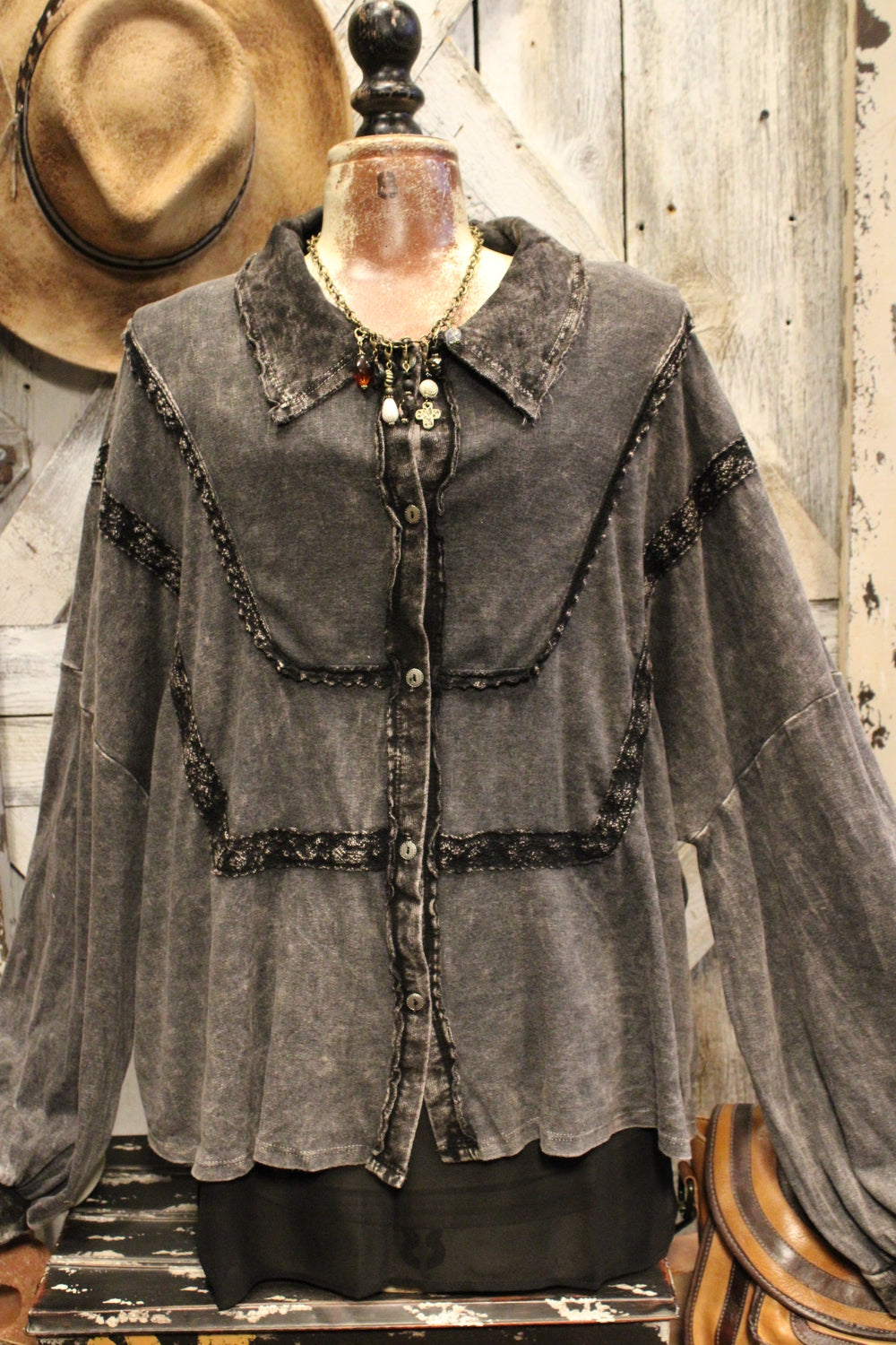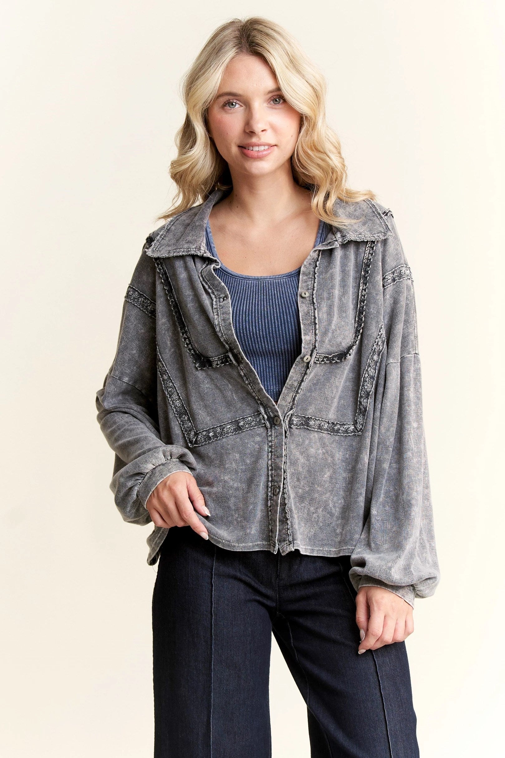 Introducing the Bounce Back Black Blouse-This relaxed button-up blouse brings laid-back ease with just the right touch of detail. Featuring soft washed fabric, subtle lace trim accents, and a flowy silhouette, it’s the perfect piece to dress up or down. Wear it buttoned or open over your favorite tank or tee for a versatile, everyday look.