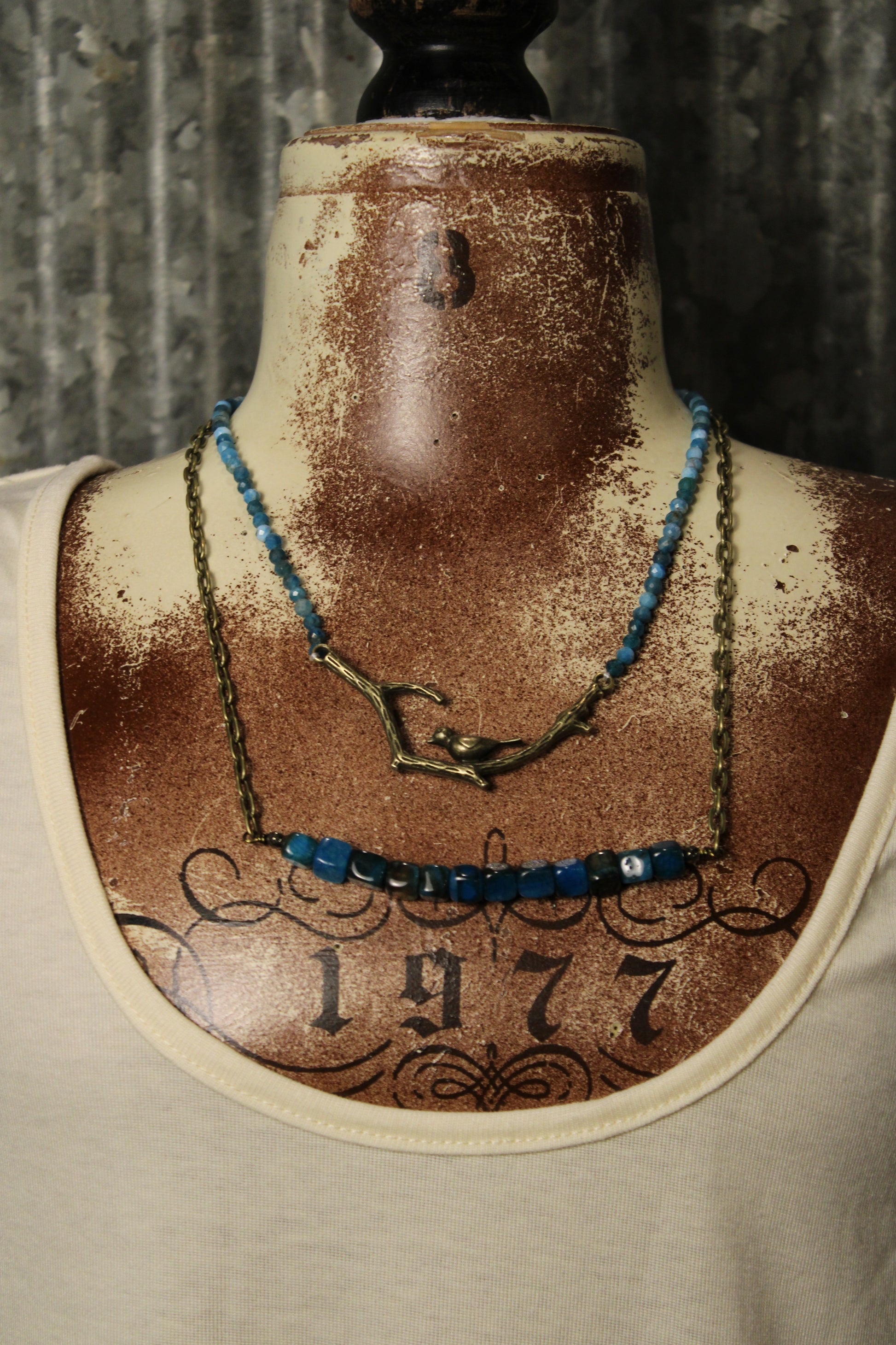 Introducing the exquisite Braelyn Blue Fire Agate Necklace, A little nature, a little charm—this layered necklace is full of unique detail. Featuring mixed blue-toned beads paired with antique-inspired chain accents, it’s finished with a delicate bird on a branch centerpiece for a subtle statement. The layered design gives it an effortlessly styled look, perfect for adding depth and interest to any outfit. A beautiful piece for everyday wear with a touch of rustic, nature-inspired flair.