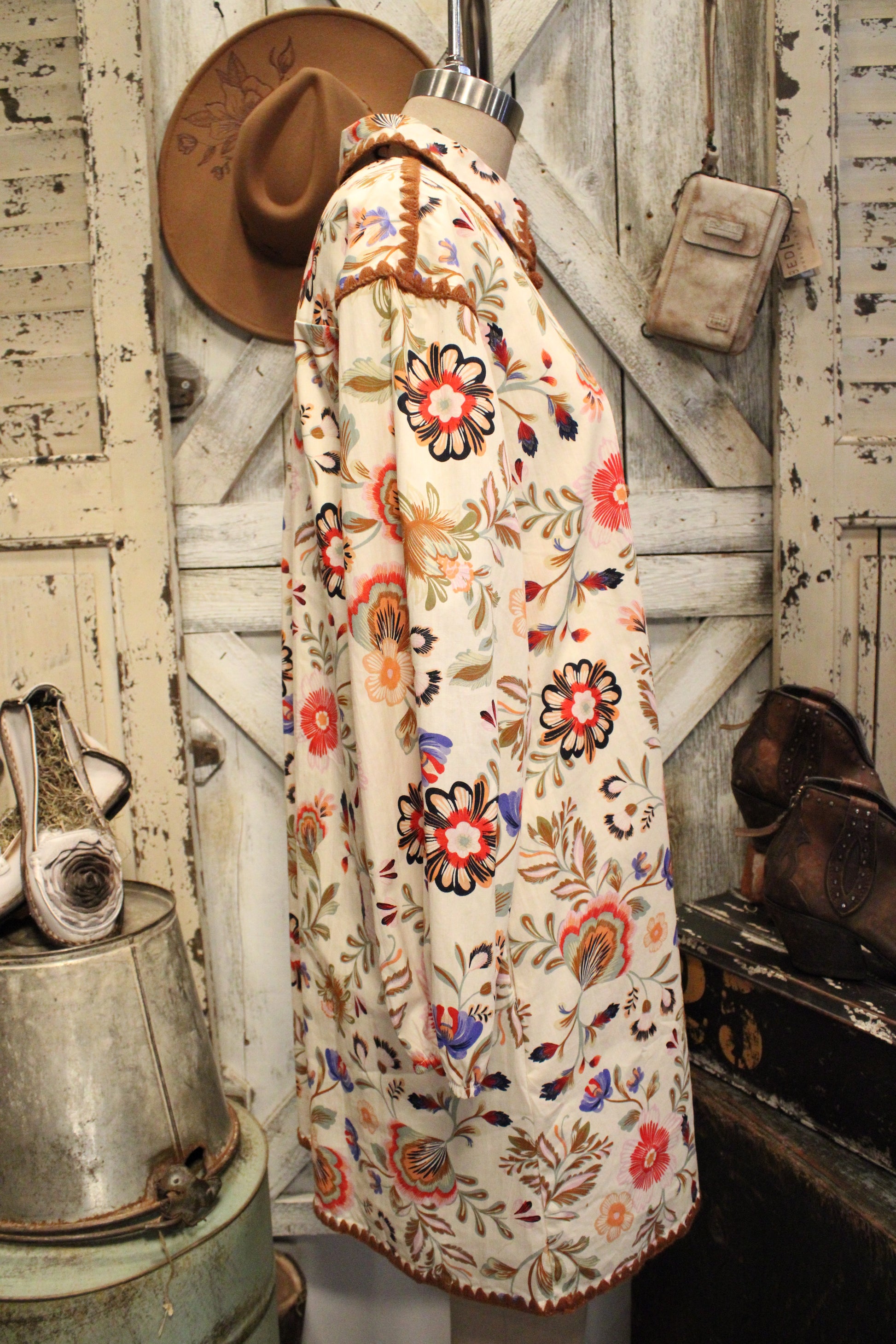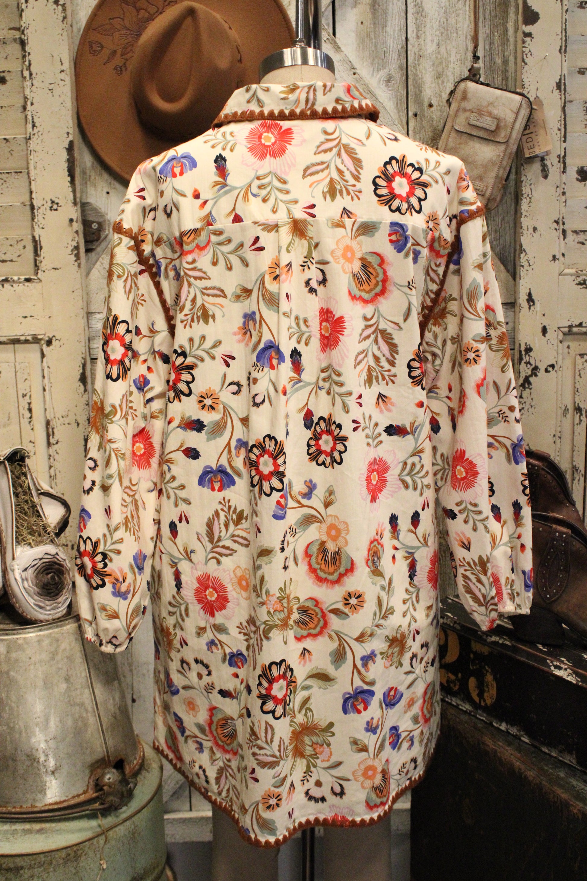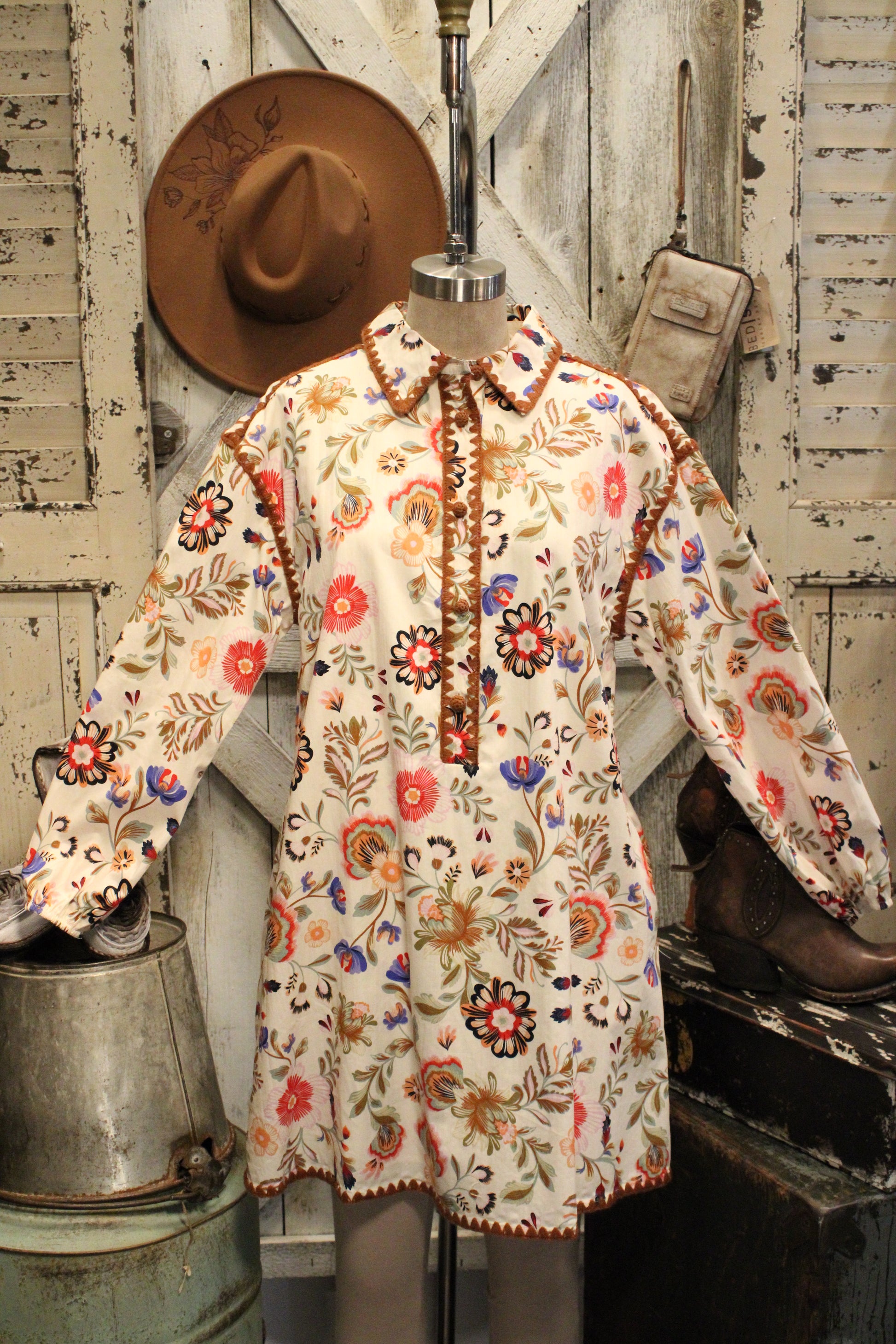 Introducing the Brownstone Bouquet Dress- Meet the dress that feels like stepping into a blooming summer meadow. This Wildflower Prairie Tunic Dress is filled with charm from top to bottom, featuring a cream background covered in vibrant florals that look hand-painted and softly vintage. Warm corals, soft blues, earthy greens, and bold blossoms create a garden-inspired palette that’s both cheerful and timeless.