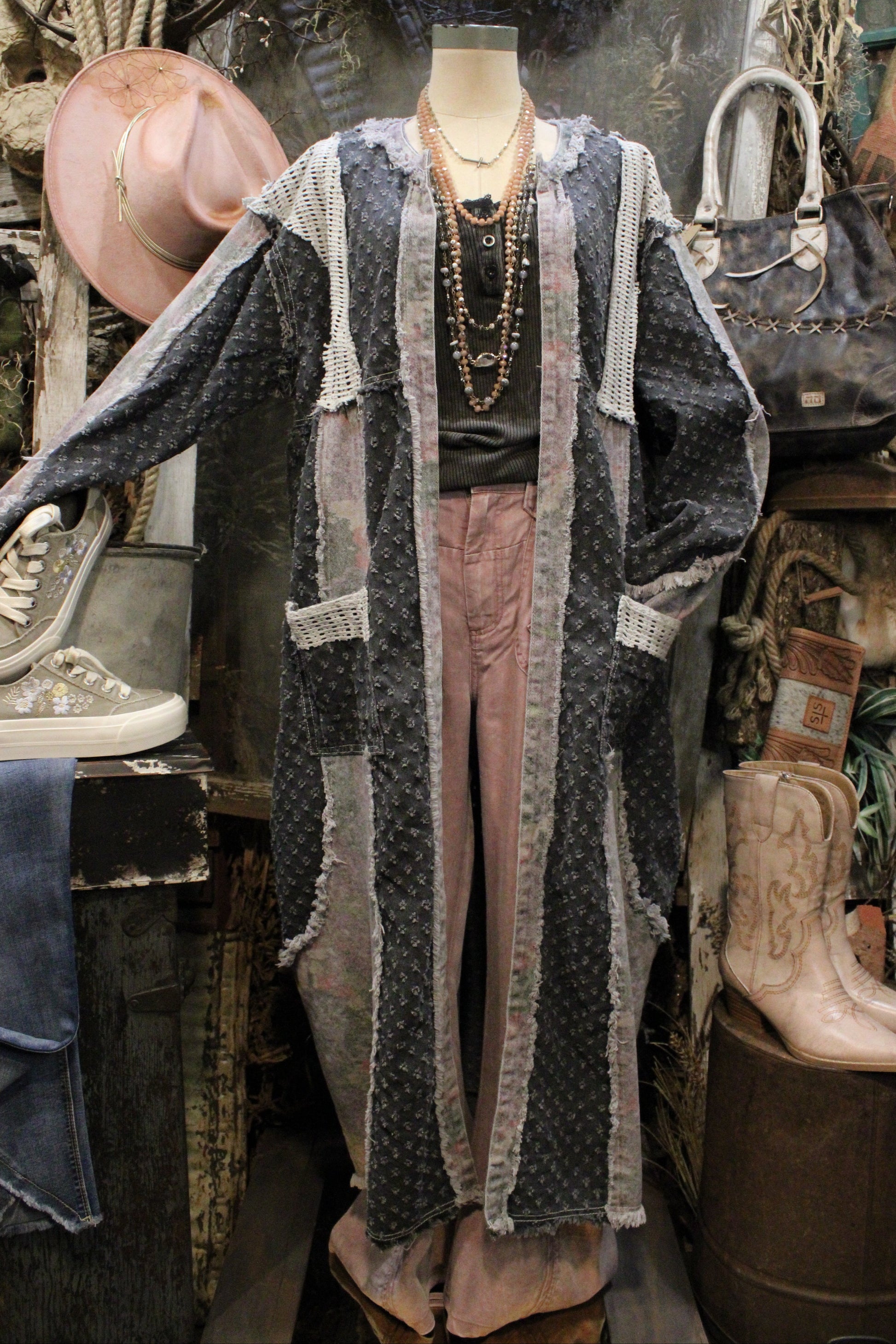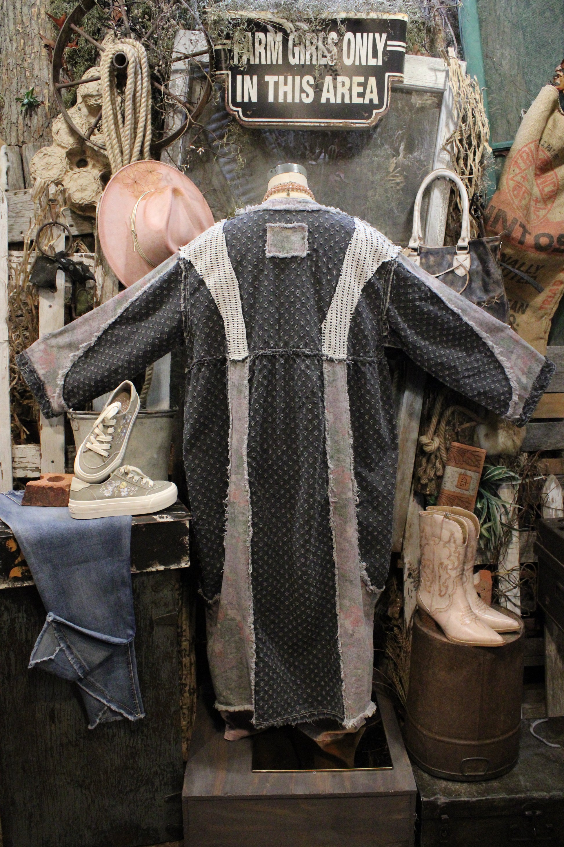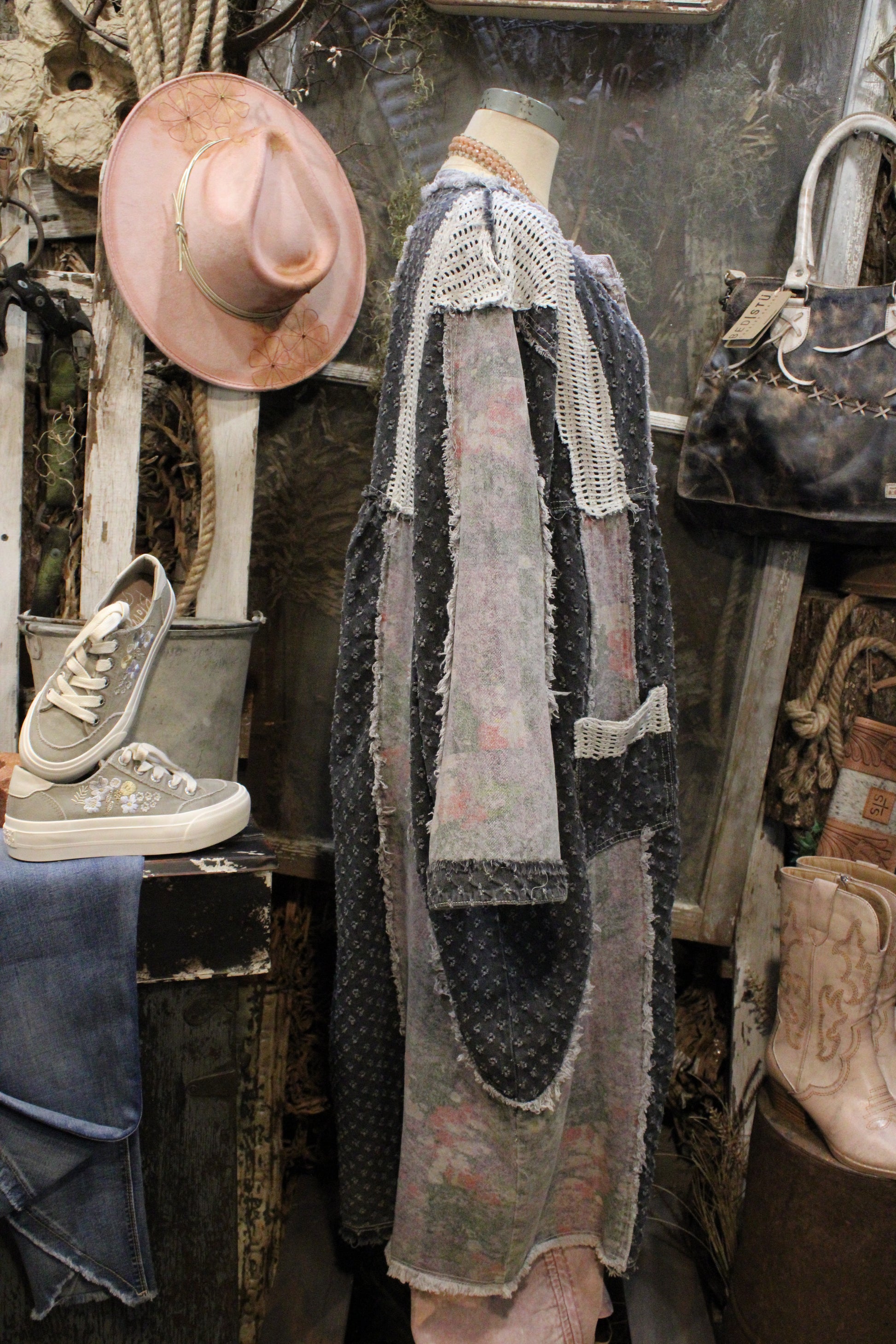 Introducing our Bullet Proof Maxi Duster - Wander freely and layer boldly! This statement piece is rich with vintage-inspired character and eclectic charm. Crafted from a mix of textured fabrics and tonal floral prints, this longline open-front duster features intentional patchwork detailing, crochet panels, and raw-edge seams for a lived-in, one-of-a-kind feel.