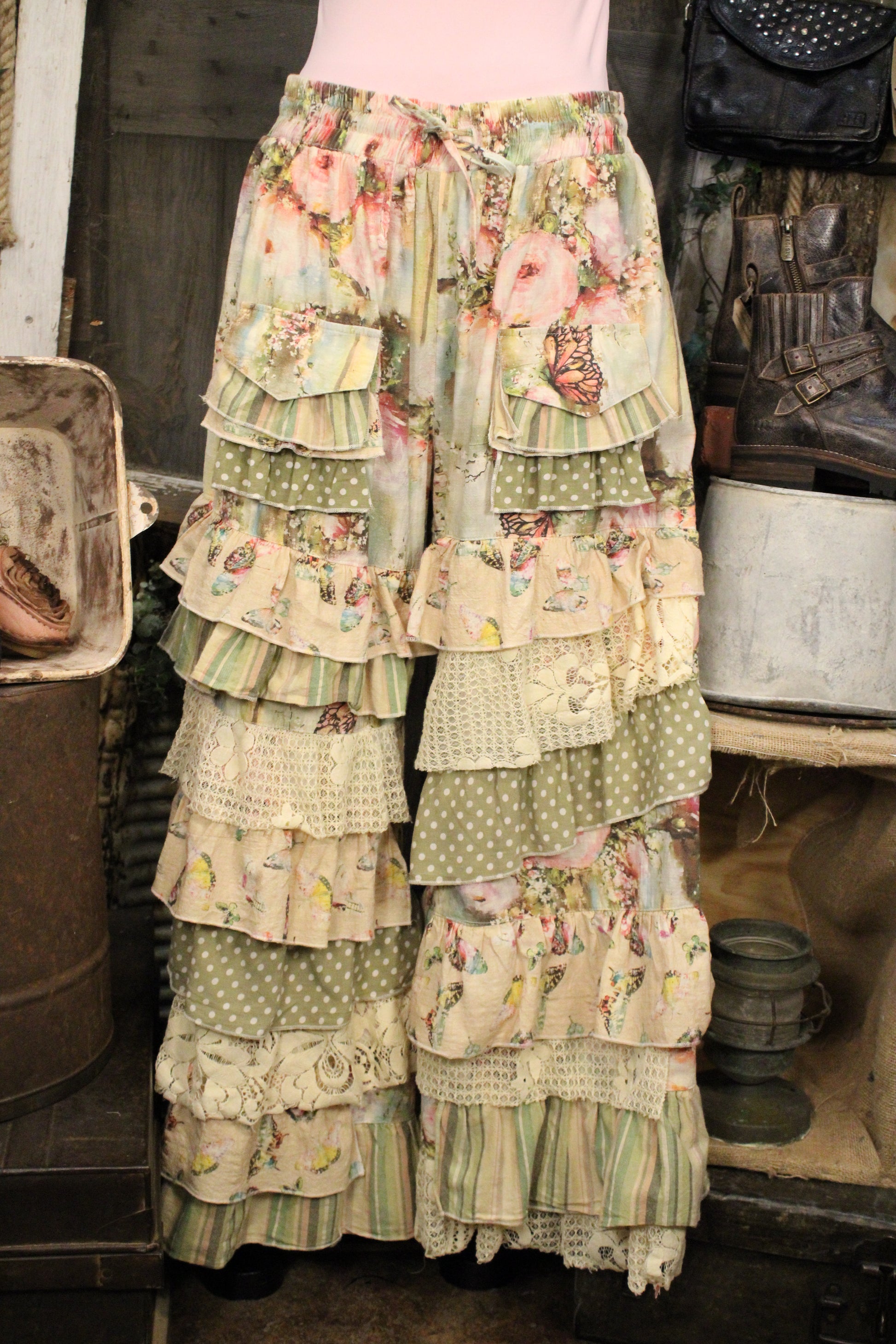 Introducing our stylish Butterfly Ruffle Pants, perfect for adding a touch of flair to your wardrobe! A true wearable piece of art from A Rare Bird, these tiered patchwork pants are designed for the woman who loves expressive, one-of-a-kind style. Crafted with layers of mixed florals, lace, soft stripes, and vintage-inspired prints, every detail feels thoughtfully curated. The elastic drawstring waist offers an easy, comfortable fit, while the wide flowing legs create dramatic movement and an effortlessly romantic silhouette. Rich textures and handcrafted character make these pants feel like a collectible piece rather than everyday denim. Pair them with a simple top and let the artistry speak for itself — these are the statement pants your wardrobe will revolve around.