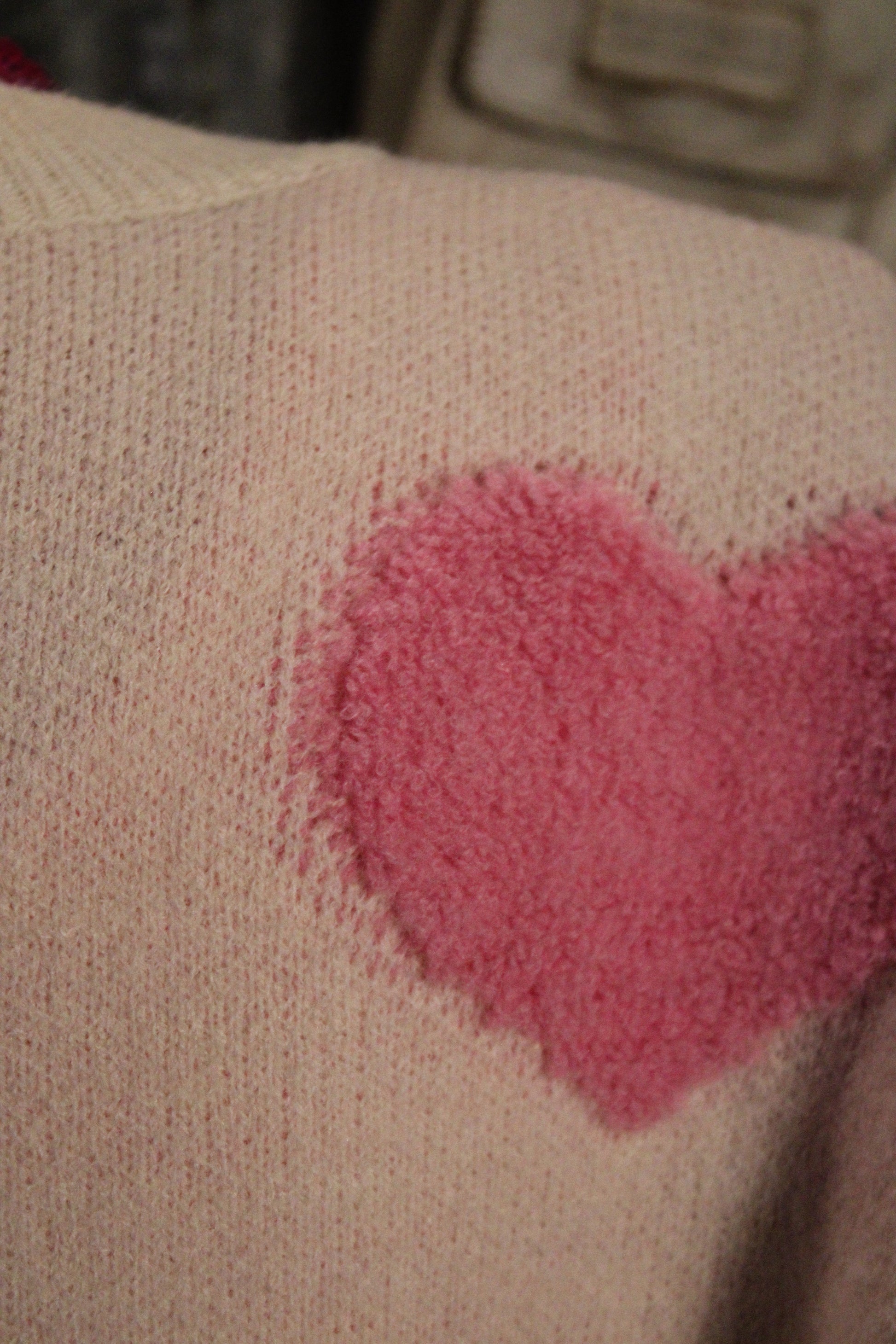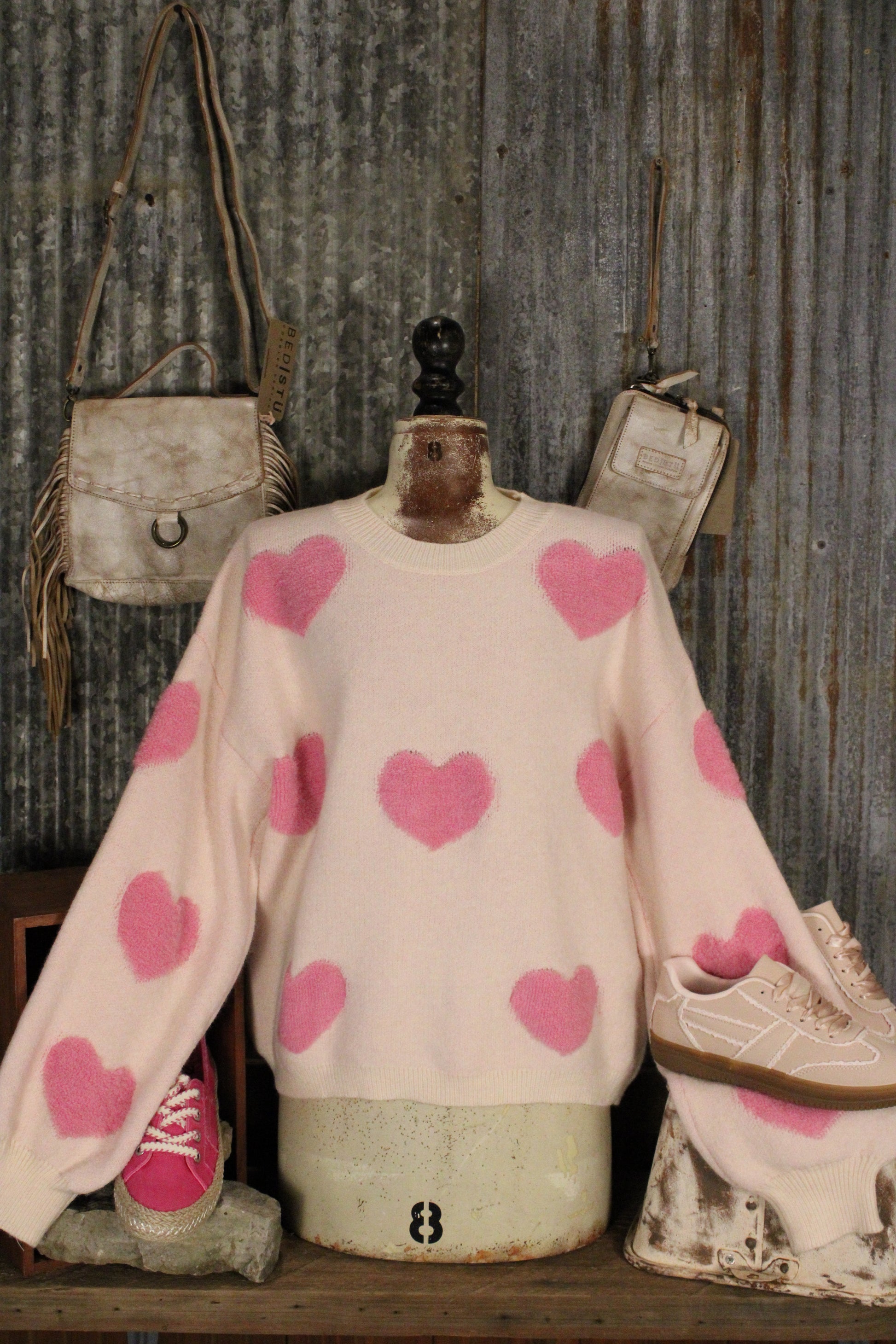 Sweet, cozy, and full of charm, this heart sweater is the perfect way to add a little love to your everyday look. Featuring soft pink hearts on a creamy neutral base, this sweater brings playful personality with an easy, wearable feel. The relaxed fit and classic crew neckline make it perfect for layering or styling solo with denim, skirts, or boots.
