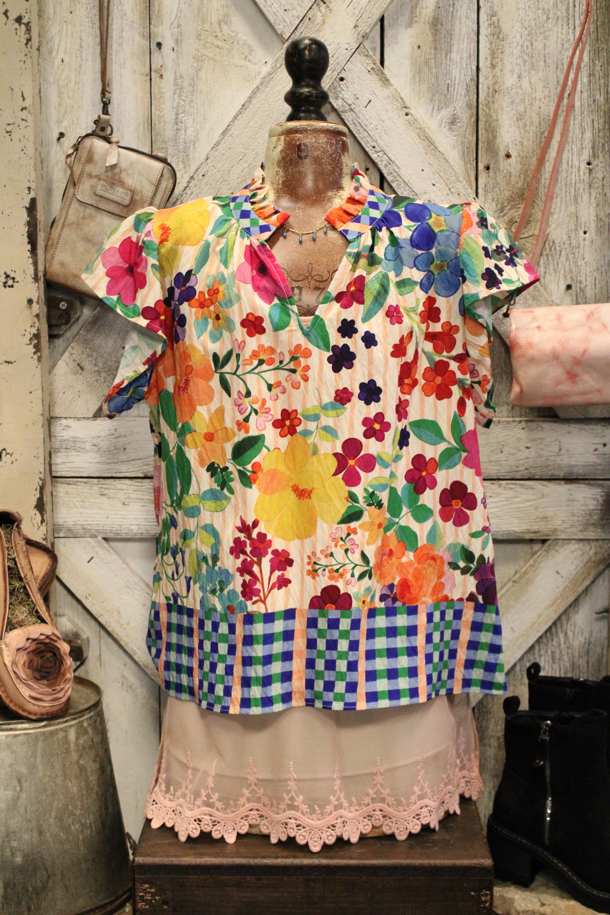 Introducing the Carnival Bloom Blouse- This cheerful floral top is pure sunshine for your everyday wardrobe. Designed with a relaxed, easy fit, it features a playful mix of colorful blooms and contrasting prints that give it that effortlessly artsy, farm-girl-boho charm. The soft v-neckline and flutter sleeves add a flattering, feminine touch, while the patterned hem brings just the right amount of personality.