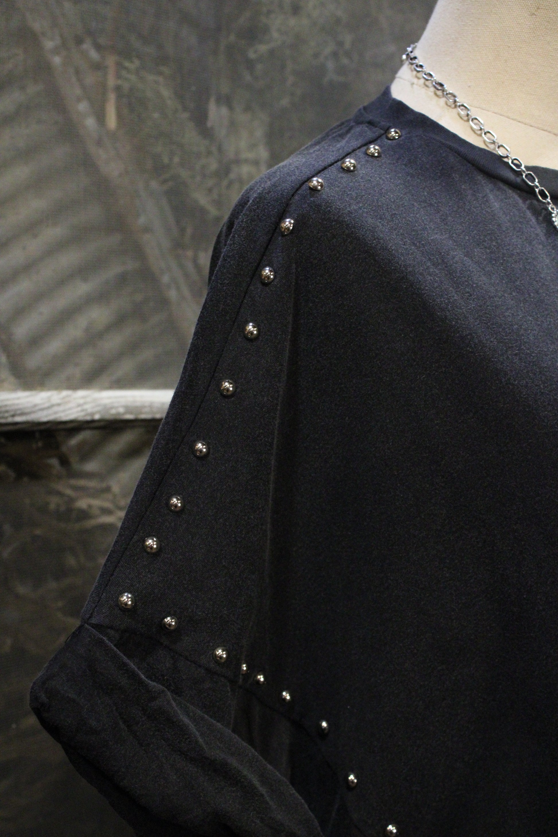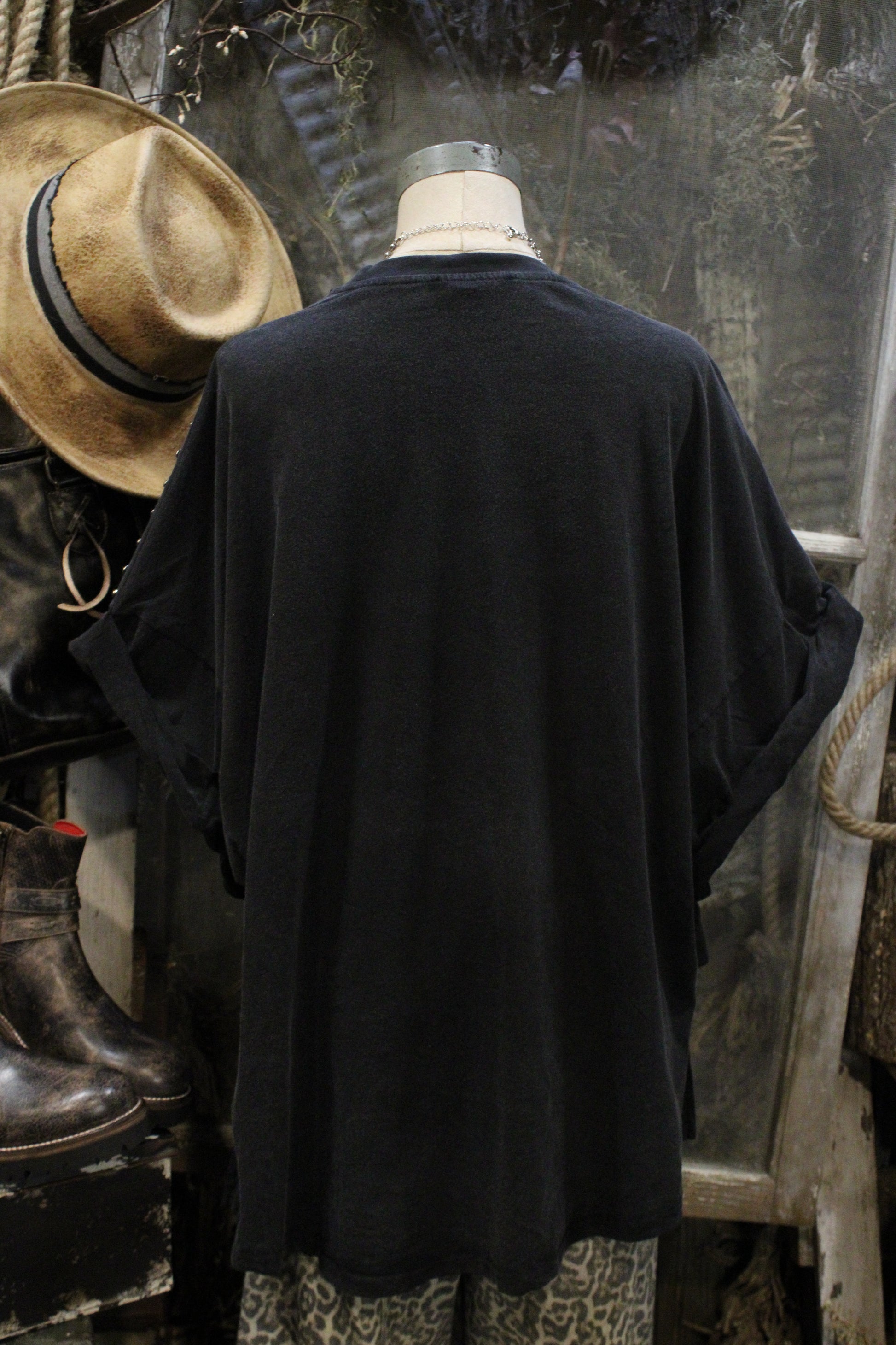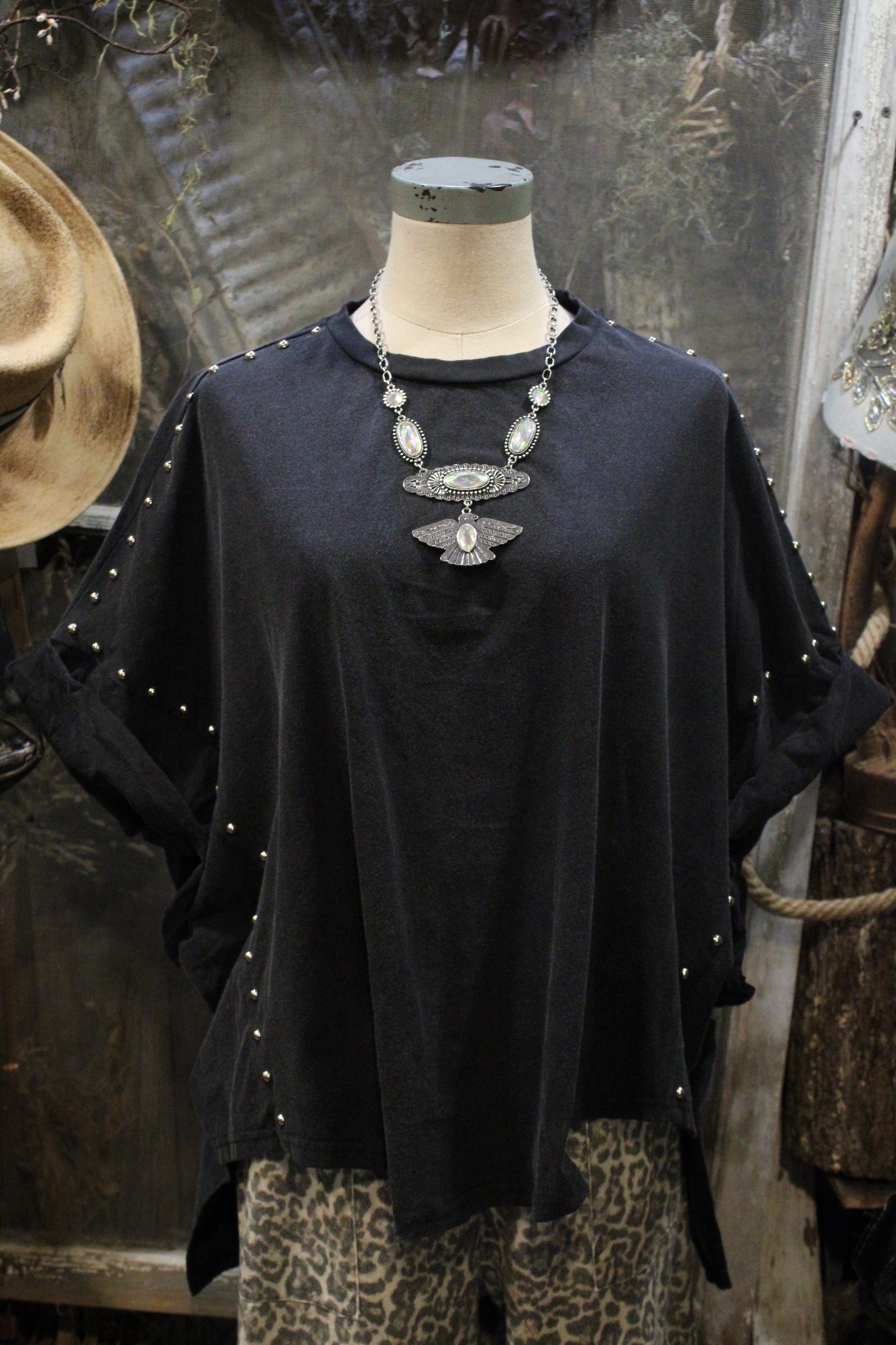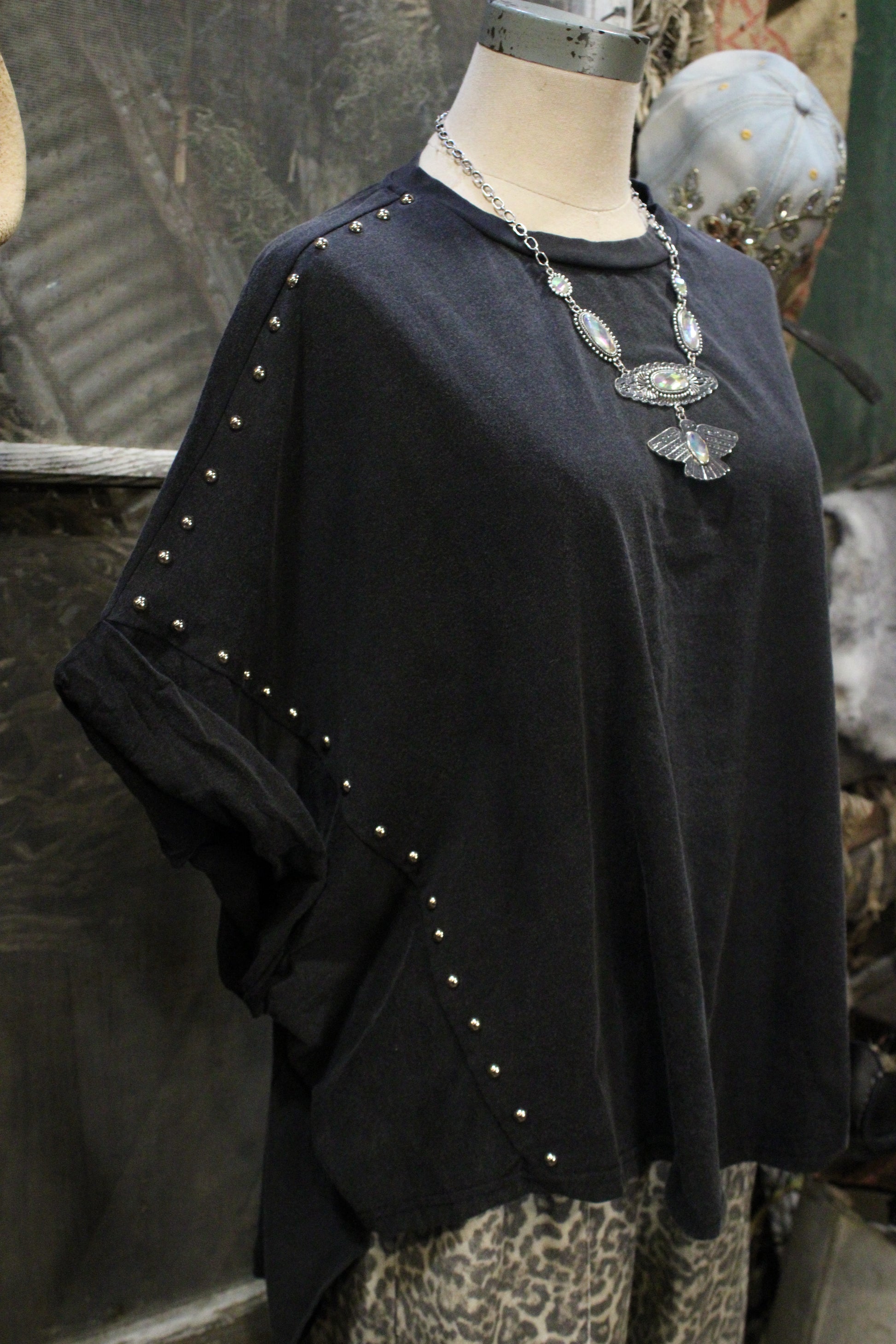 Introducing our Casual Jazzy Top - a bold yet laid-back piece that brings just the right amount of attitude. This oversized black top features a relaxed poncho-style cut, finished with rolled sleeves and a scattered stud detail along the sides and arms that gives it a touch of rugged glam.