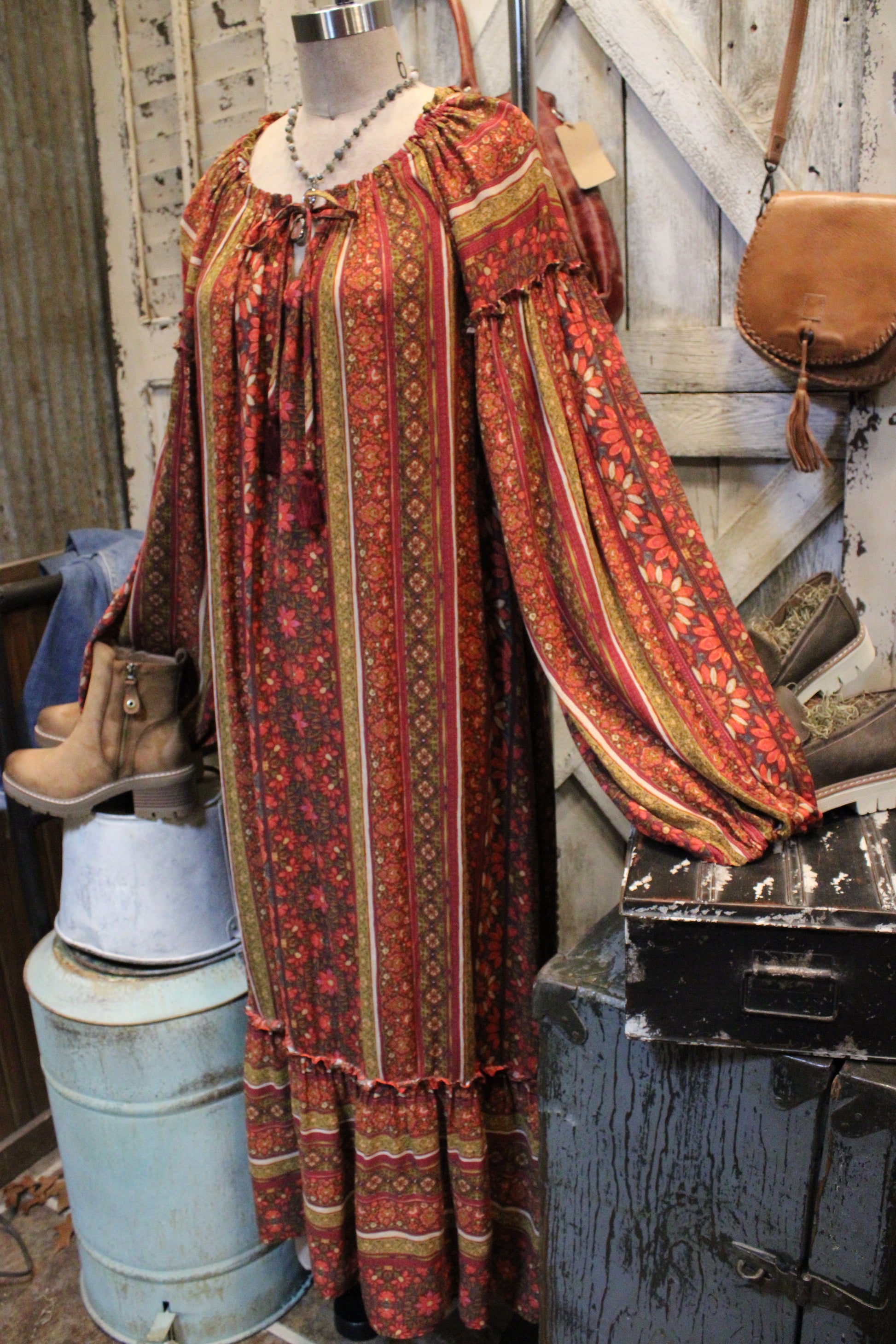 Introducing the Cherrywood Charm Dress- A dreamy mix of bohemian charm and rustic fall tones — this dress is made for twirling through the season. Featuring a flowy silhouette, tiered hem, and billowy sleeves, it brings effortless movement and comfort while keeping you chic and cozy. The rich cherry wood print blends warm reds, golds, and earthy hues that pair beautifully with your favorite boots.