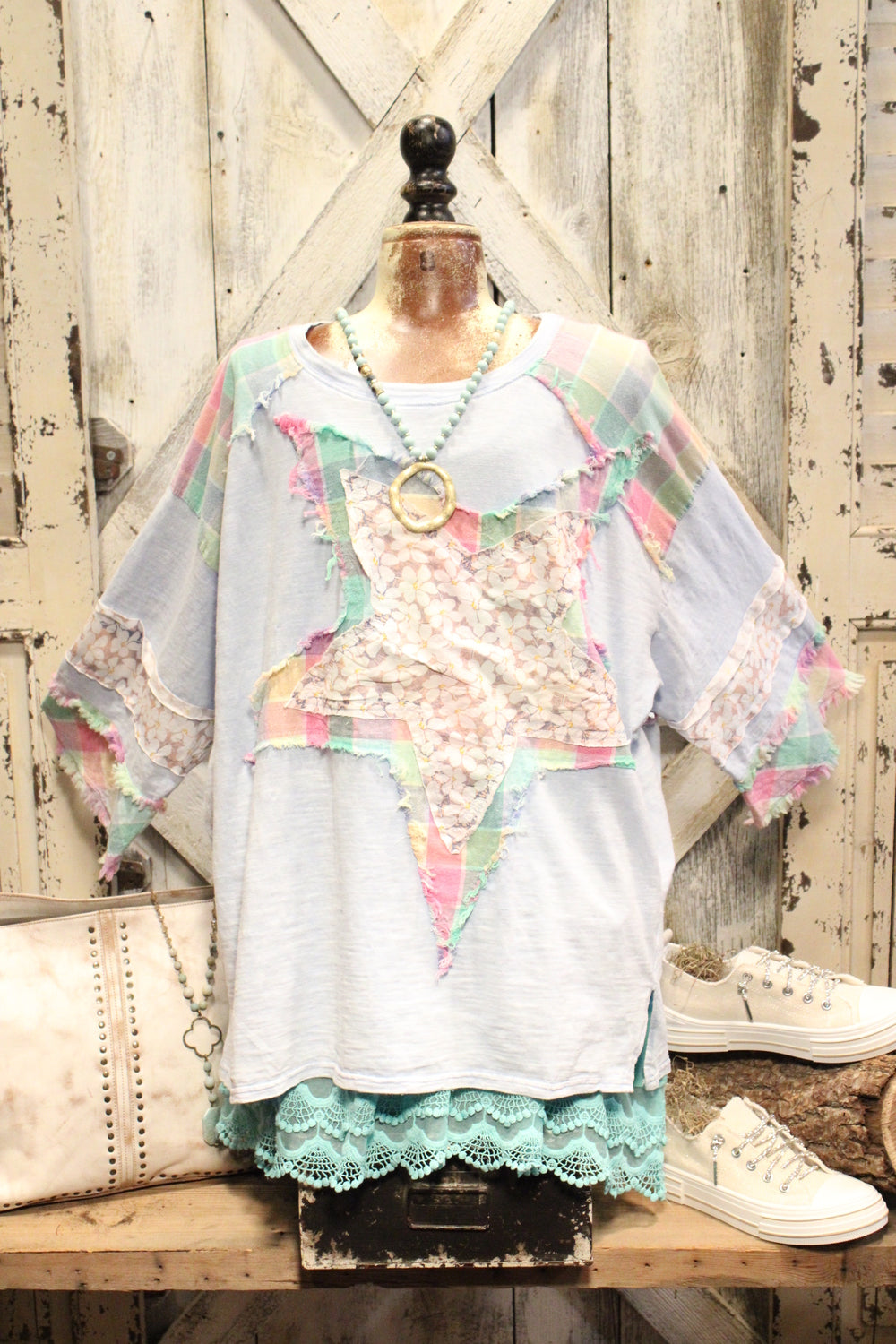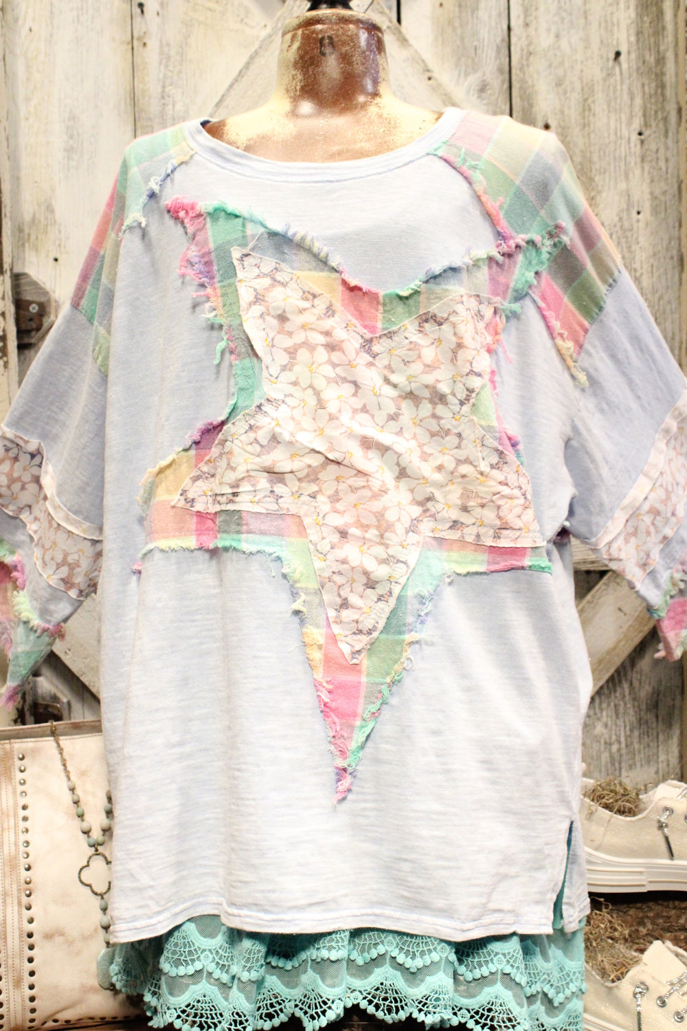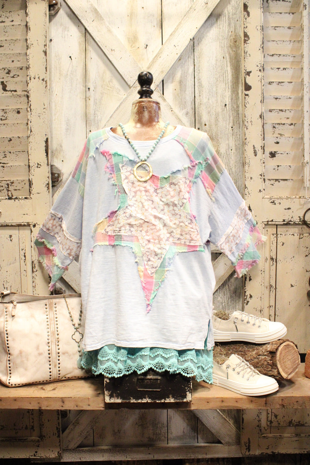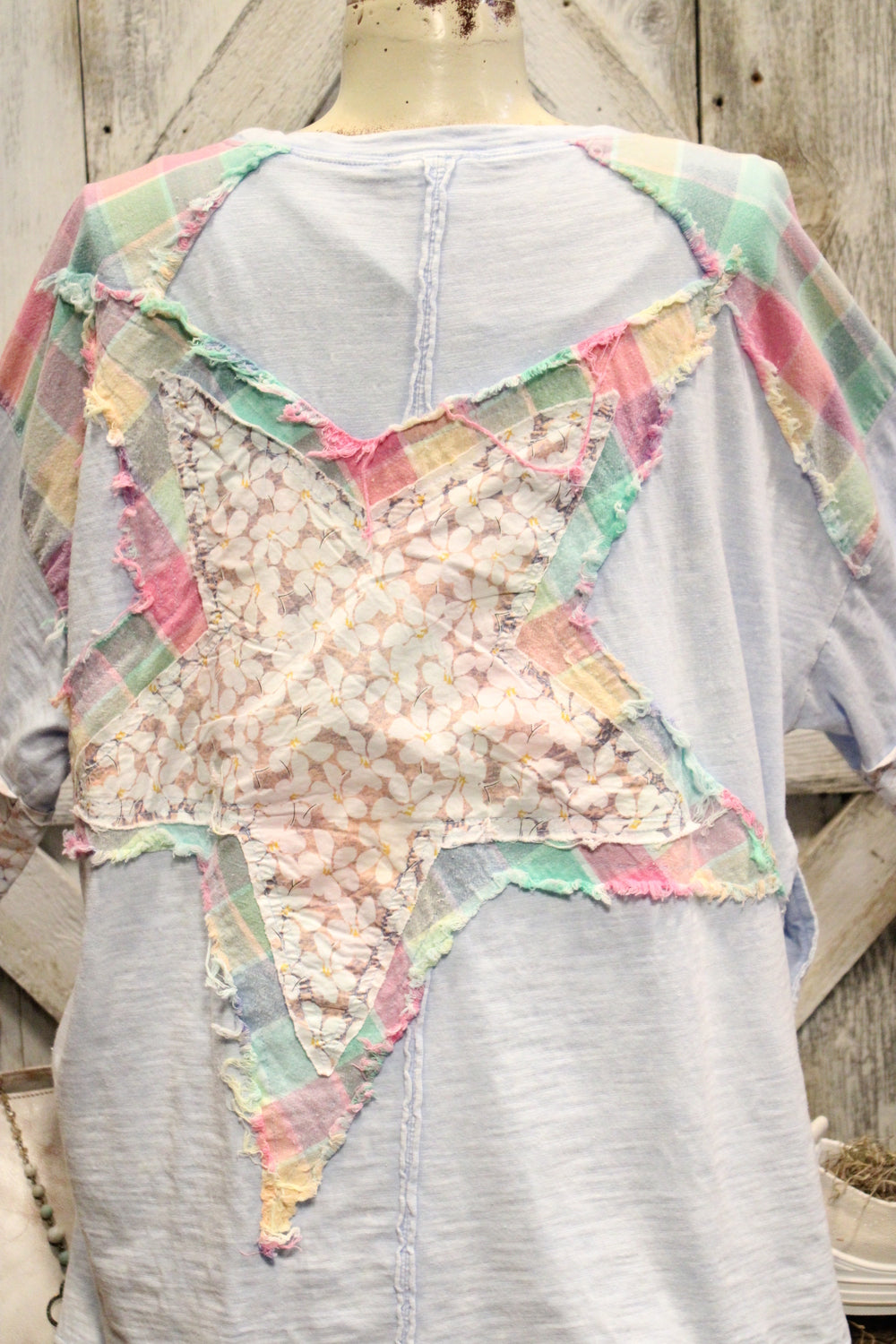 Introducing the Cosmic Cotton Casual – where comfort meets star-powered style. This relaxed-fit tunic features a soft, lightweight cotton fabric with a bold patchwork star front and center, crafted from pastel plaid and floral fabrics with raw, frayed edges for added texture. Whether you're headed to brunch, the market, or just embracing your inner daydreamer, this piece brings the perfect dose of whimsy and ease.