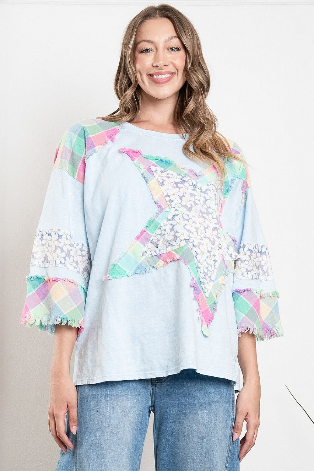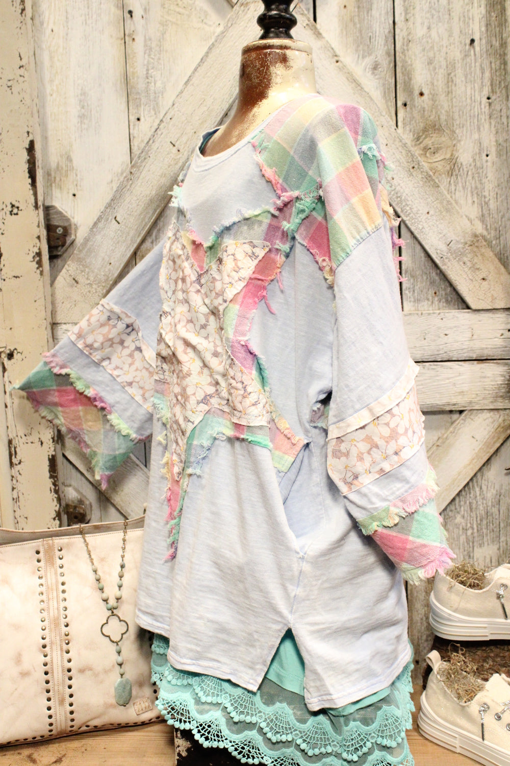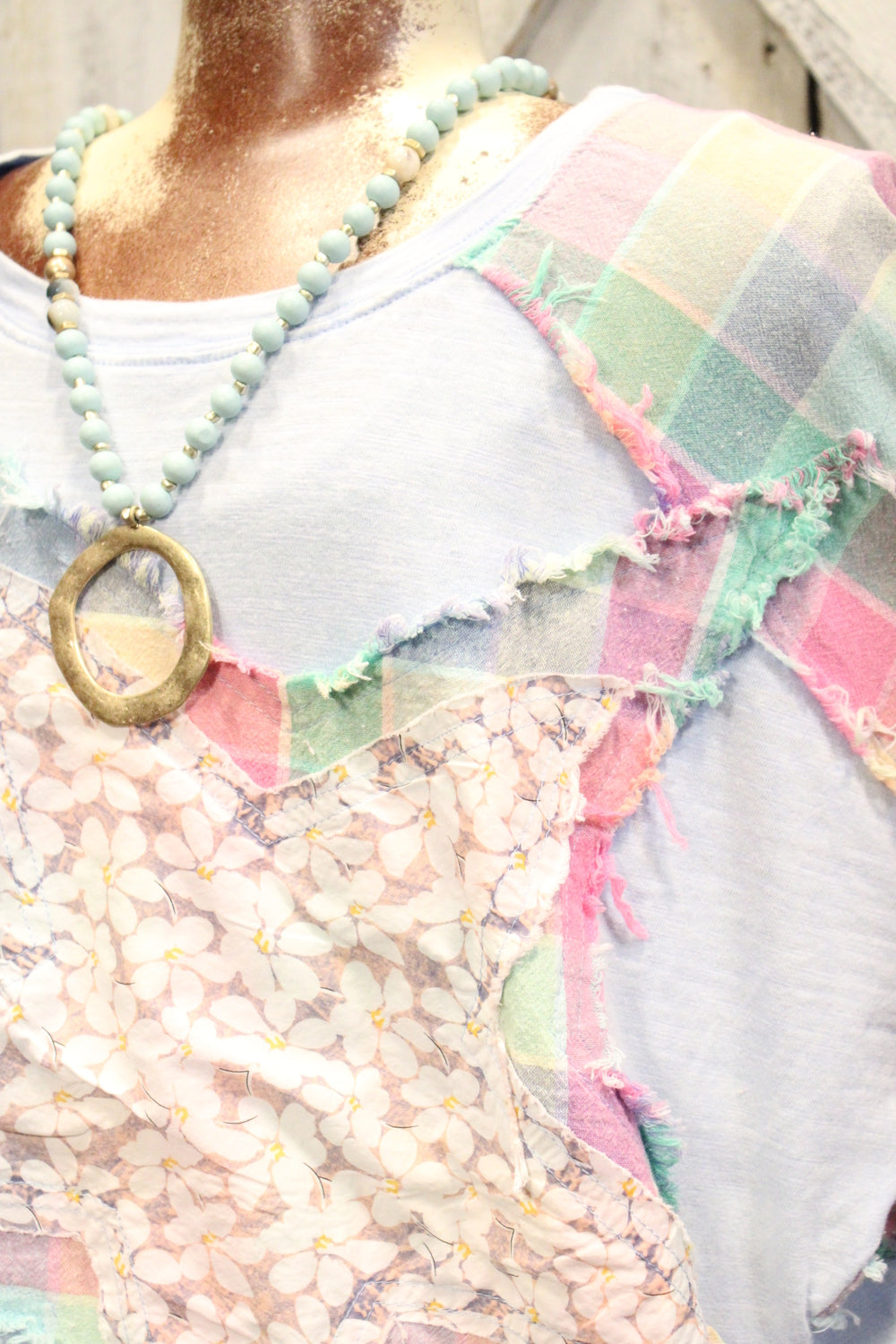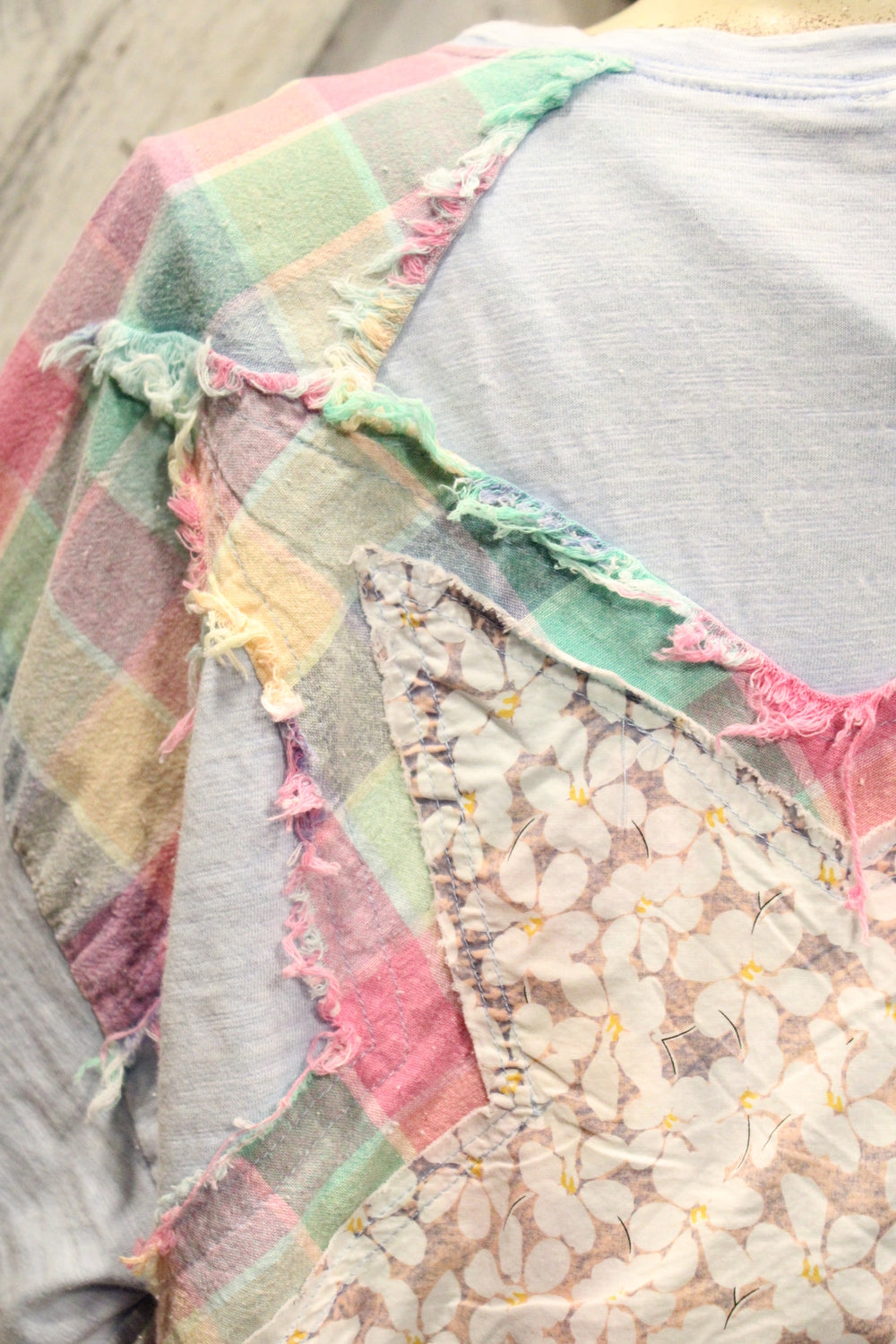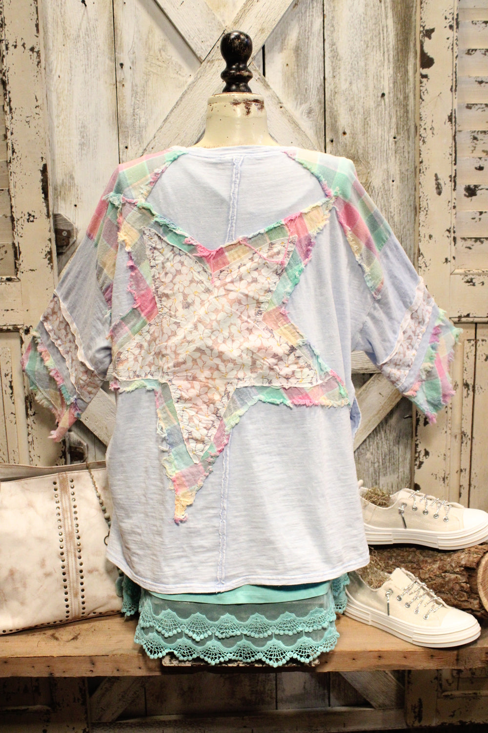 Introducing the Cosmic Cotton Casual – where comfort meets star-powered style. This relaxed-fit tunic features a soft, lightweight cotton fabric with a bold patchwork star front and center, crafted from pastel plaid and floral fabrics with raw, frayed edges for added texture. Whether you're headed to brunch, the market, or just embracing your inner daydreamer, this piece brings the perfect dose of whimsy and ease.