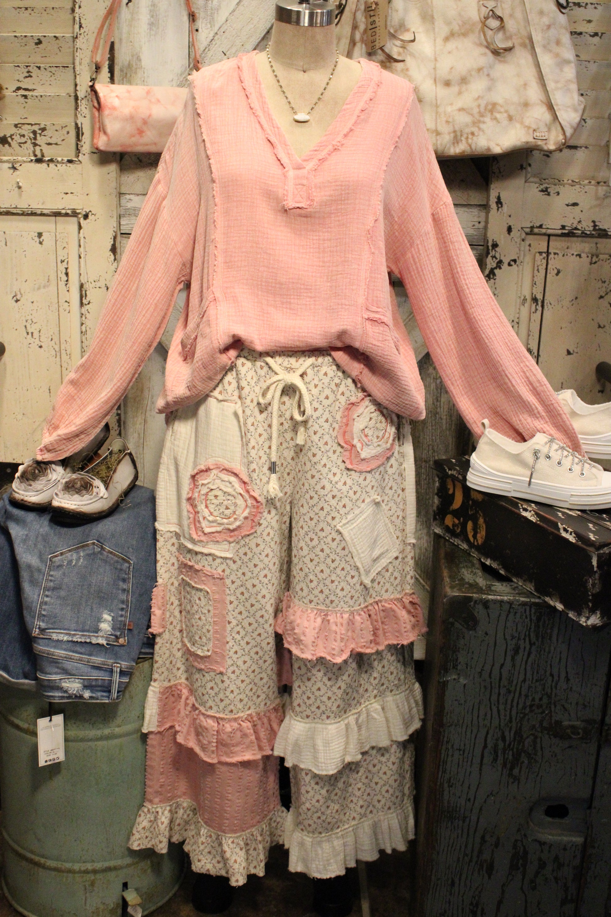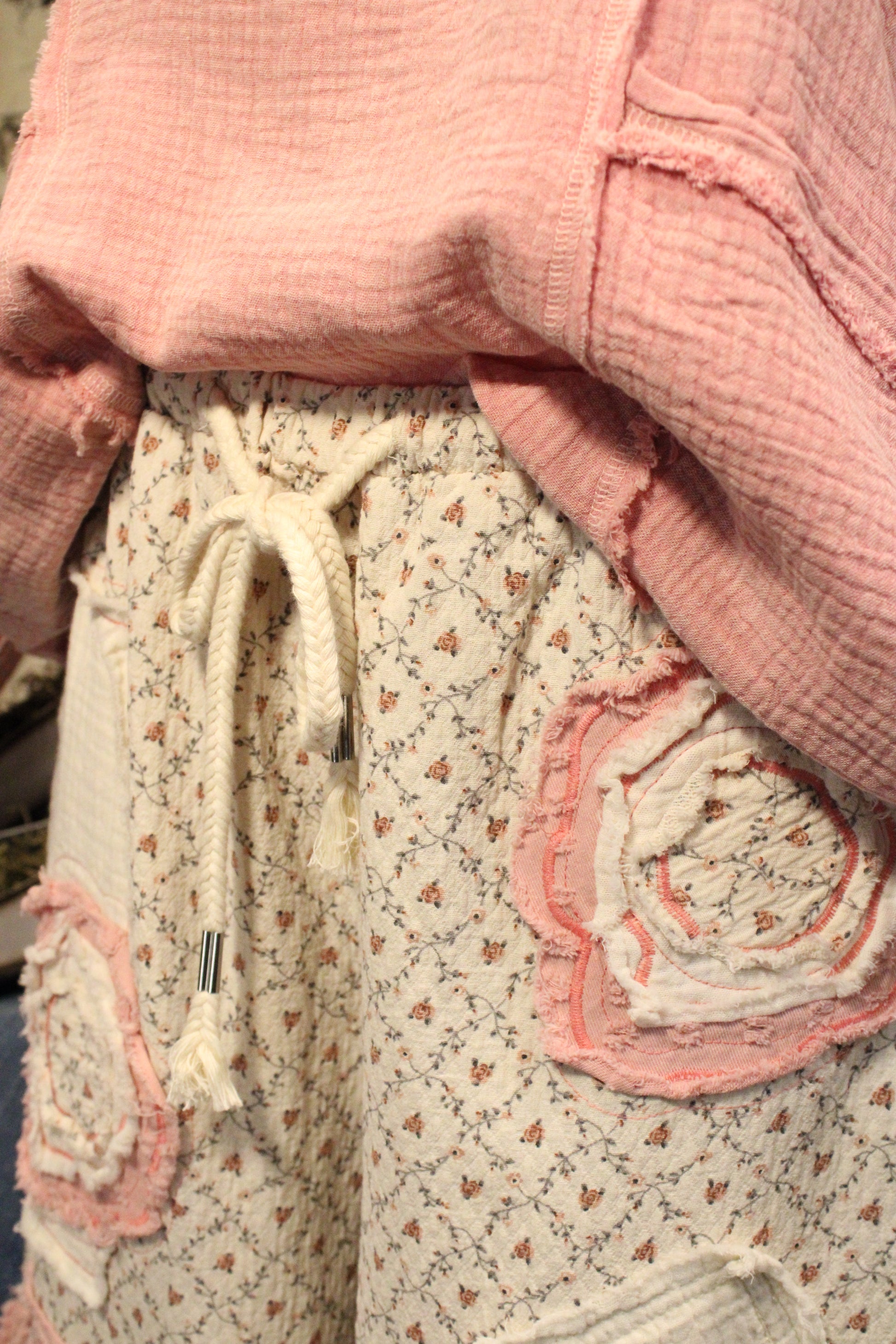 Crafted with soft mixed-print fabrics in darling creams and pinks, this pair features patchwork florals, raw-edge appliqués, fluttery ruffle tiers, and charming contrast panels that make every angle a little work of art. The relaxed wide-leg fit and elastic/drawstring waist keep things comfy while the shabby-chic details give them that vintage cottage-core magic.