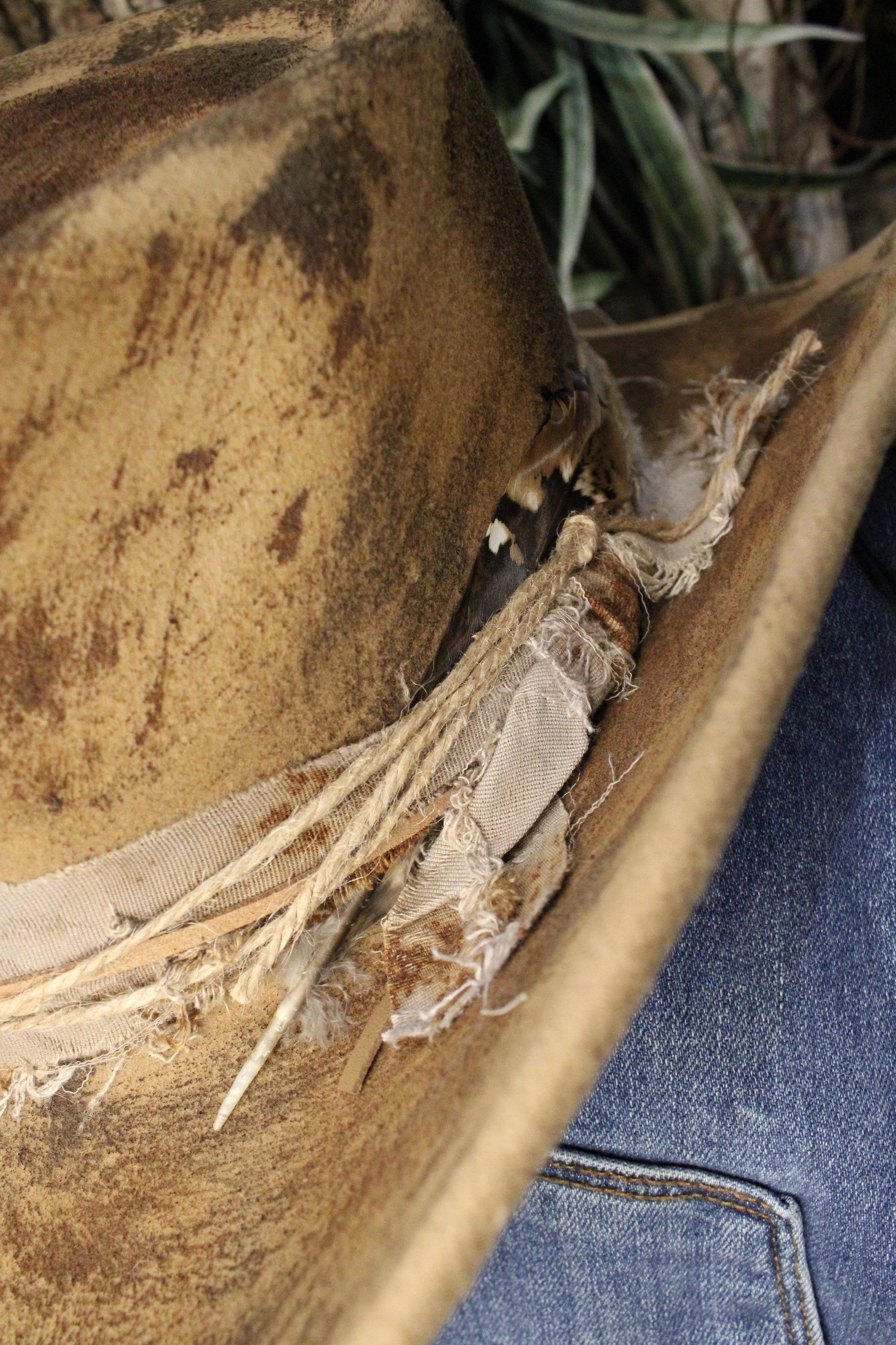 A soft, earthy tan base is brushed with rich, desert-inspired distressing that gives it an authentic, lived-in character. The frayed band—layered with worn ribbon, twine, and a hint of feather detail—adds an artisanal, rough-around-the-edges charm that feels straight out of an old Western film.