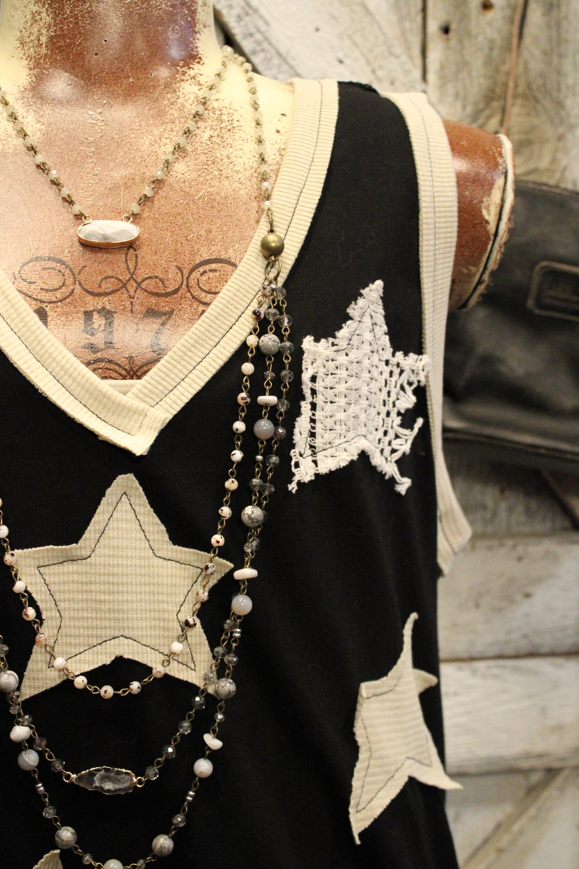 Introducing the Cream Constellation Tank- This black star patchwork tank is full of personality with a perfect mix of boho charm and everyday wearability. Designed with a flattering V-neckline and a relaxed, easy fit, it features mixed fabric star appliqués throughout for a fun, handcrafted look. The contrast trim along the neckline and armholes adds a subtle pop of detail, making this piece stand out while still being easy to style.