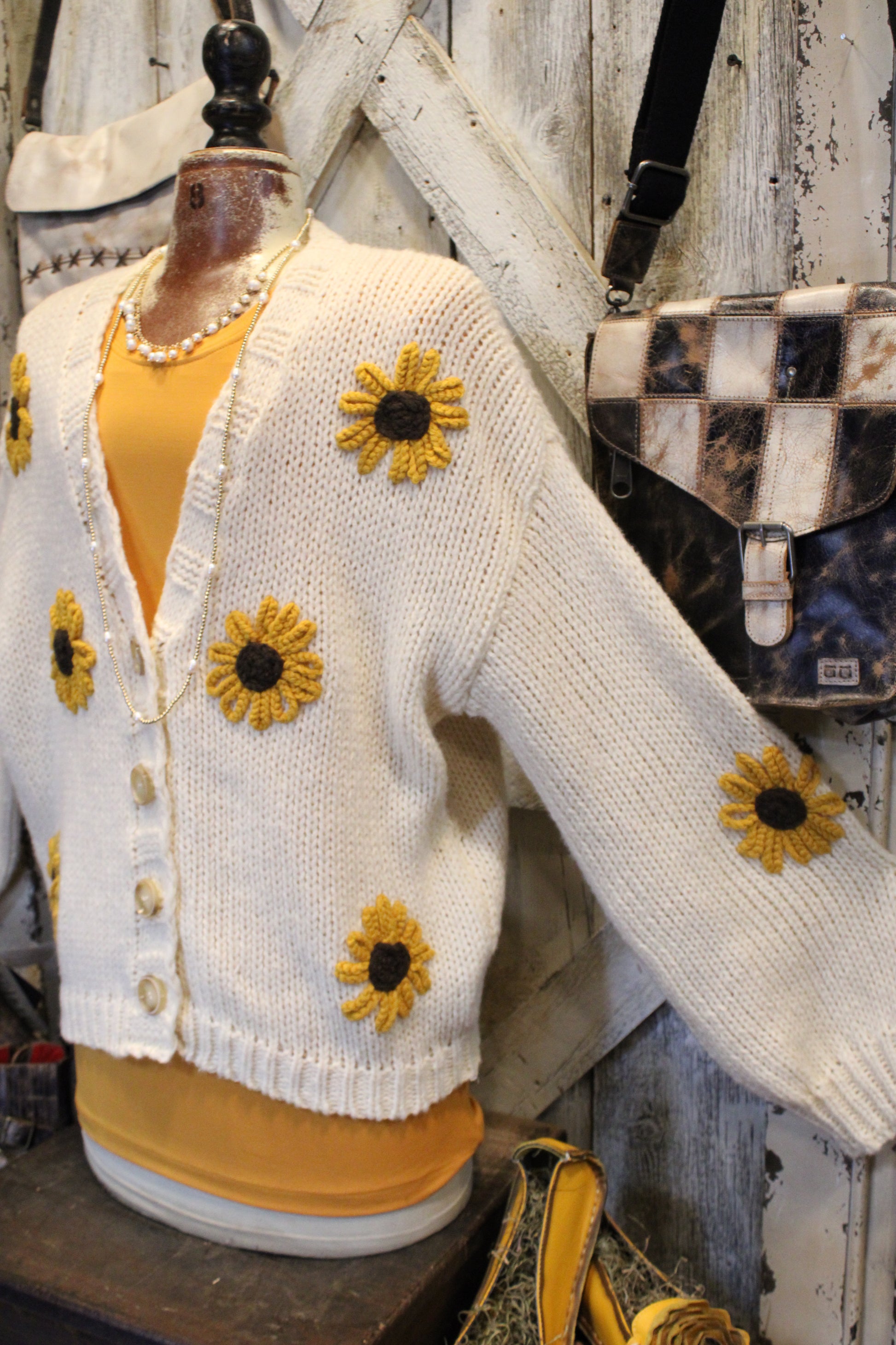 Introducing our Cream Sunflower Cardigan- This cozy knit features a cream base adorned with cheerful sunflower accents that add the perfect pop of warmth and charm. The relaxed fit, button-front design, and soft feel make it a comfy favorite you’ll reach for all season long.