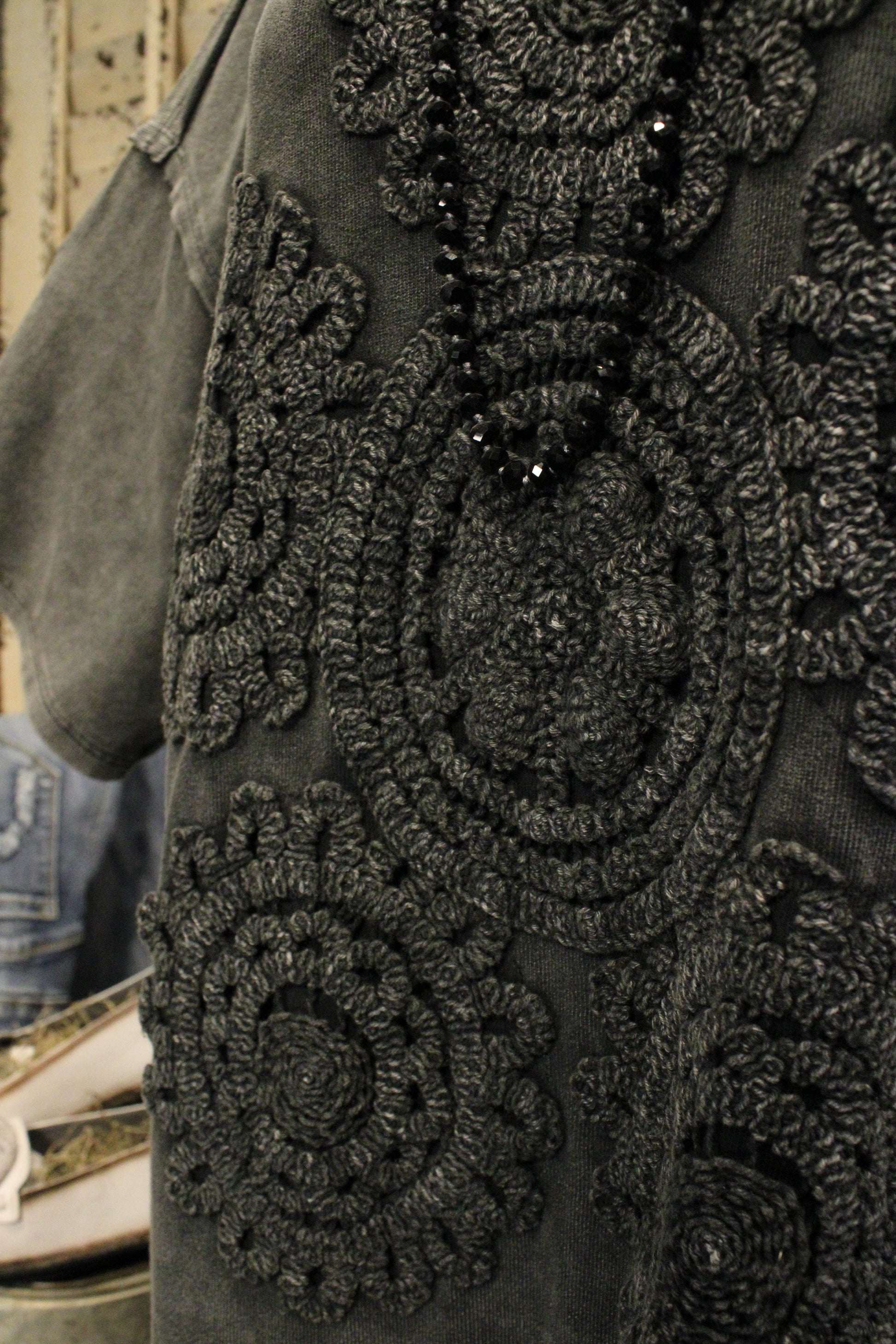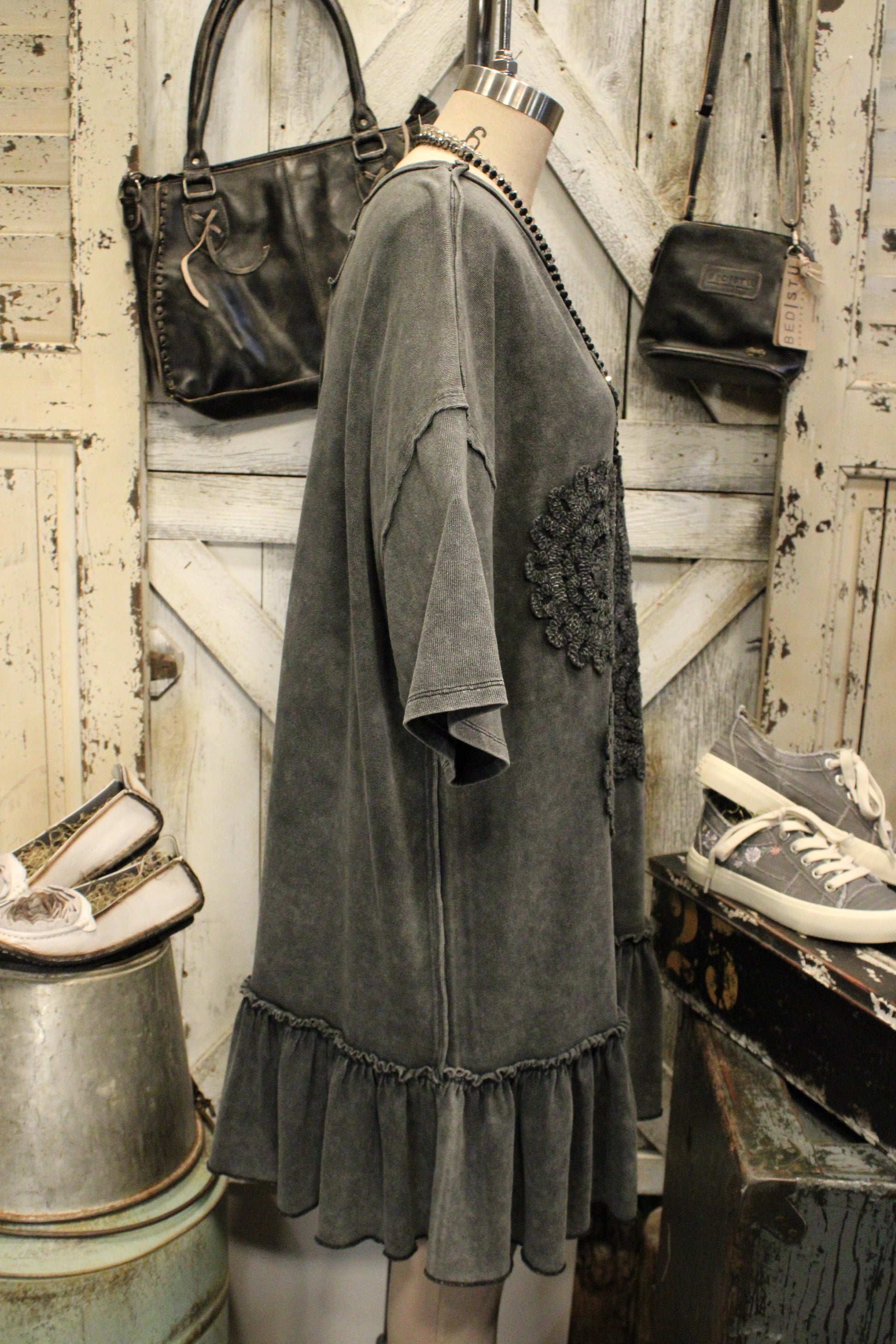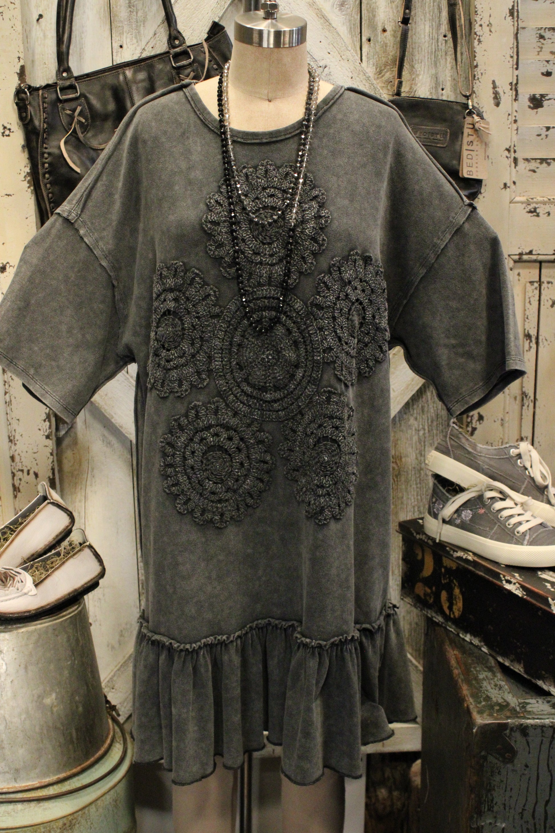 Introducing the Crochet Charm Ruffle Dress - This charcoal embroidered ruffle dress is easy, artsy, and full of laid-back charm. Designed with an oversized, relaxed silhouette, this dress features beautiful raised embroidery across the front that adds texture and a little wow without feeling fussy.