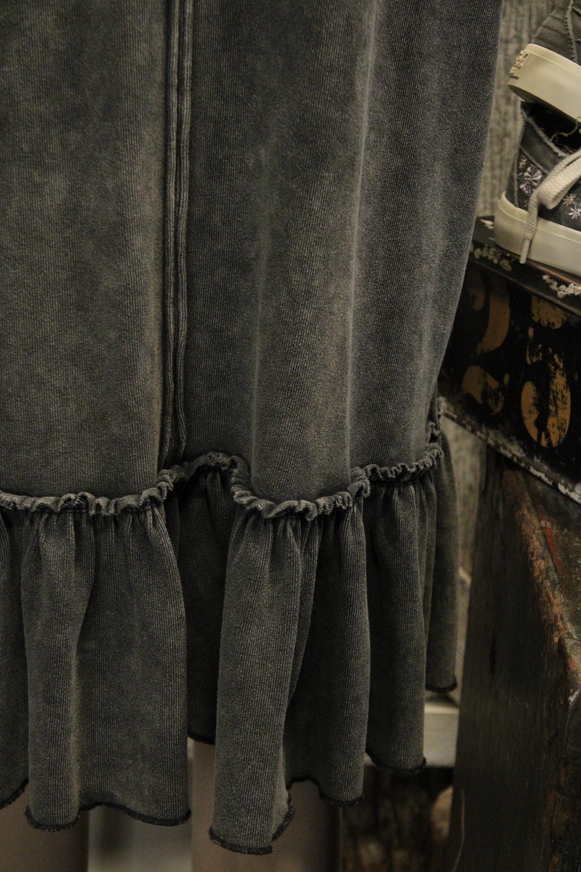 The soft, washed fabric gives it a cozy feel while the short sleeves and flouncy ruffle hem keep it playful and flattering. It’s one of those throw-on-and-go pieces that still feels special—perfect with boots, sneakers, or sandals depending on the season.