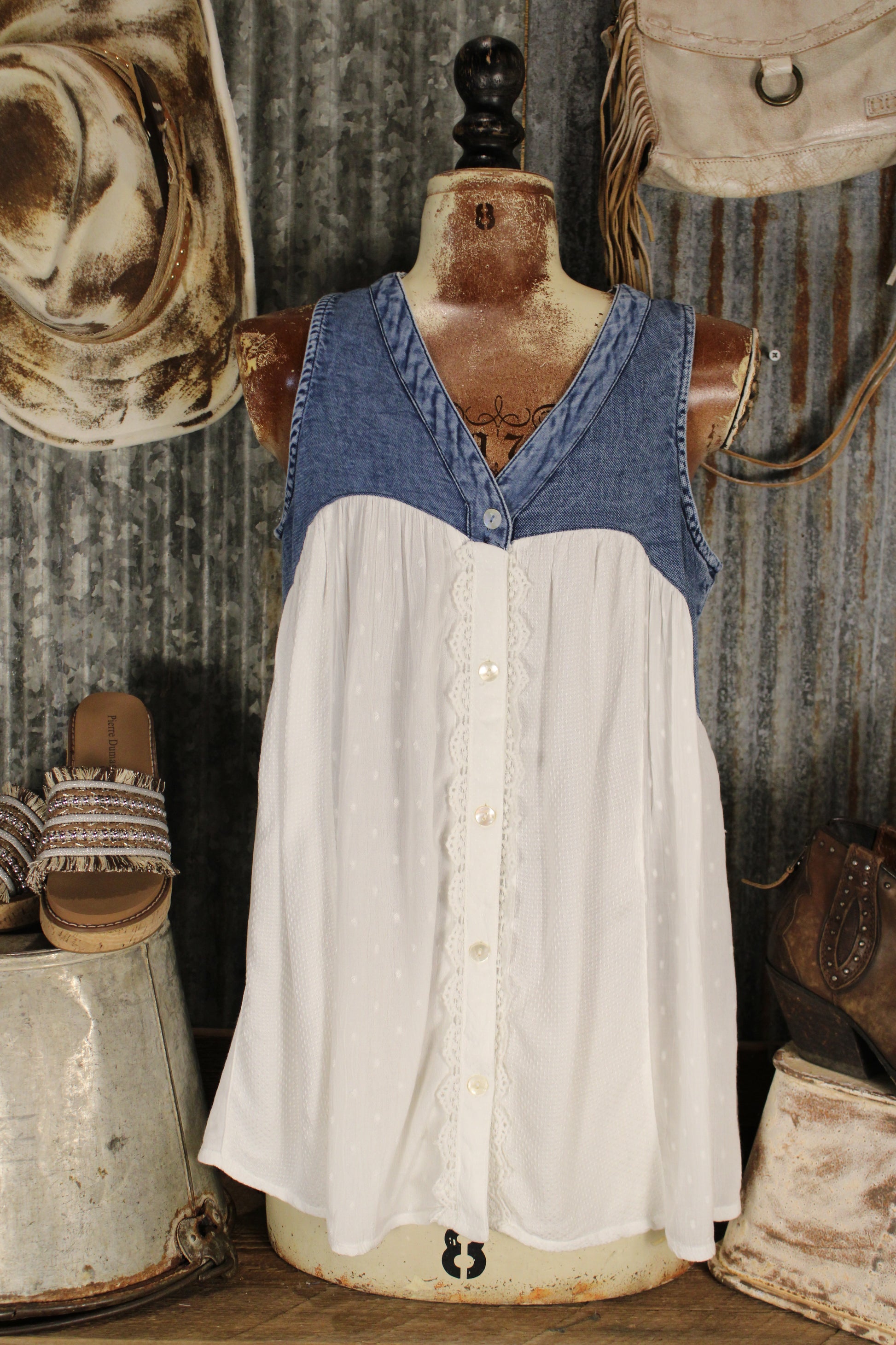 Introducing the Darling Denim Tank from Young Threads! This denim and lace tank top blends sweet detail with everyday comfort. Designed with a soft V-neckline and a denim yoke, this flowy sleeveless top features a lightweight textured white body with delicate lace trim along the button-front panel for a feminine touch.