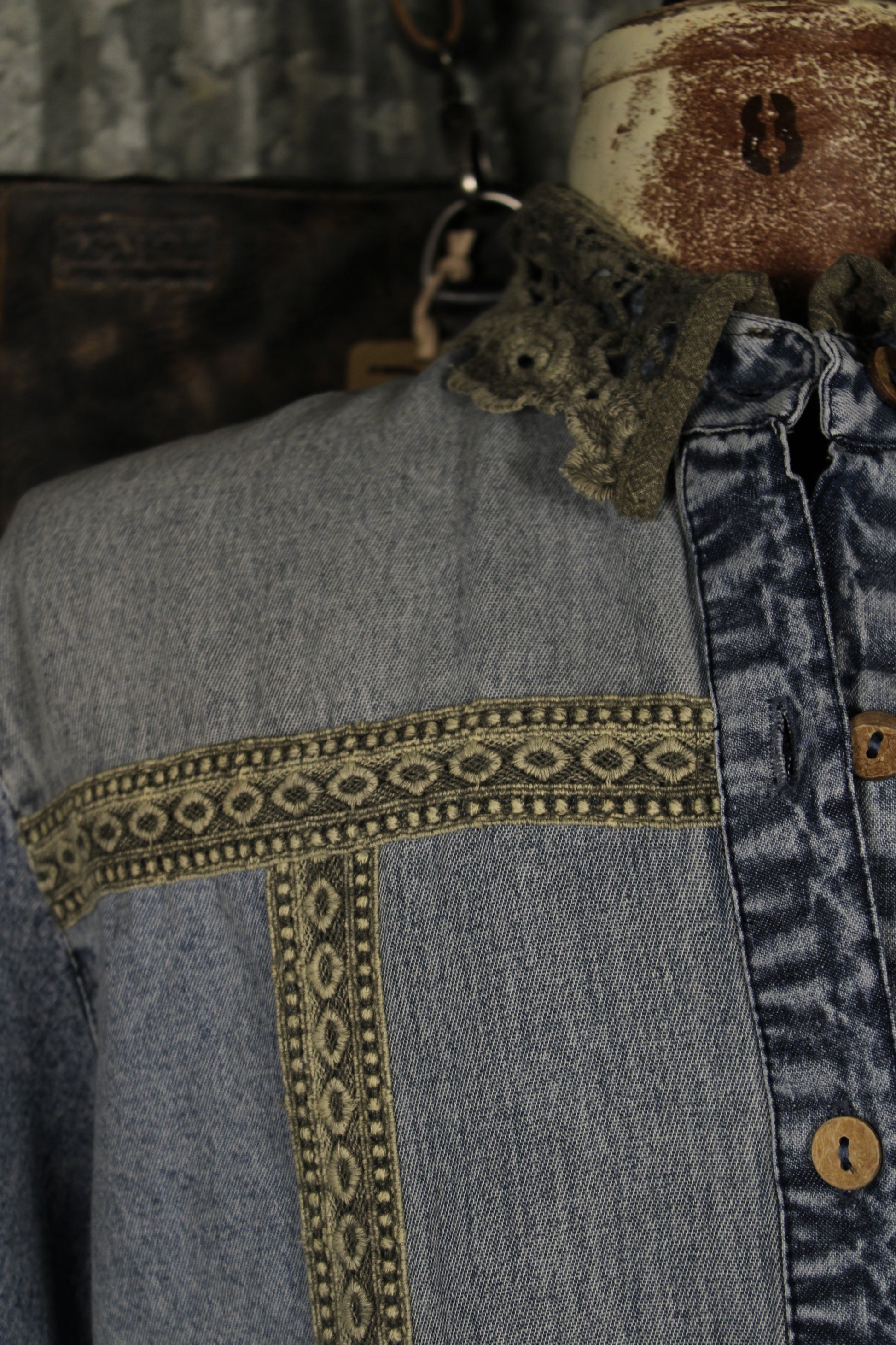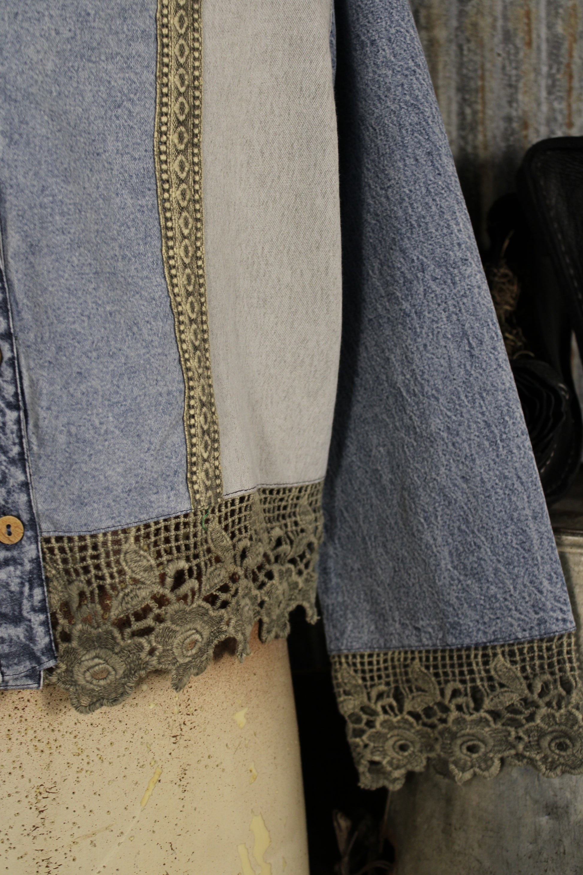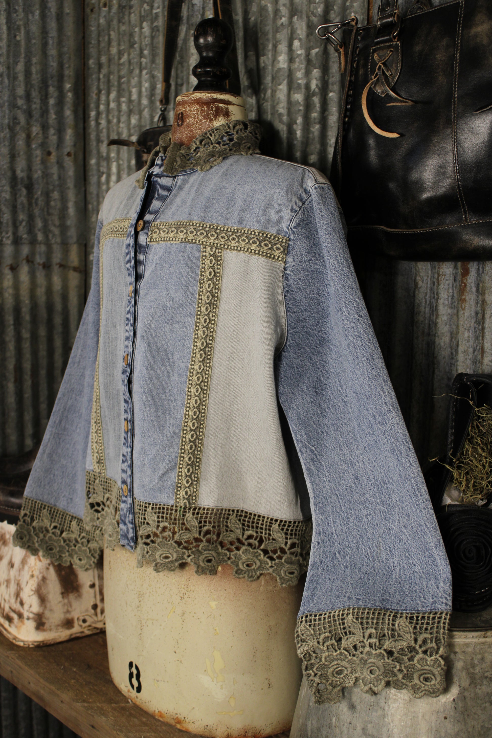 Introducing the Denim And Lace Aqua Top by Young Threads! A vintage-inspired statement with all the charm—this cropped denim top is full of beautiful detail. Featuring a mix of denim washes with intricate trim accents and a delicate lace collar, it blends rustic texture with feminine touches. The button-front design and cropped silhouette make it perfect for pairing with high-rise denim or layering over dresses. Finished with lace trim along the hem and sleeves, this piece brings a unique, farm girl flair to any outfit.