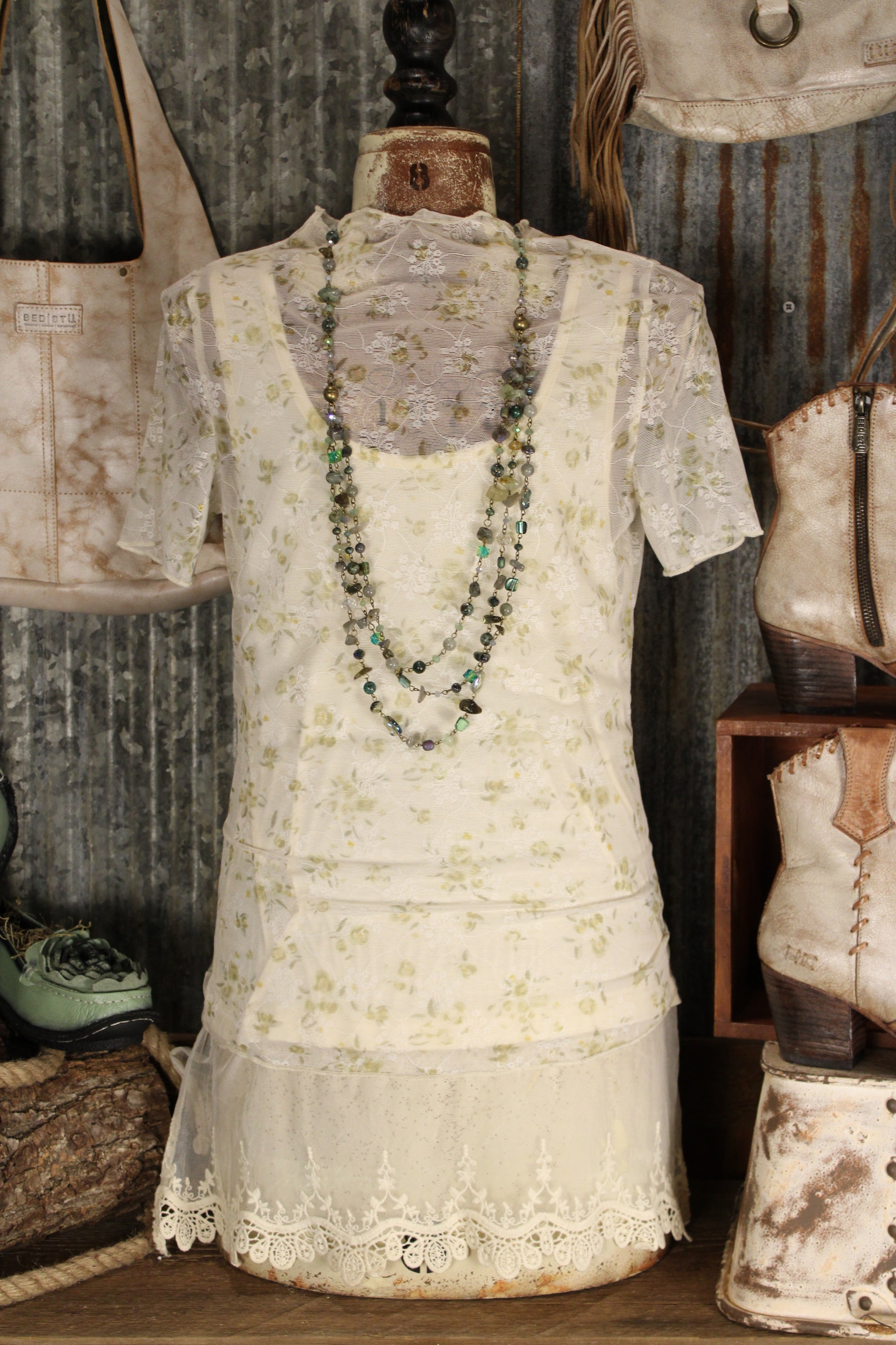 Introducing the Desert Bloom Mesh Blouse-This sheer floral mesh top is the prettiest layering piece for adding a soft, romantic touch to any outfit. Designed with delicate embroidered flowers in muted sage and cream tones, it features a lightweight stretch mesh, short sleeves, and a high neckline for an easy, flattering fit. Perfect for wearing under graphic tees, dresses, or jumpsuits, this feminine mesh top adds texture and vintage-inspired charm while still feeling modern and effortless.