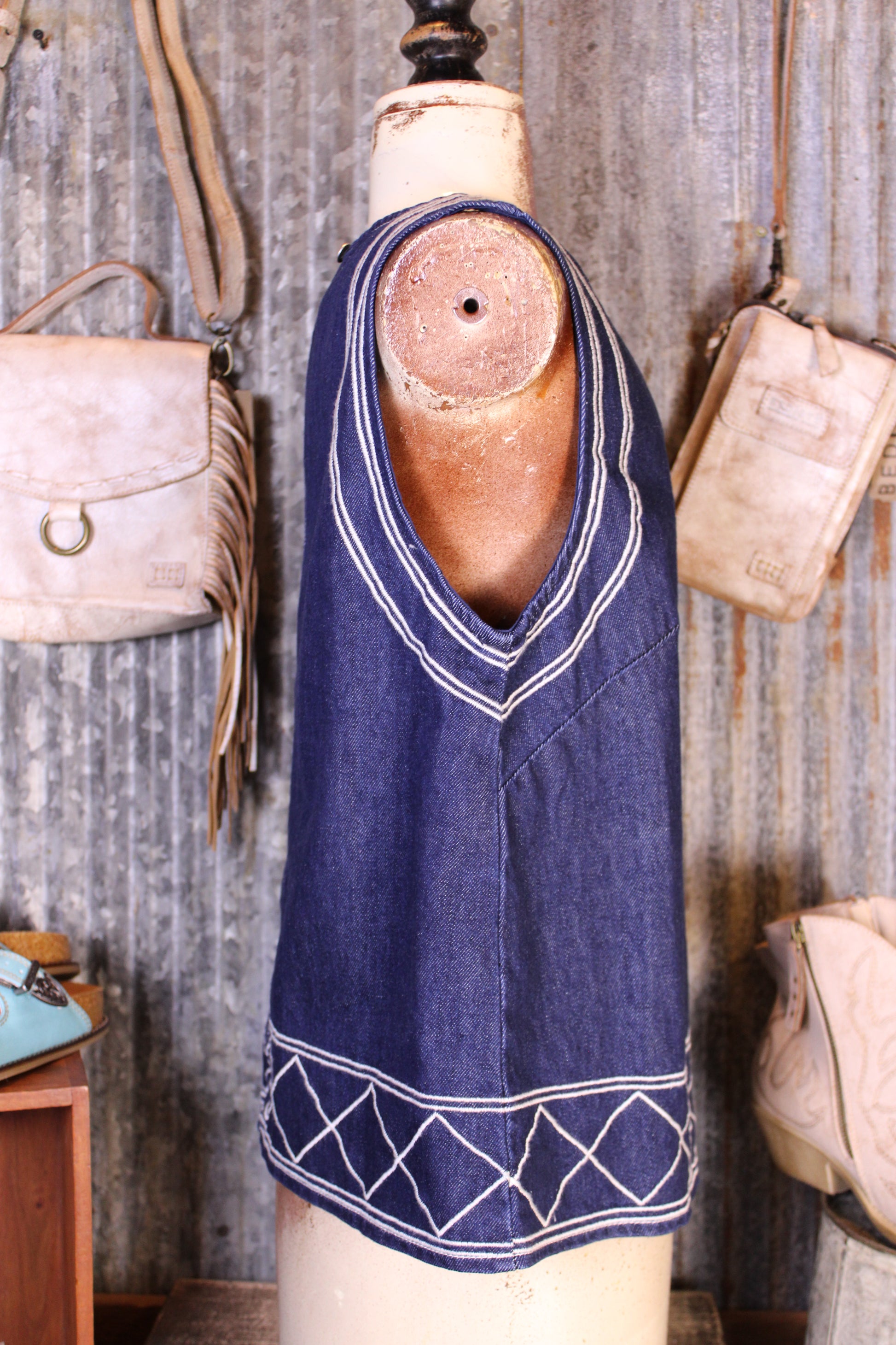 Add a touch of bohemian elegance to your wardrobe with our Desert Dreamer Top! Easy, breezy, and full of charm—this denim tank top is made for effortless styling. Featuring a relaxed fit with contrast stitching and a subtle geometric detail along the hem, it brings just the right amount of personality to a classic look.