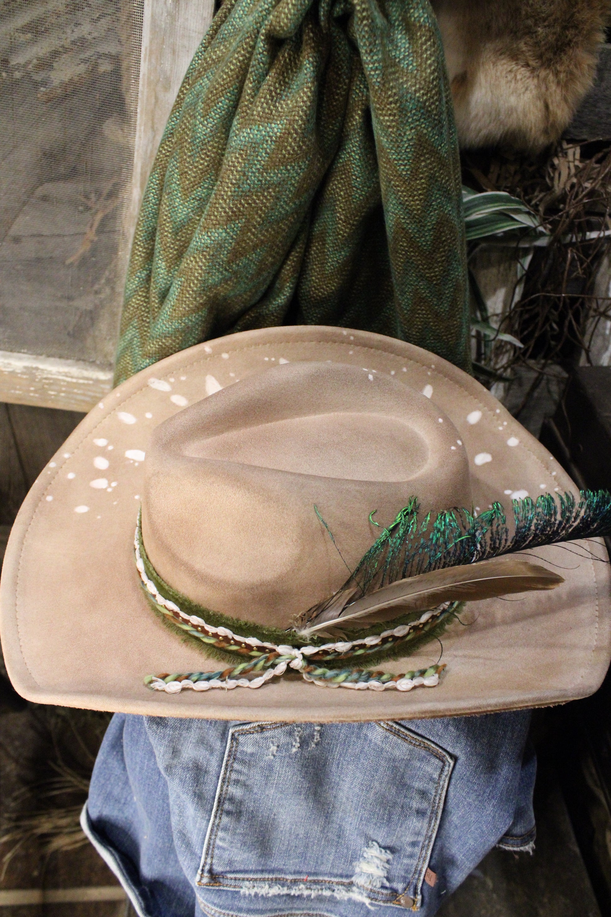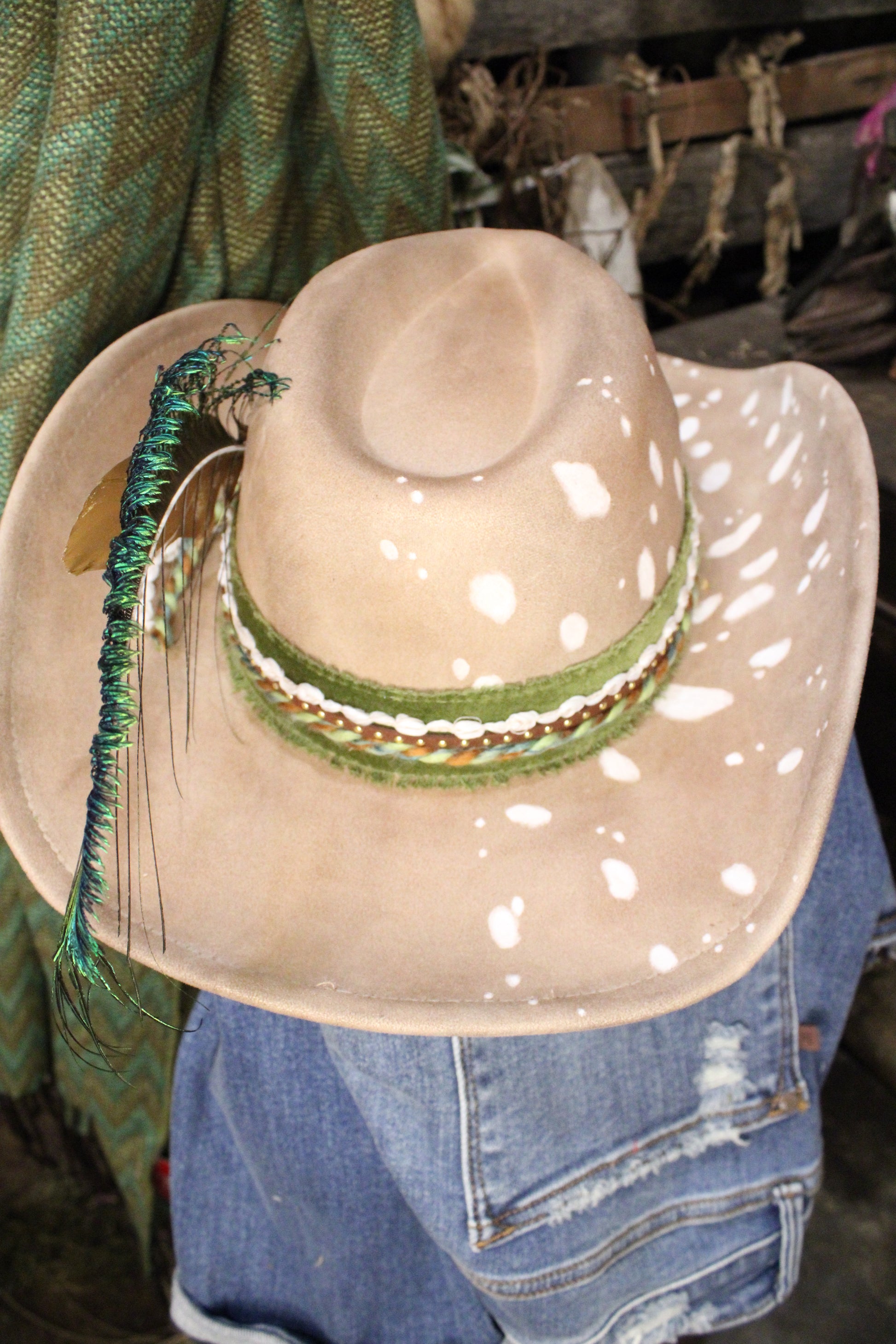 The hatband is custom, hand done with layered green felt, braided details, studded accents, and feather trim, giving it a bold western edge with just the right amount of detail. This hat is one of a kind.