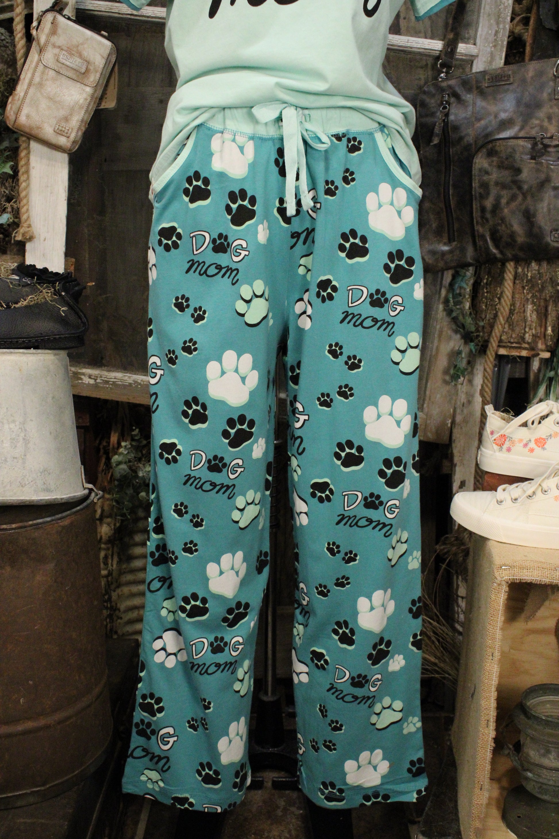 Introducing our cozy and adorable Dog Mom Cotton Pajama Set- This adorable Dog Mom pajama set is made for cozy nights, lazy mornings, and plenty of pup snuggles. The short-sleeve tee features a playful “Dog Mom” graphic with a paw-print detail, perfectly paired with matching lounge pants covered in cute paw prints and dog-lovin’ accents.