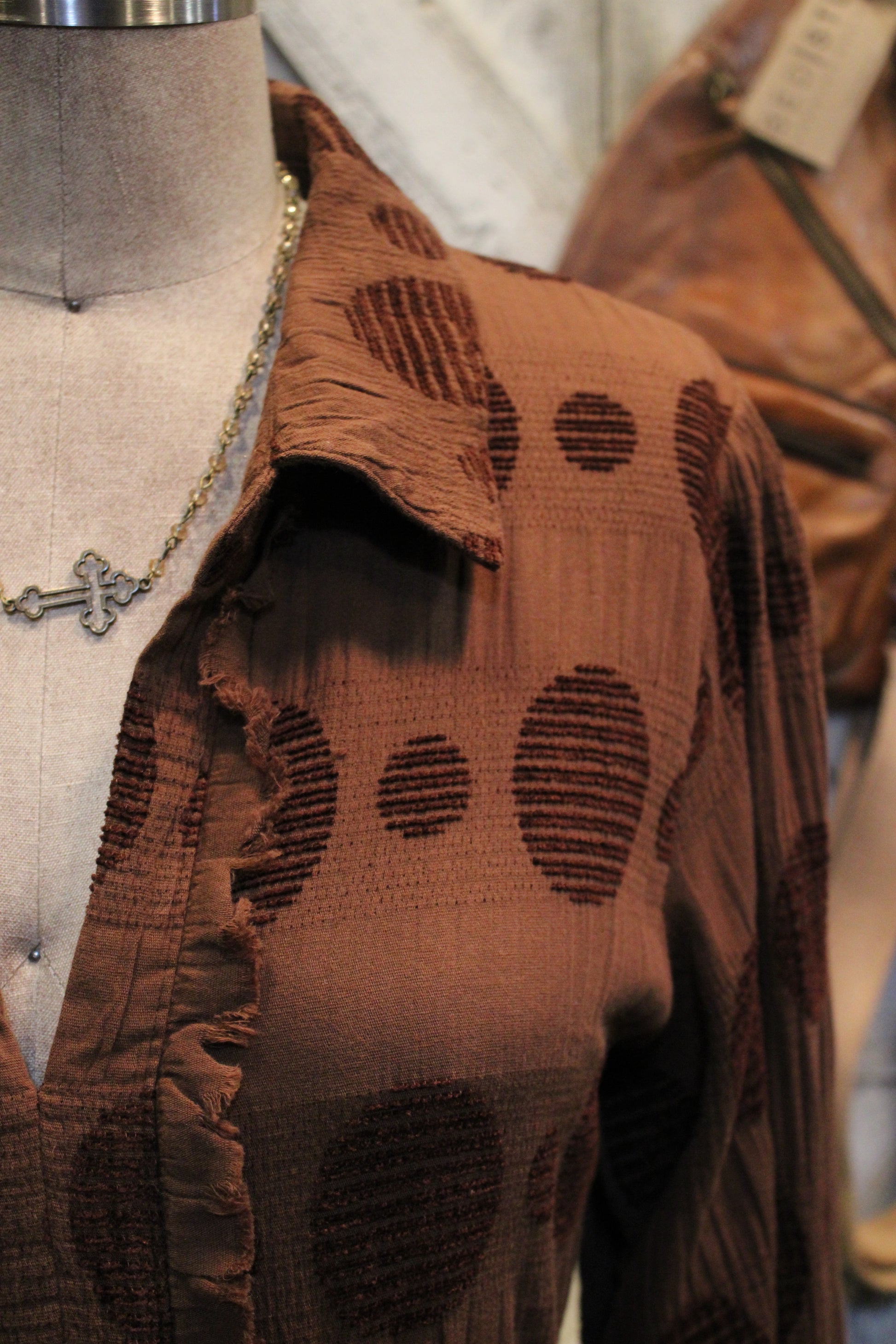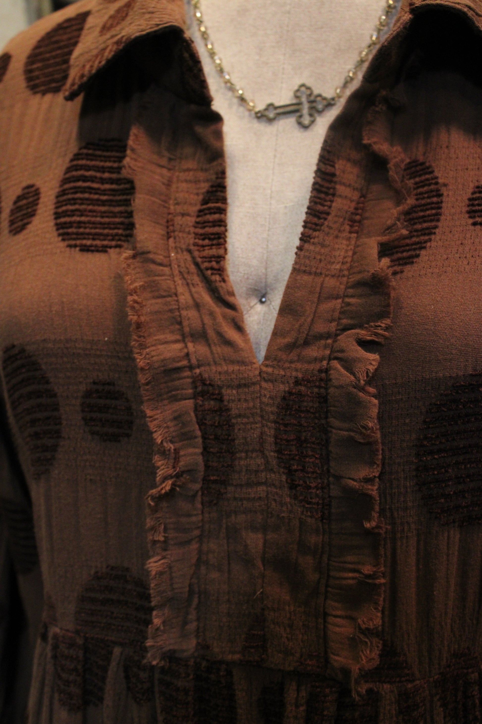 Introducing the charming Dot to Dot Chocolate Dress- This lightweight, flowy dress features a tiered silhouette that flatters every shape, with soft balloon sleeves and a playful dotted texture that gives it just the right touch of whimsy. The collared neckline with subtle ruffle detailing adds a hint of polish, making it easy to dress up with boots and jewelry or keep it casual with flats and a denim jacket.